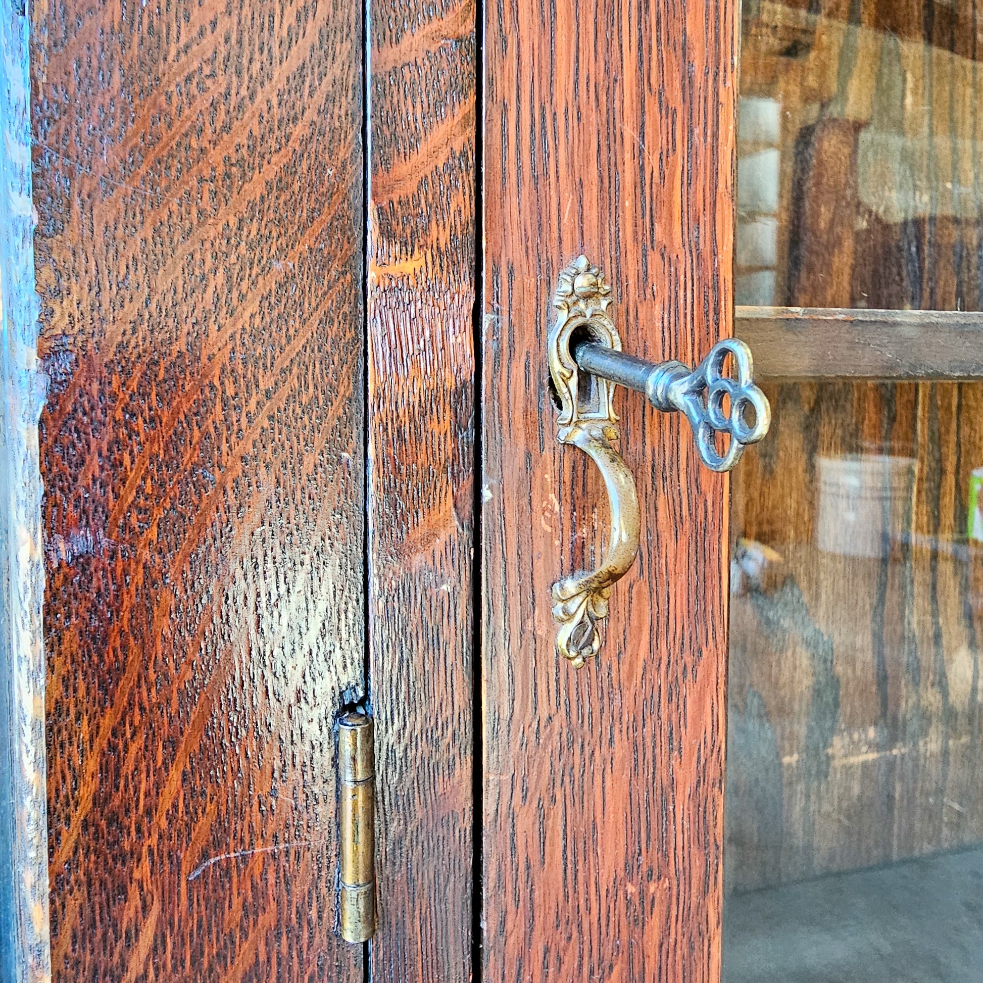 Beautiful antique glass-front cabinet with classic lines and rich wood tone. This piece features three front doors with glass panels and multiple adjustable shelves inside, making it perfect for displaying books, collectibles, or dishware.