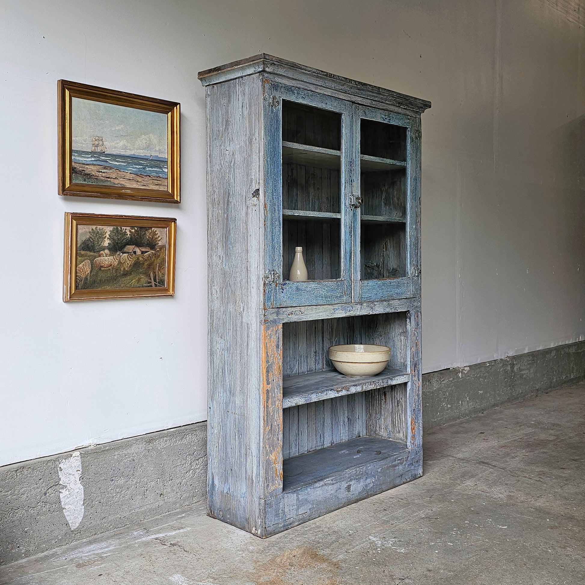 This charming antique cabinet features a rustic blue painted finish with beautifully weathered patina, showcasing layers of age and character. Crafted from solid wood with tongue and groove paneling throughout, it offers a classic design. Glass-front upper storage for display and an open lower shelving area for additional storage. The original glass panes and simple latch closure enhance its authentic farmhouse appeal.