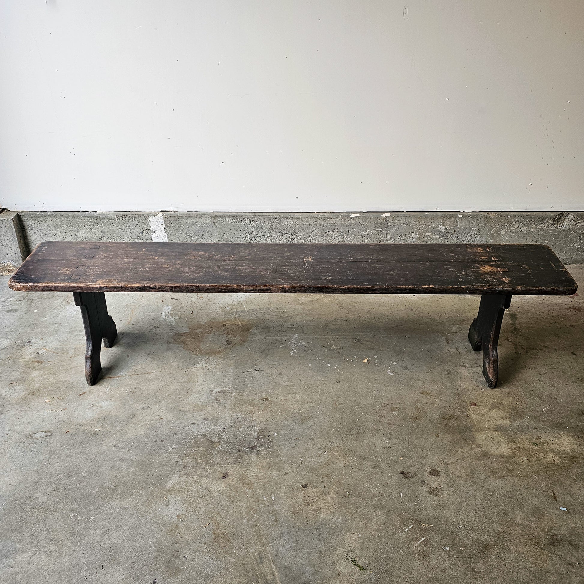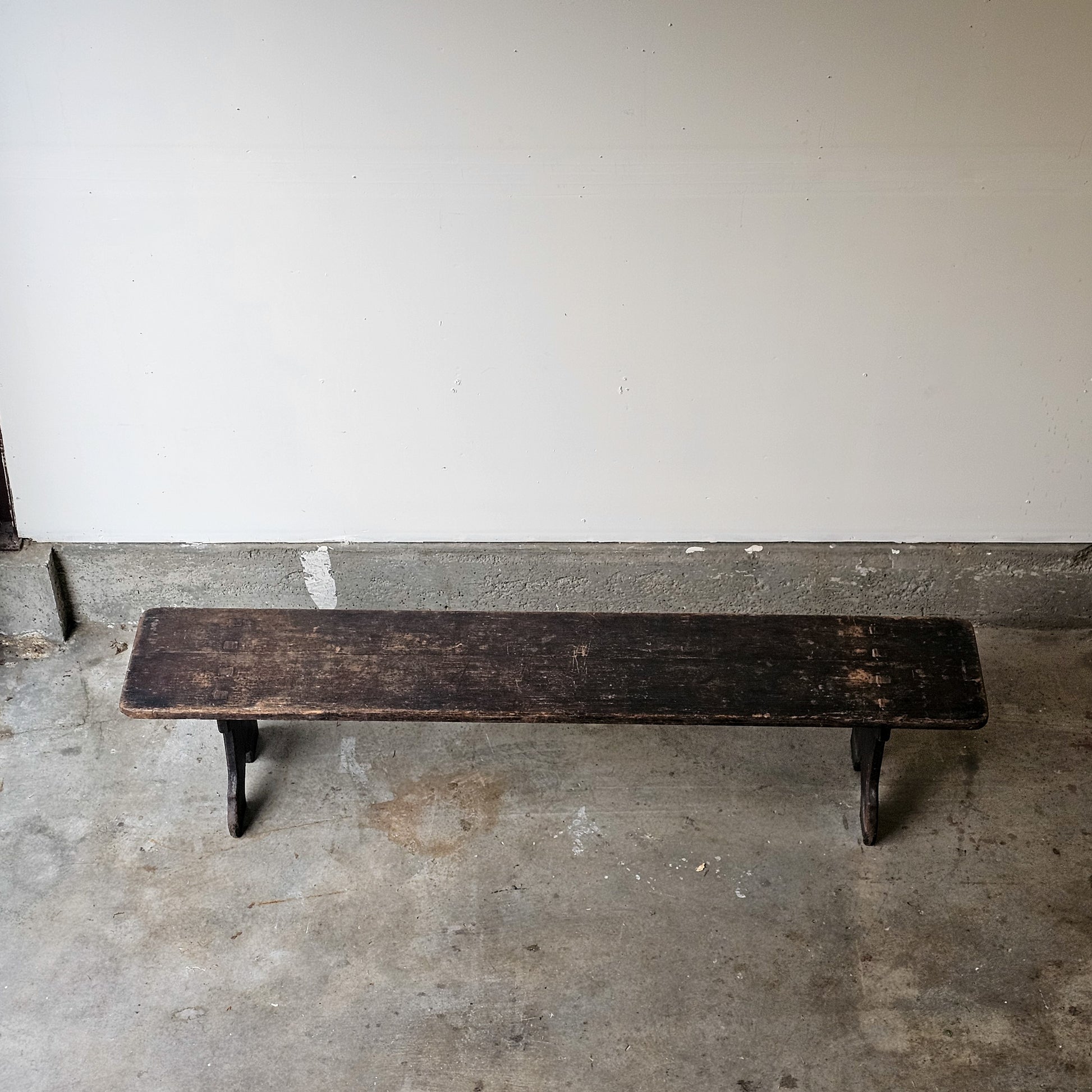 A beautiful antique English oak bench with a rich, darkened patina and sculptural cut-out legs—an old-world form that feels both simple and quietly striking. The long plank seat shows generations of wear: softened edges, deepened tones, and the textured surface that only true age can create.