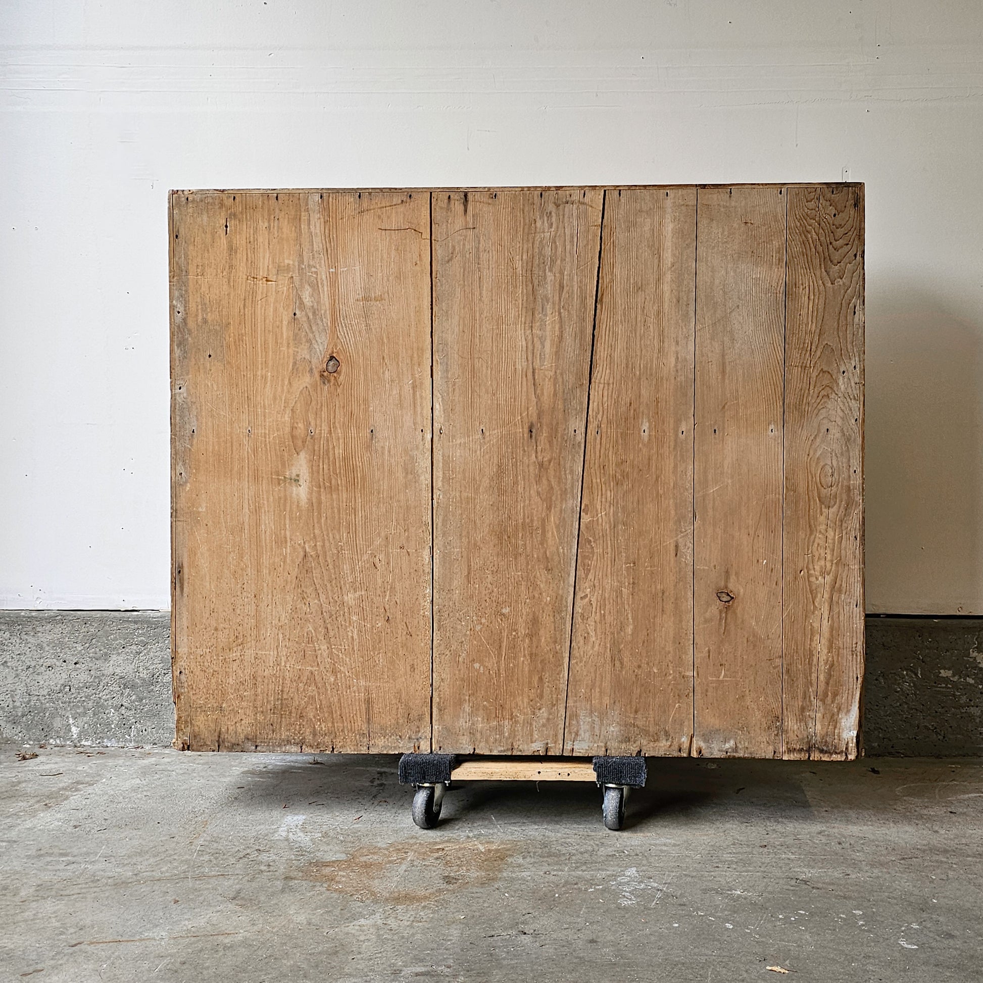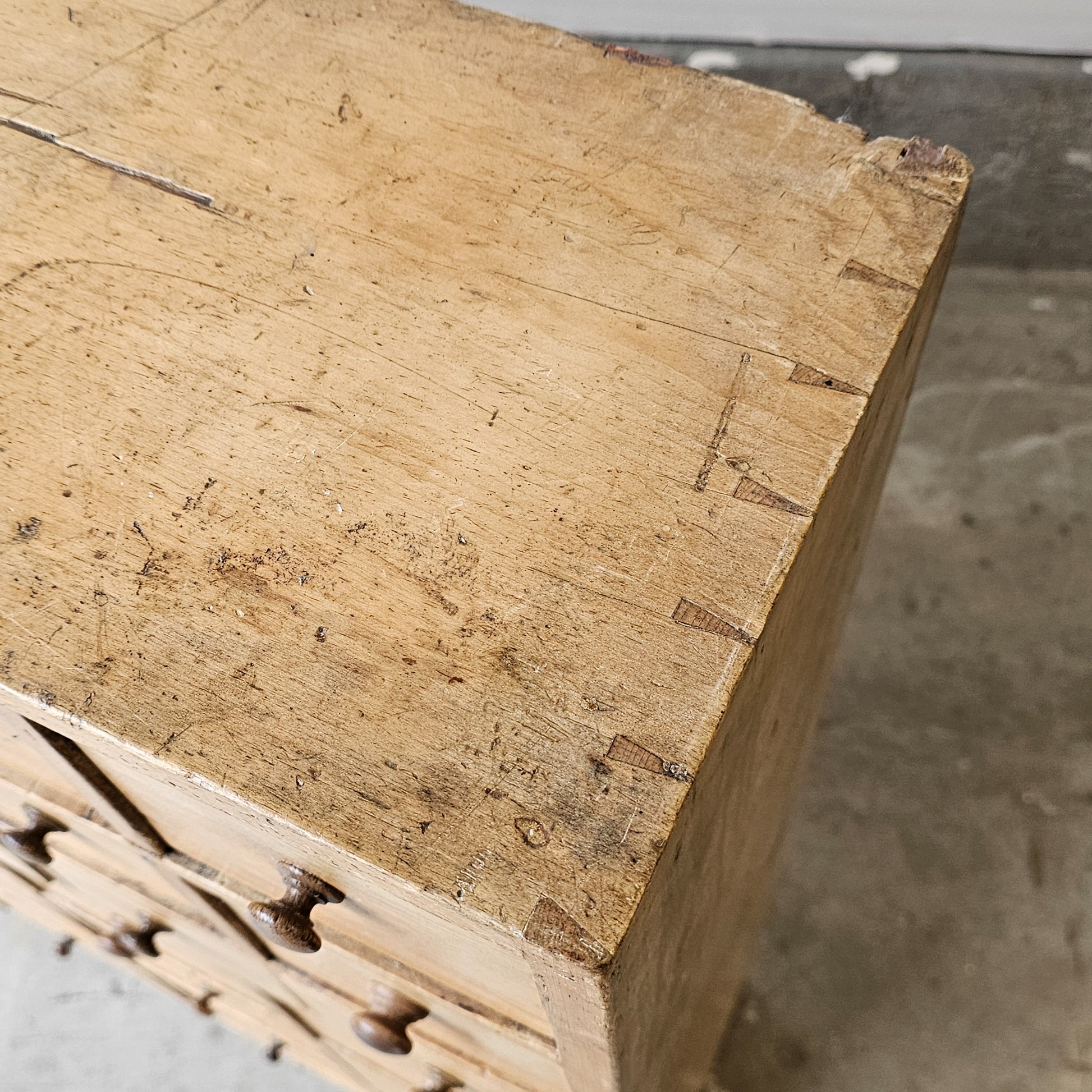 Every drawer is individually built and features its original turned wooden knob. The front surfaces show the honest marks, scratches, and softened edges of decades of handling, giving the whole piece a wonderfully textured, lived-in feel. The drawers themselves vary slightly in tone and wear, adding to the visual rhythm and personality of the cabinet.