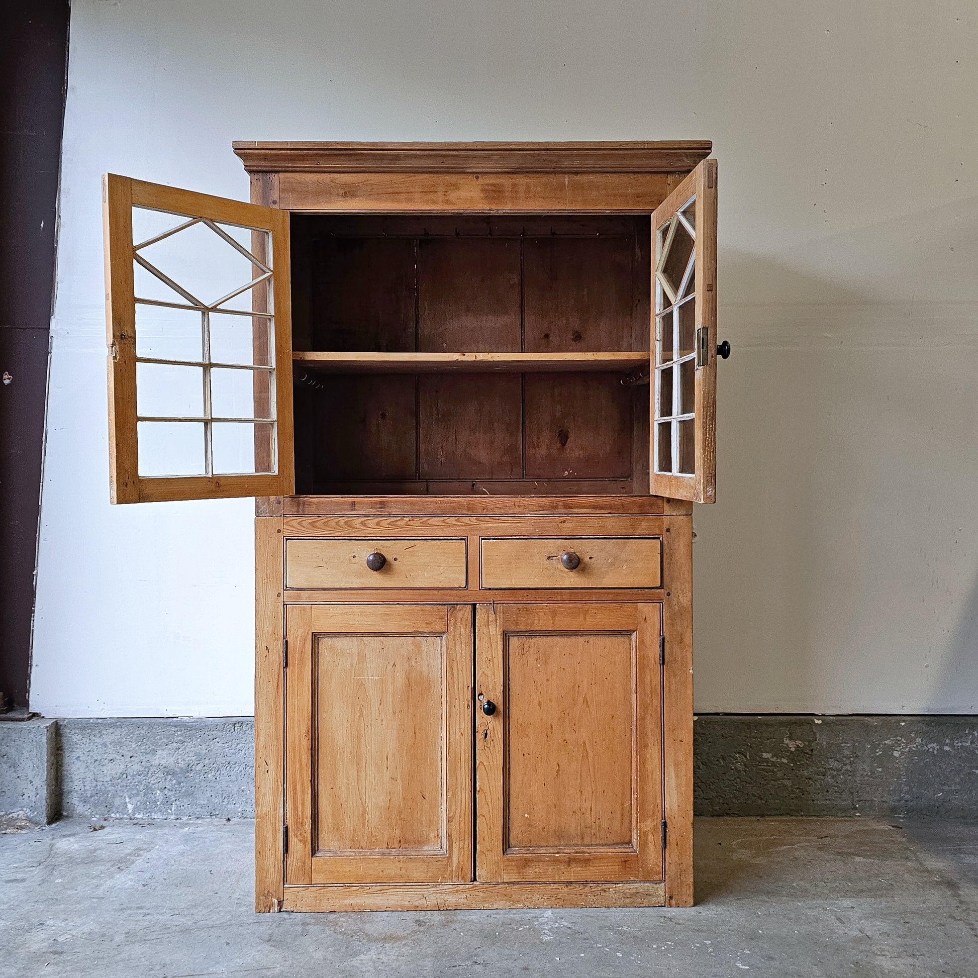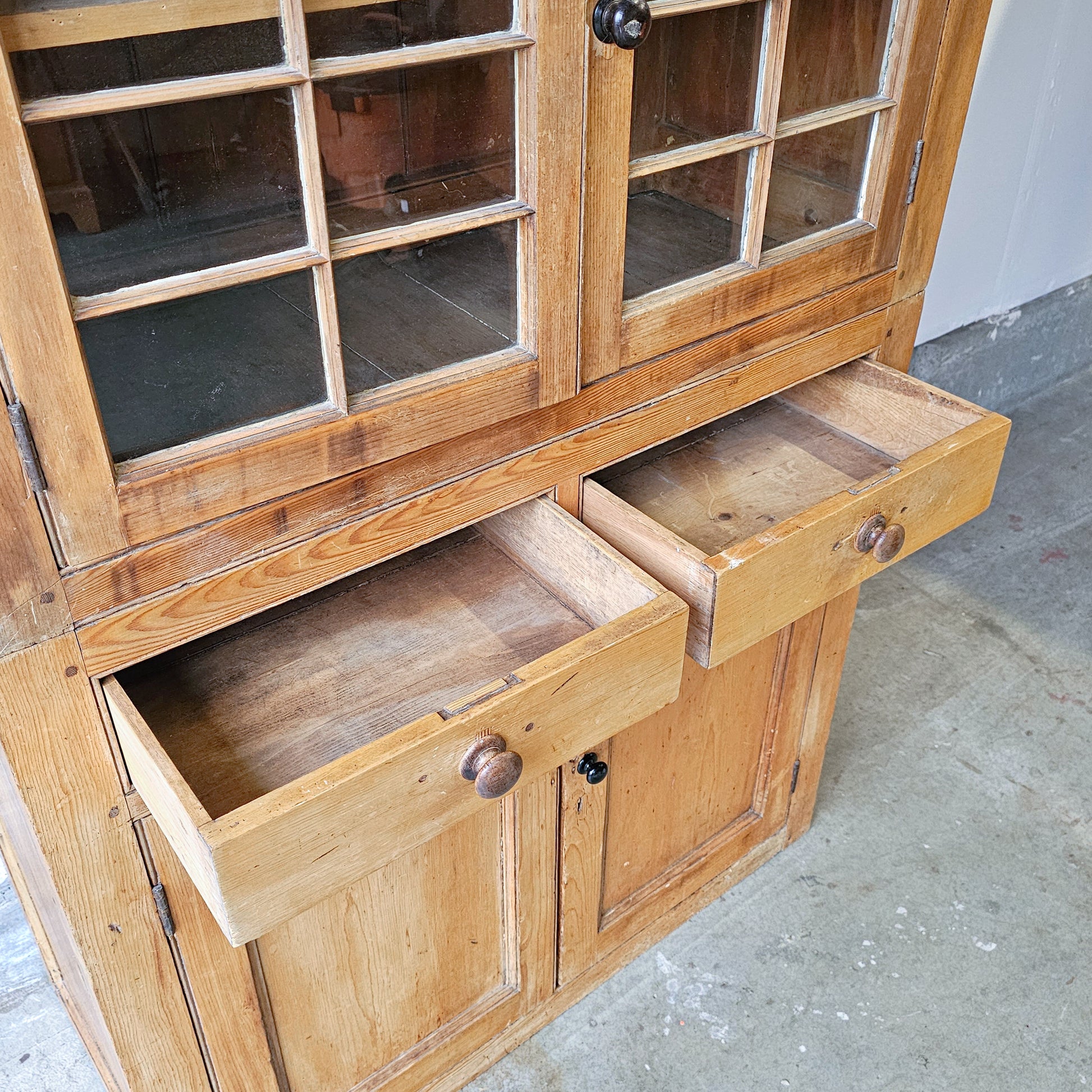 The upper cabinet features two glass-front doors with striking geometric mullions and a single stationary shelf, perfect for displaying ironstone, pottery, books, or collected pieces. Below, two drawers with turned pine knobs offer easy-access storage, while the lower cupboard provides additional enclosed space with one interior shelf. This hutch separates into two pieces.