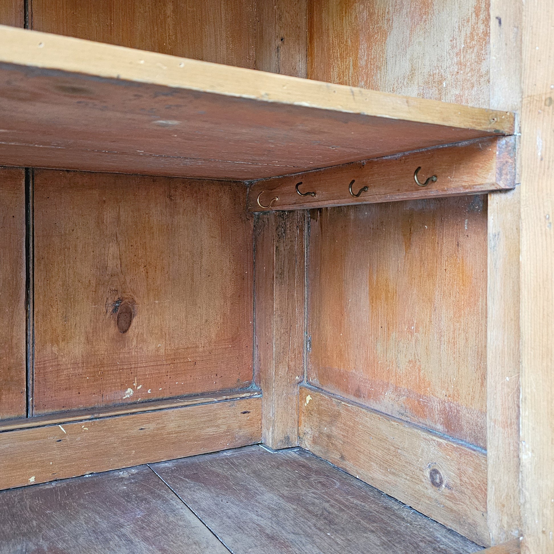 The pine has softened beautifully over time, showing a warm, natural sheen and subtle variations in tone. The interior retains its deeper aged patina, adding contrast and character. Gentle wear, old marks, and the honest imperfections of daily use all contribute to its charm. This is a true statement piece for kitchens, dining rooms, or living spaces needing both function and presence.