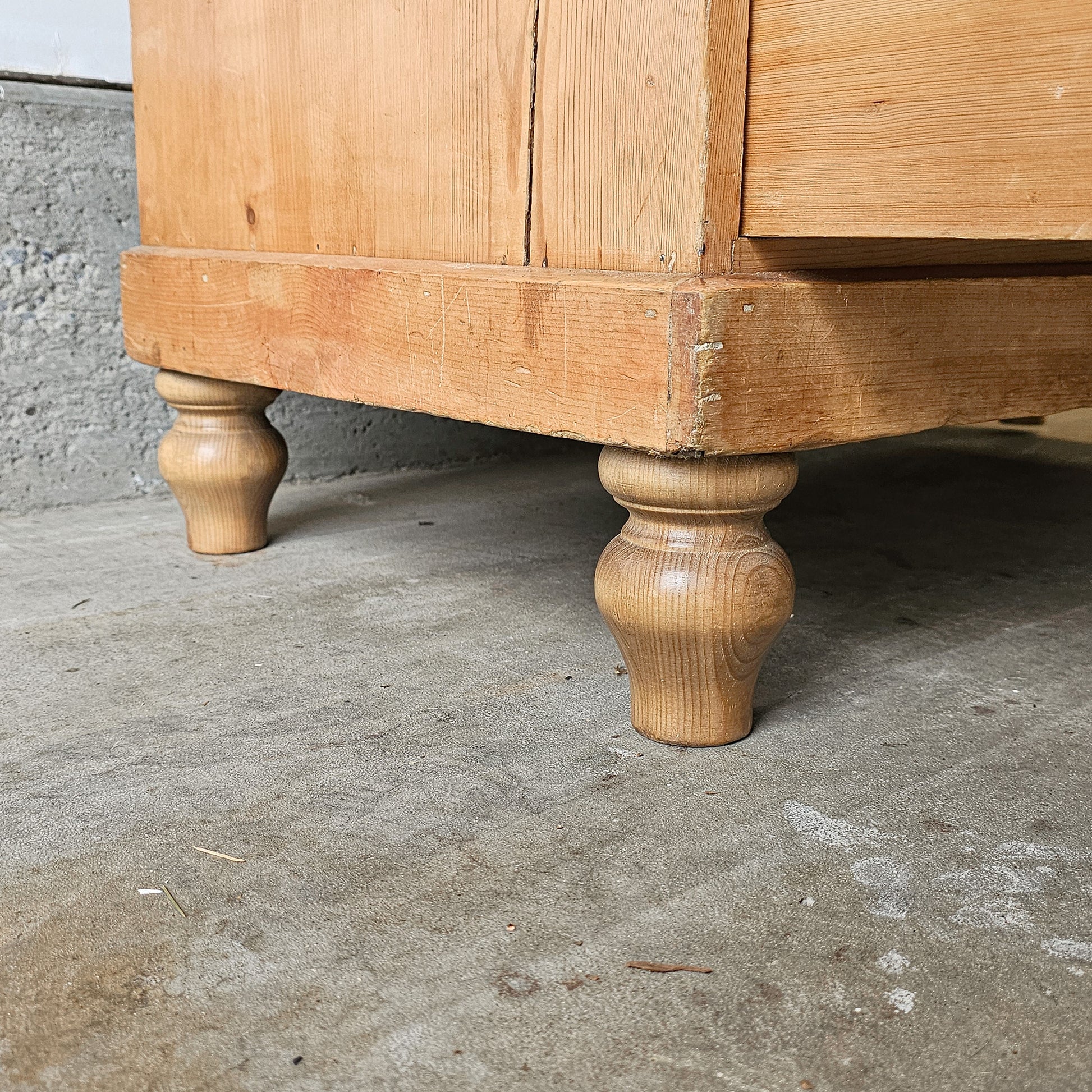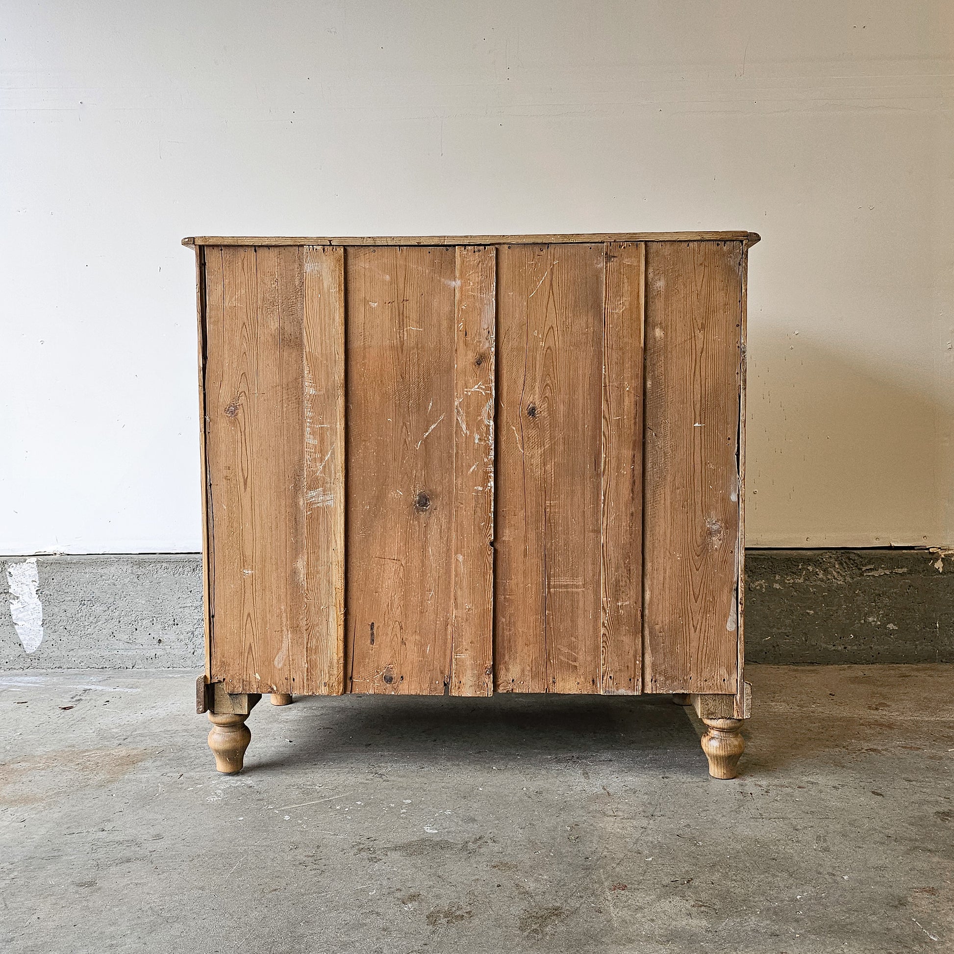 The pine has mellowed to a soft, honeyed tone, with natural knots, understated wear, and a smooth hand-rubbed surface that reflects more than 160 years of use. Resting on simple turned feet, the piece has a grounded, timeless silhouette that blends seamlessly into both traditional and contemporary interiors.