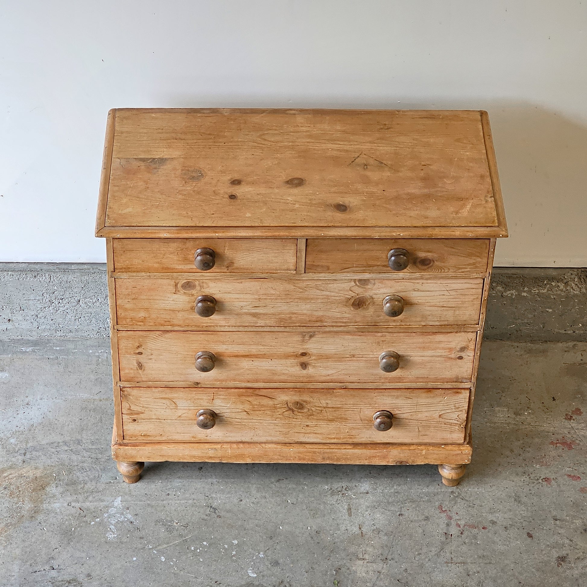 A lovely mid-19th century English pine chest, circa 1870, full of the gentle character that only time can give. Its classic configuration—two smaller top drawers over three full-width drawers—offers practical storage while keeping the proportions beautifully balanced. Each drawer retains its original turned wooden knobs and charming keyholes, subtle details that speak to its age and authenticity.
