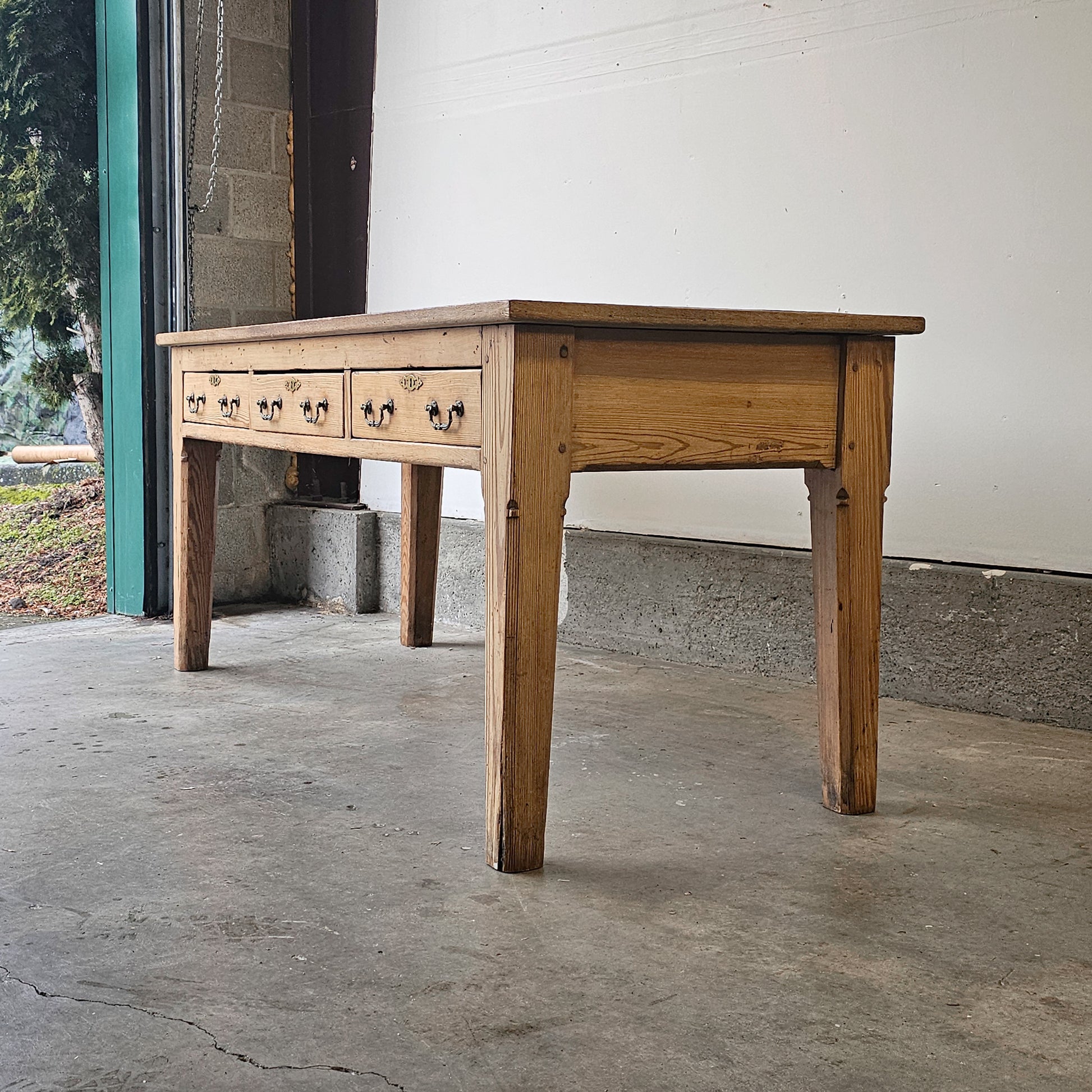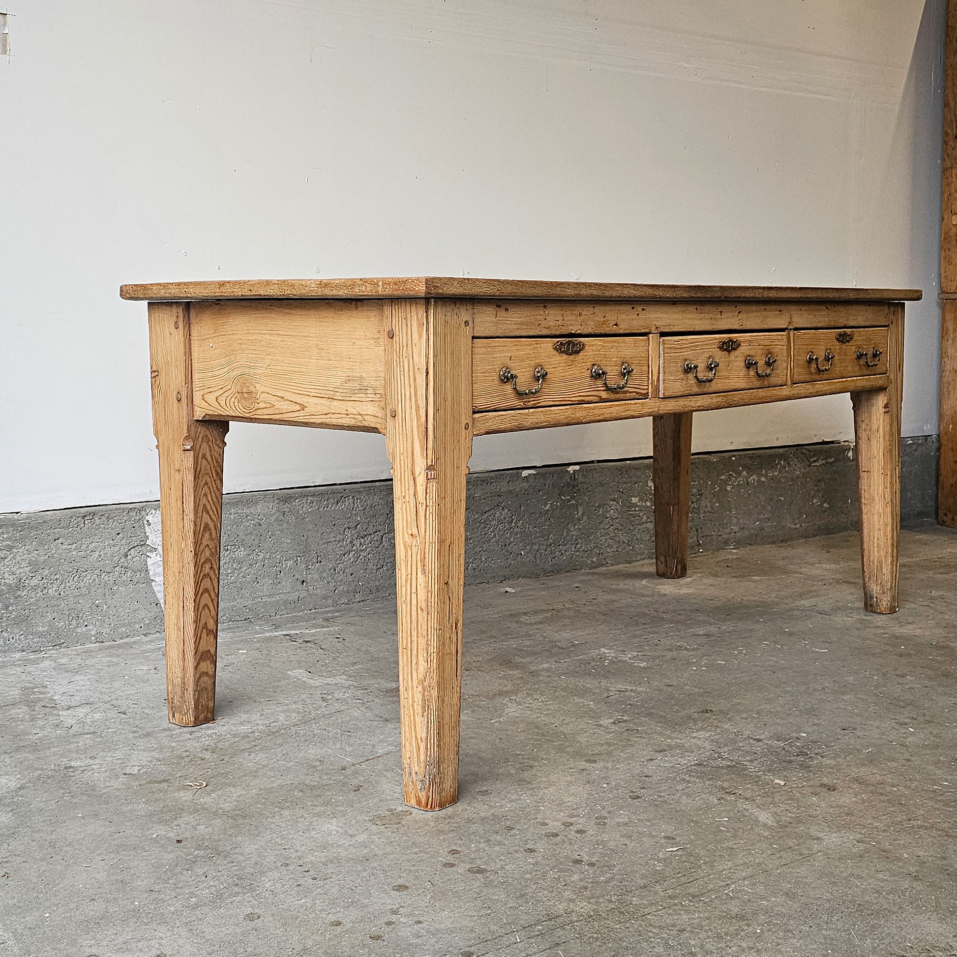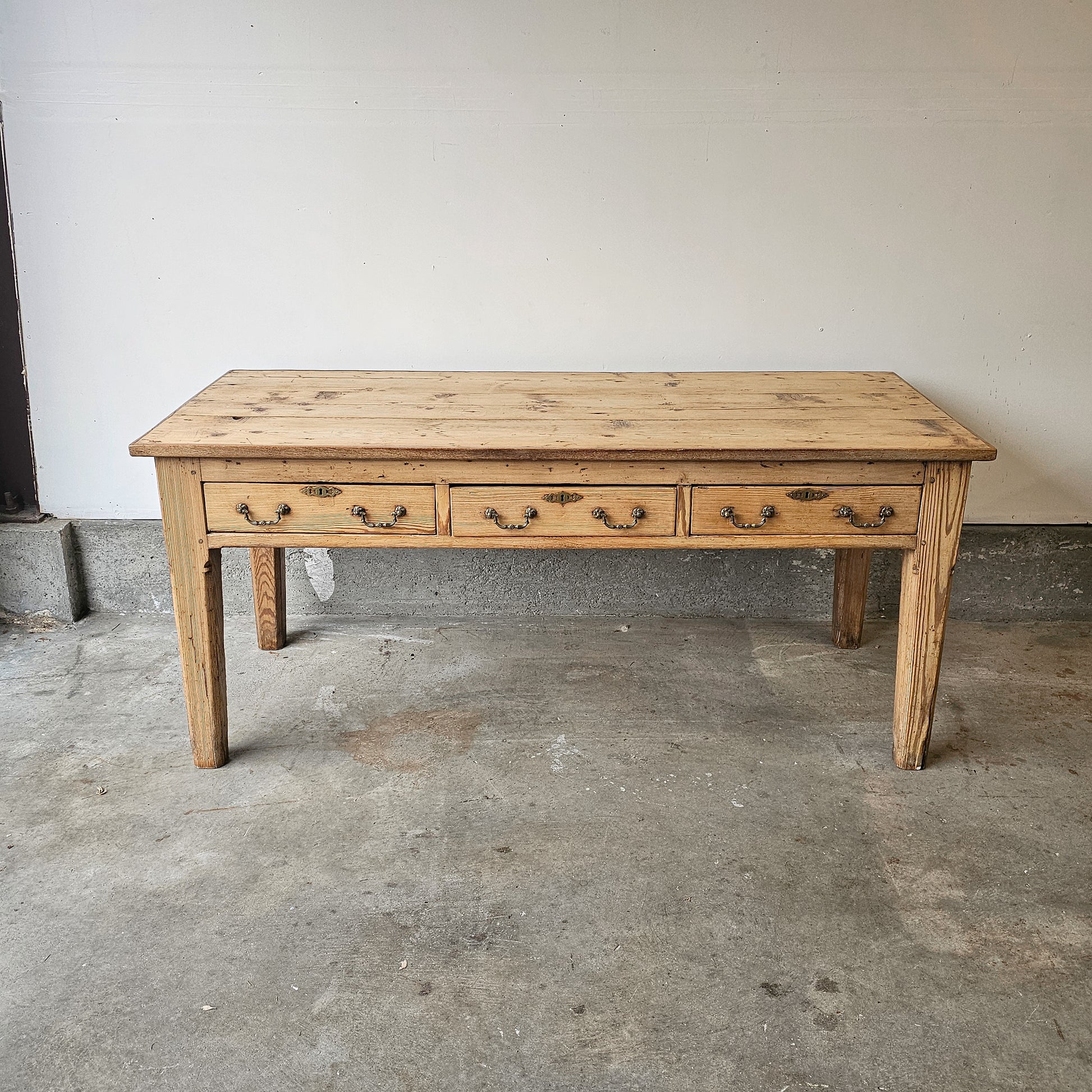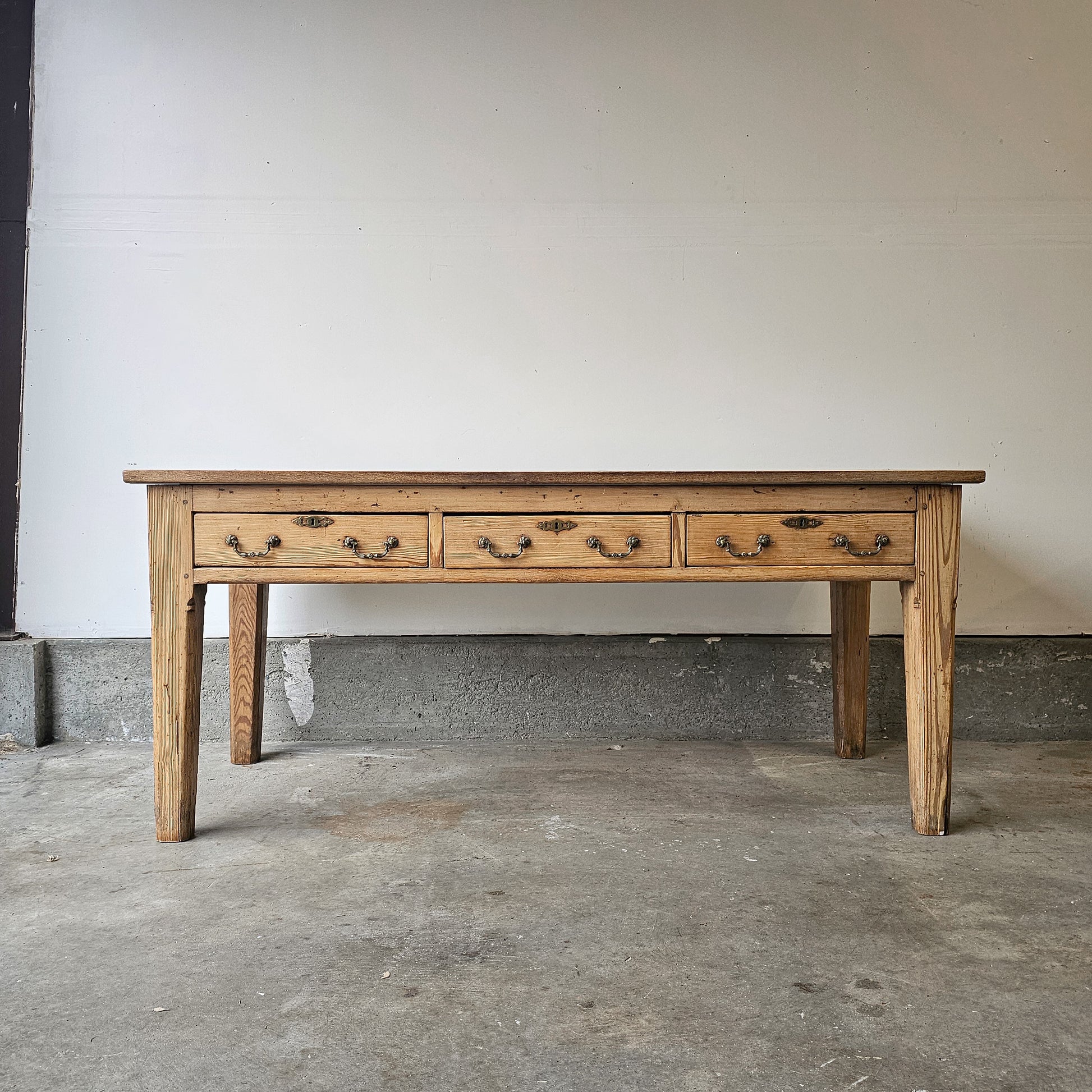 The wide plank top showcases a rich, softly aged patina with visible grain, knots, and gentle surface wear that tell the story of its past. Below, three drawers span the front, each fitted with original-style metal pulls and escutcheons, offering practical storage for linens, writing supplies, or everyday essentials. Straight, sturdy legs and simple joinery give the table a clean, architectural silhouette that works beautifully as a farmhouse dining table, library table, console, or large writing desk.