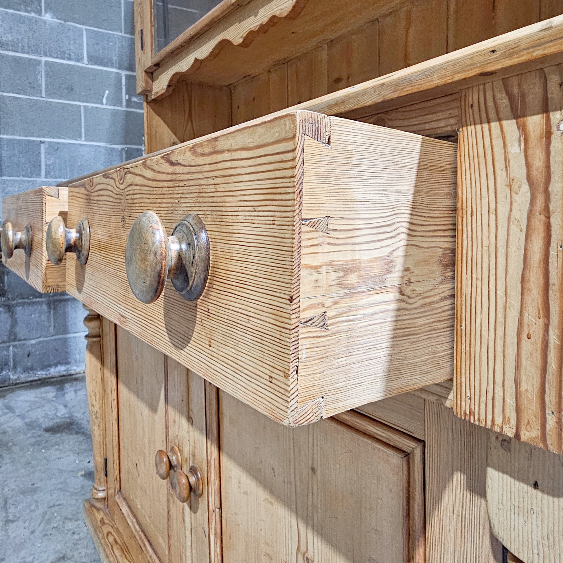 A beautifully proportioned antique pine hutch, rich with Old-World character and warm, timeworn charm. Crafted in solid pine, this substantial piece showcases a softly aged honeyed patina, expressive grain, and natural knots throughout—hallmarks of honest craftsmanship and everyday utility.