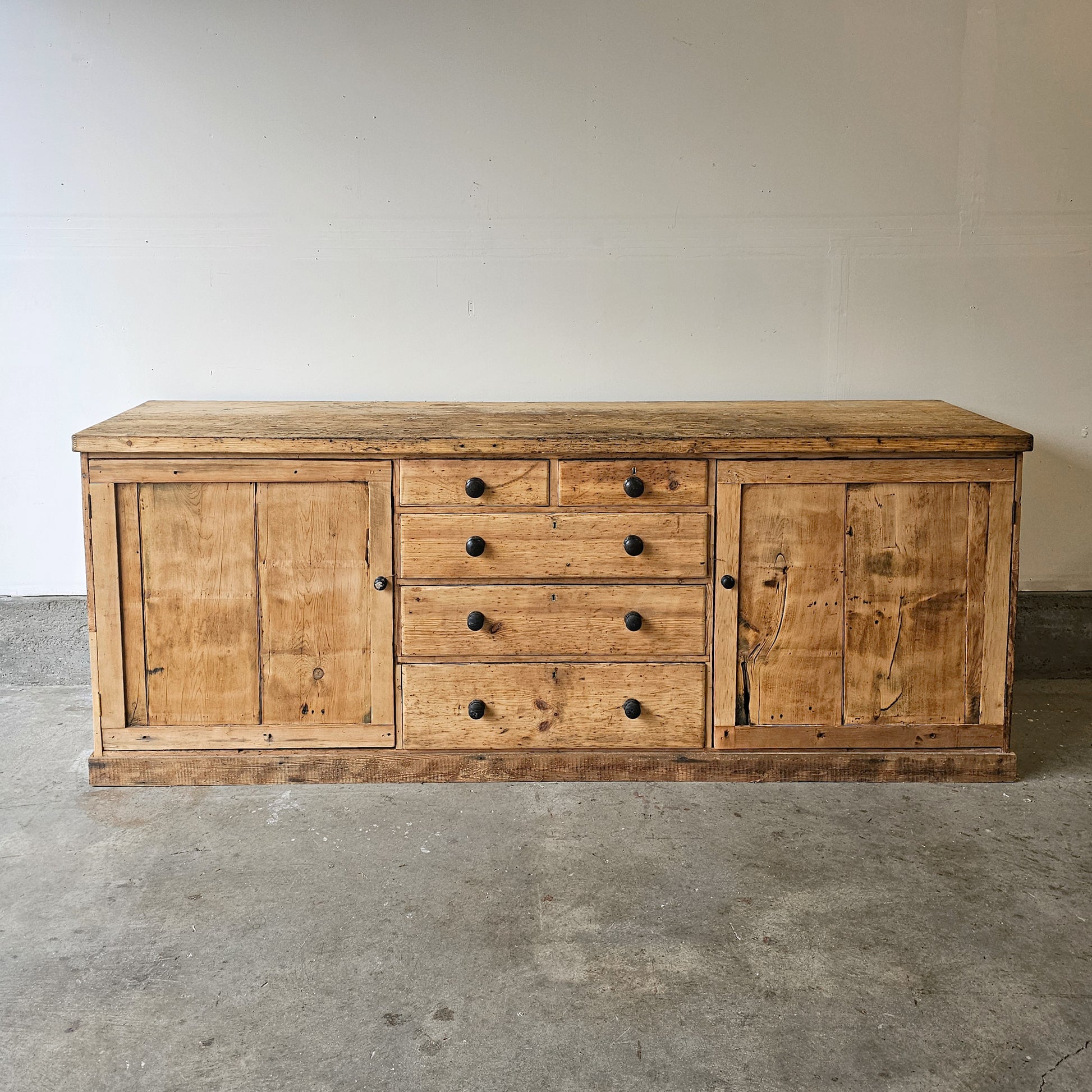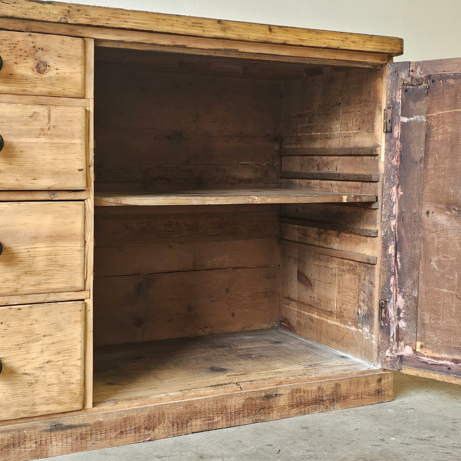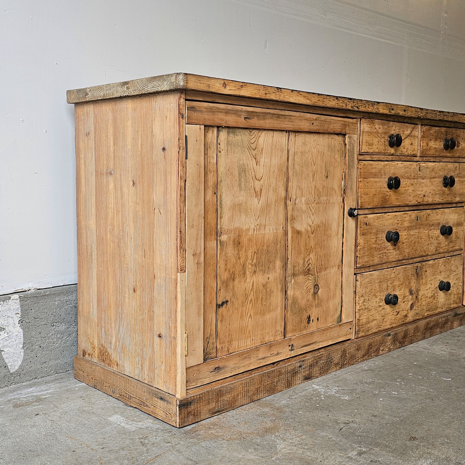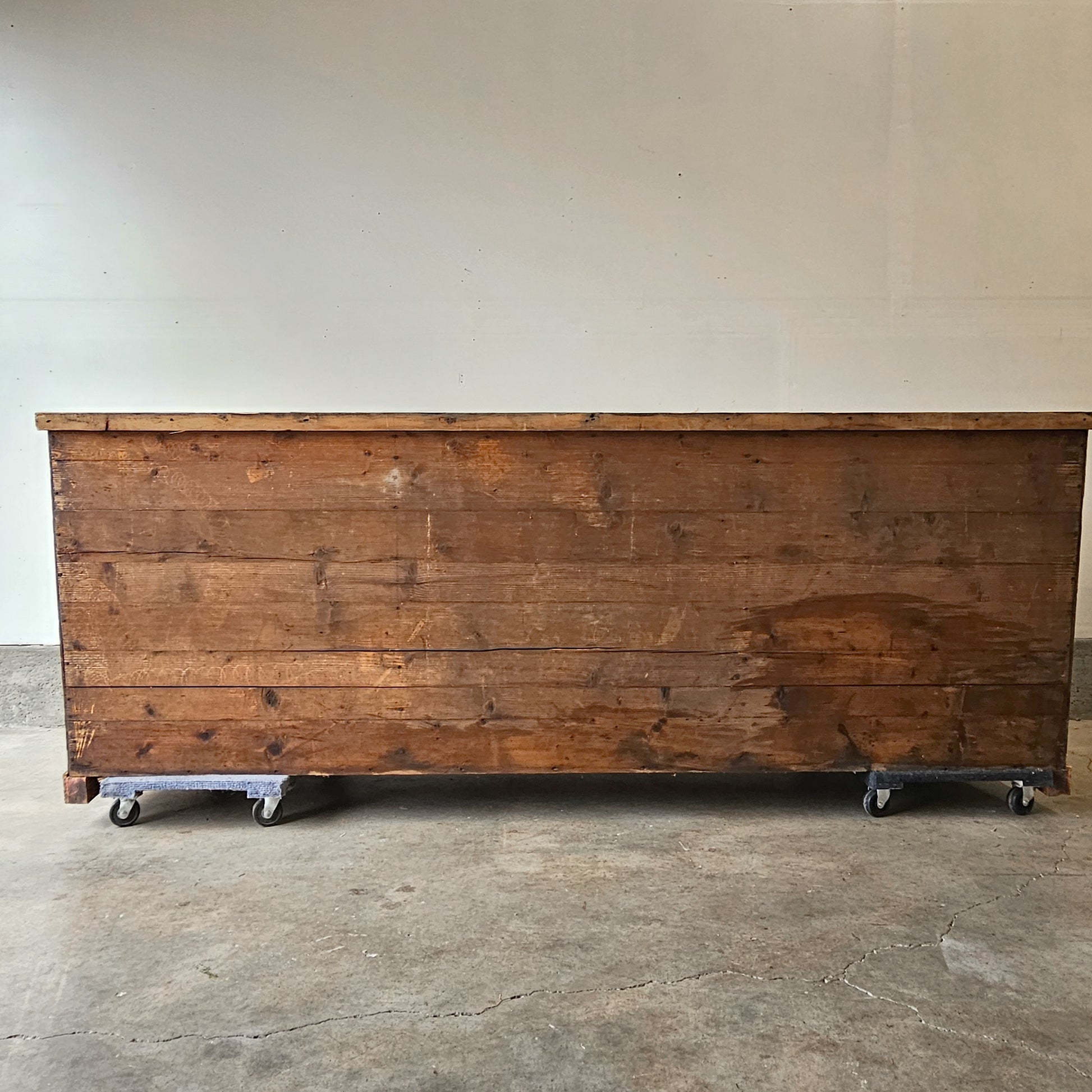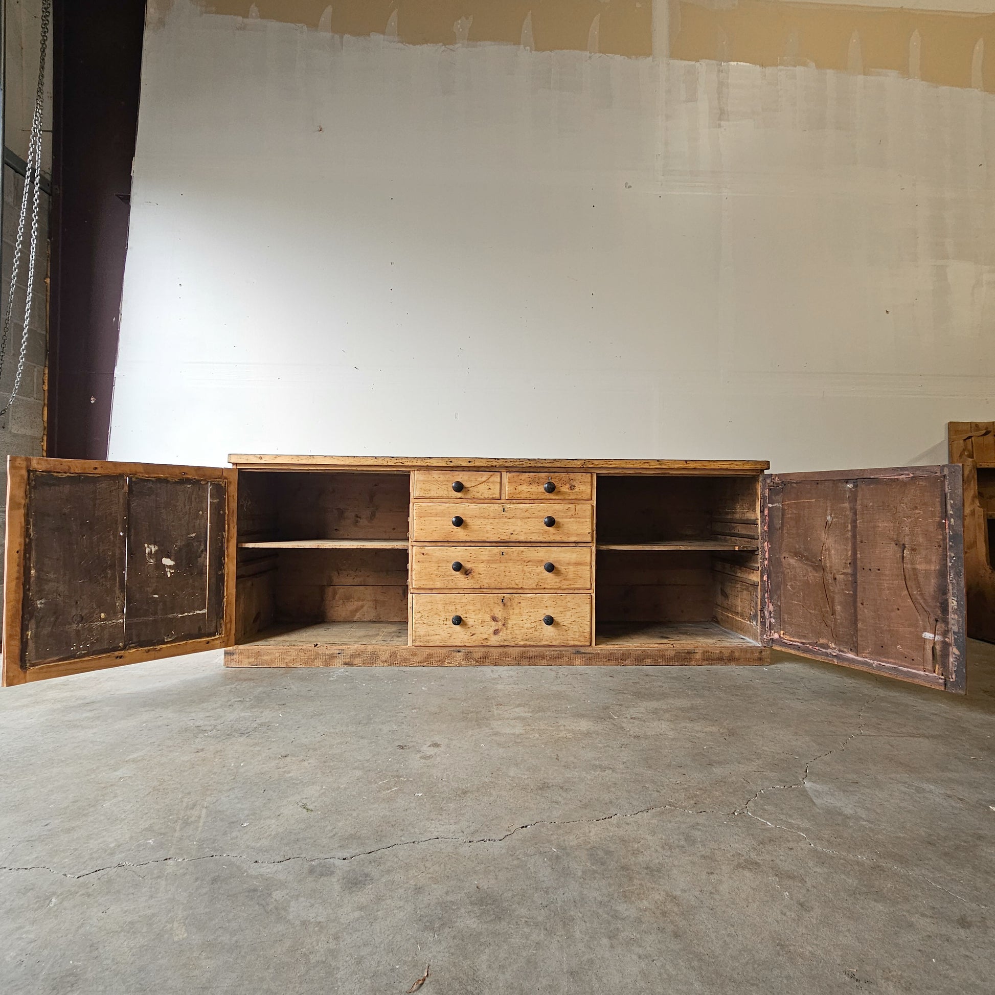 Today, this cabinet translates beautifully into a modern setting. Its incredible scale and substantial construction make it ideal as a kitchen island, media console, dining sideboard, or entry anchor. In a retail or storefront environment, it would be especially striking as a checkout counter, display base, or statement merchandising piece—bringing warmth, history, and authenticity to any space.