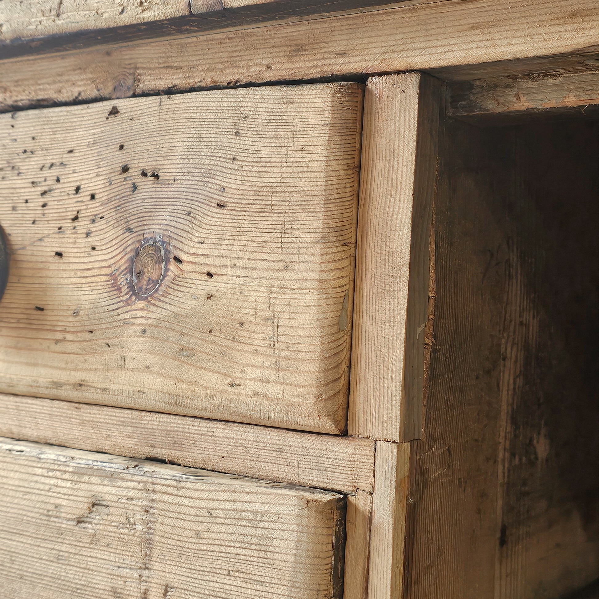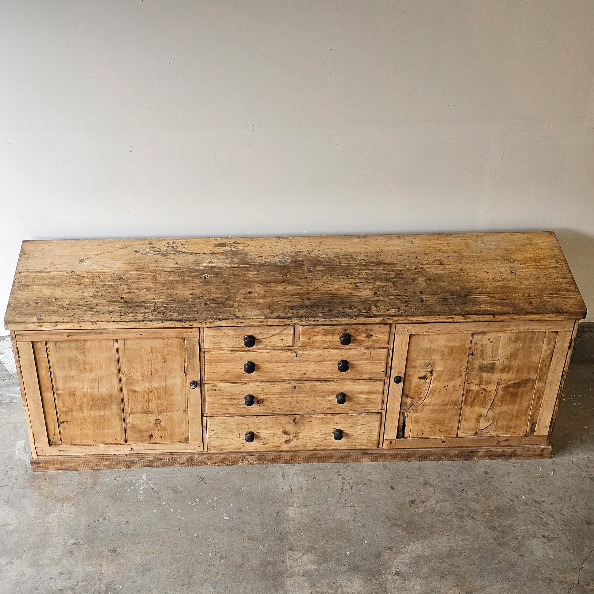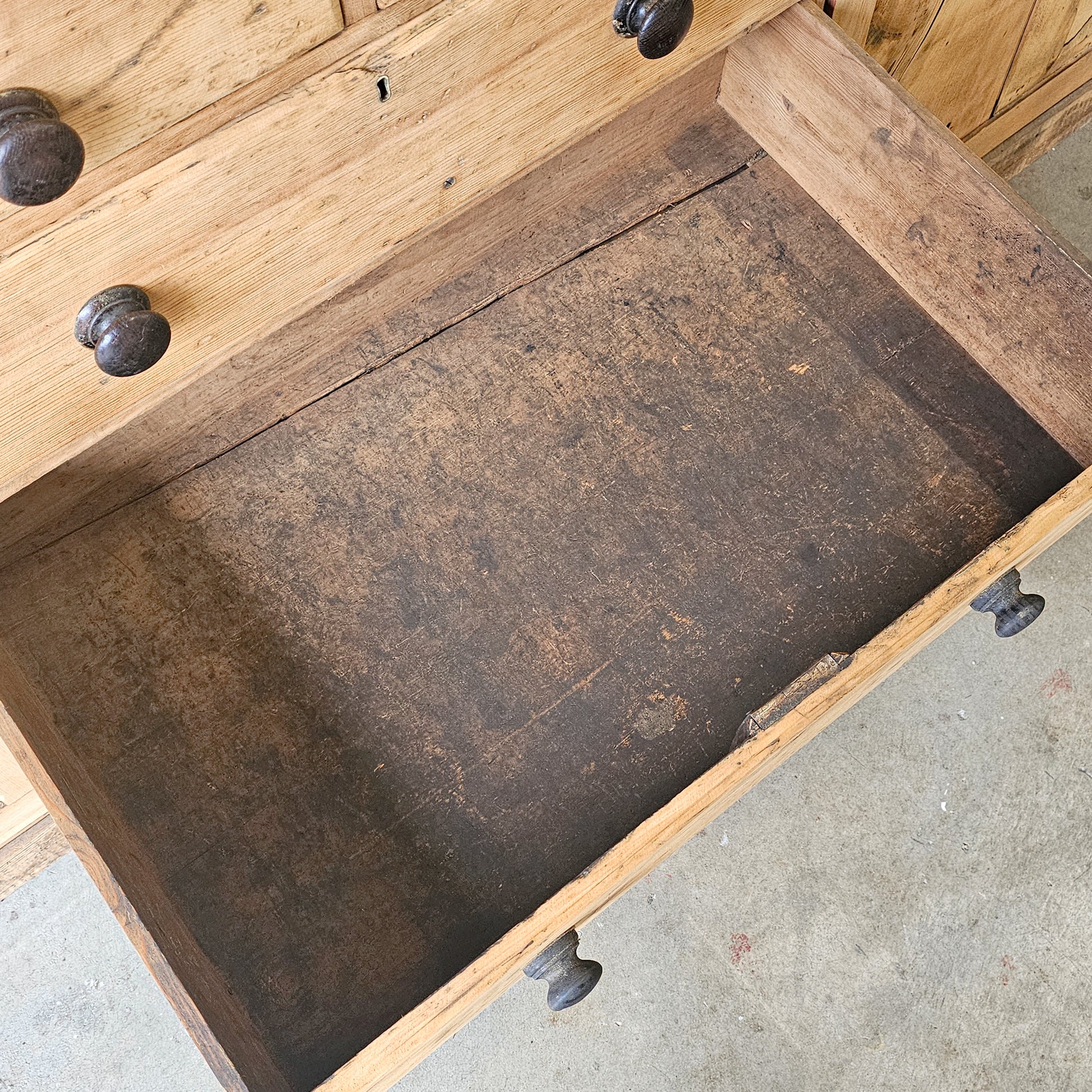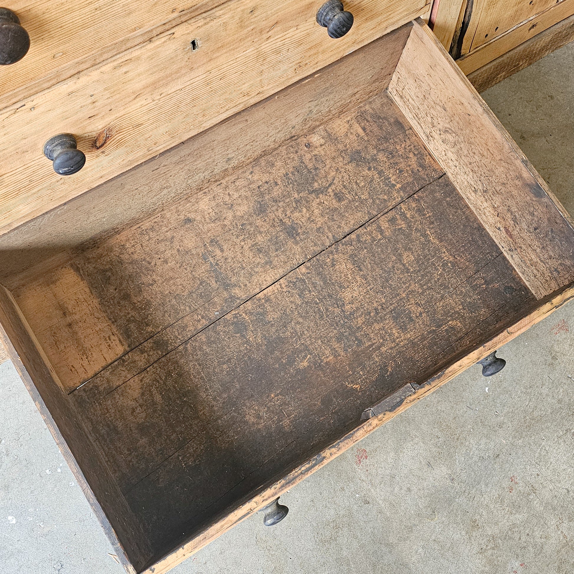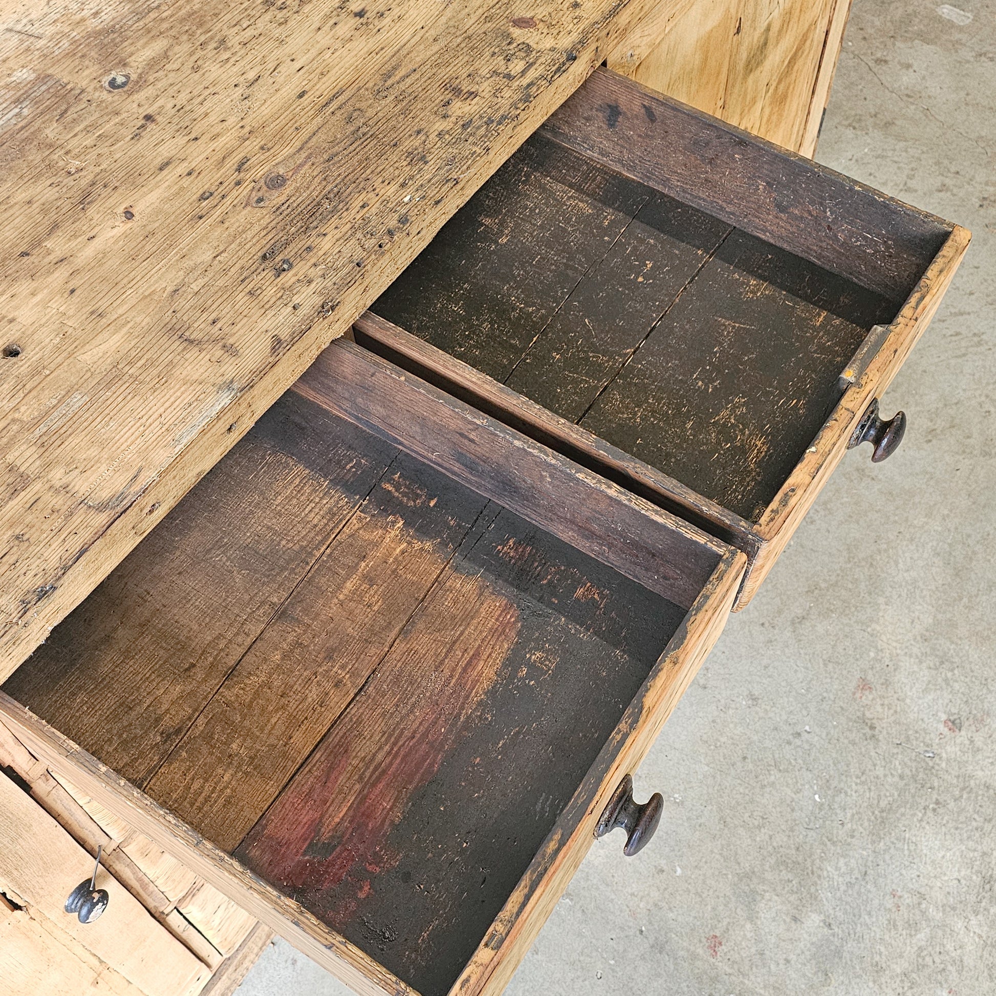 The thick, expansive pine top shows deep wear, surface markings, and areas of historic repair—honest signs of a life well used. The drawer interiors are naturally ebonized from years of handling and storage, a beautiful and authentic detail that speaks to the piece’s long working history.