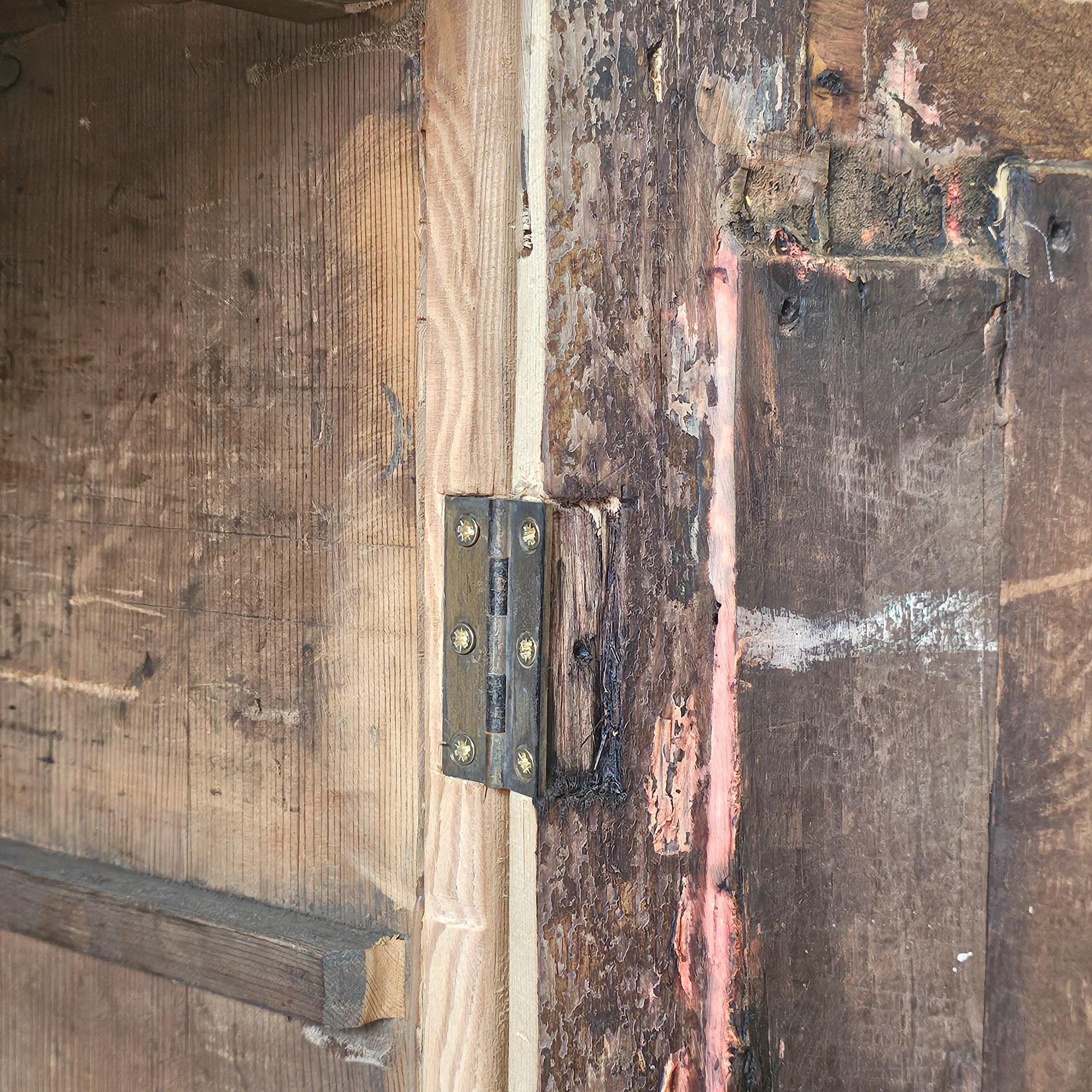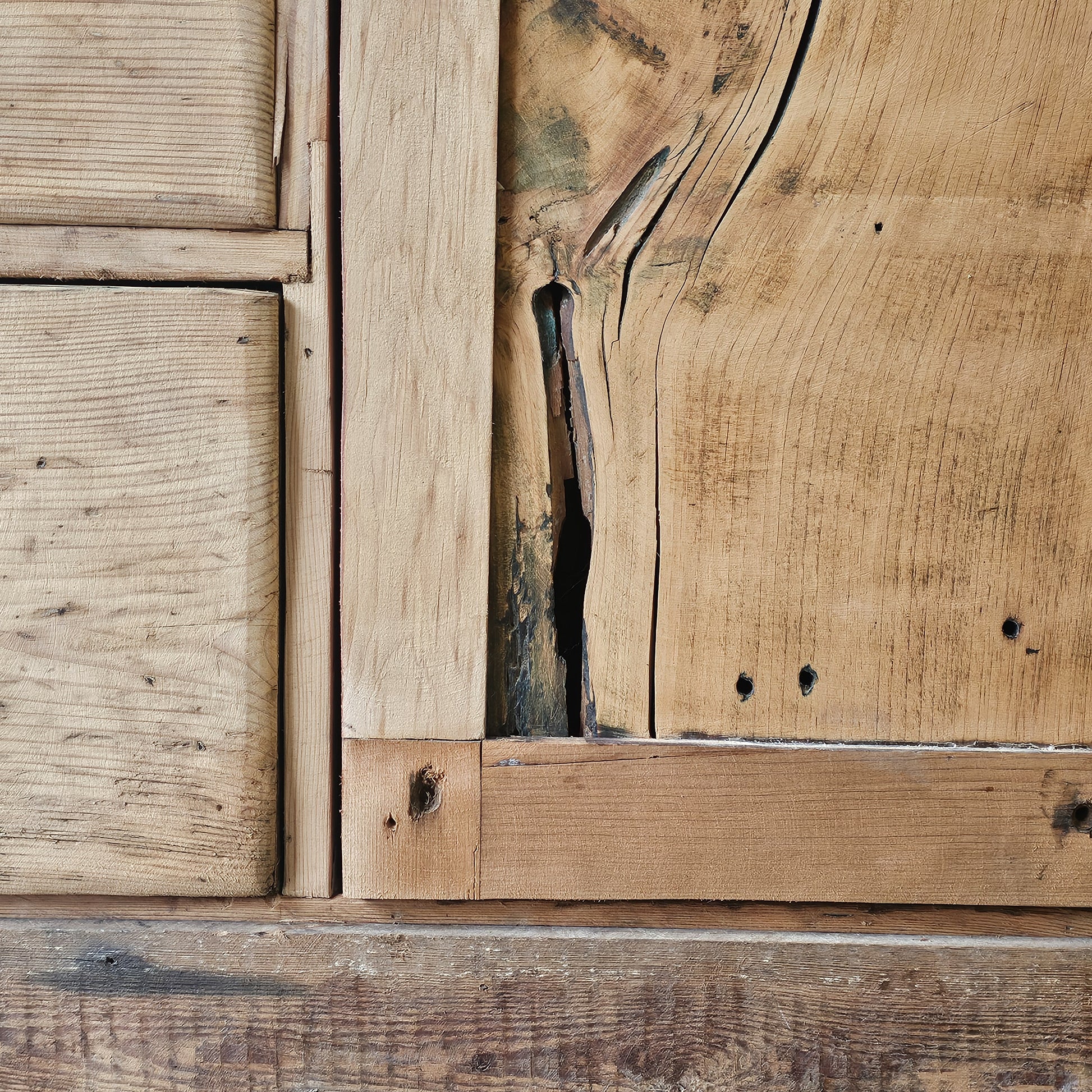 The lower cabinets offer generous storage. The interior shelves are original and remain fixed, as they are nailed and glued in place; they were once intended to be adjustable, reflecting the practical, utilitarian design of the piece.
