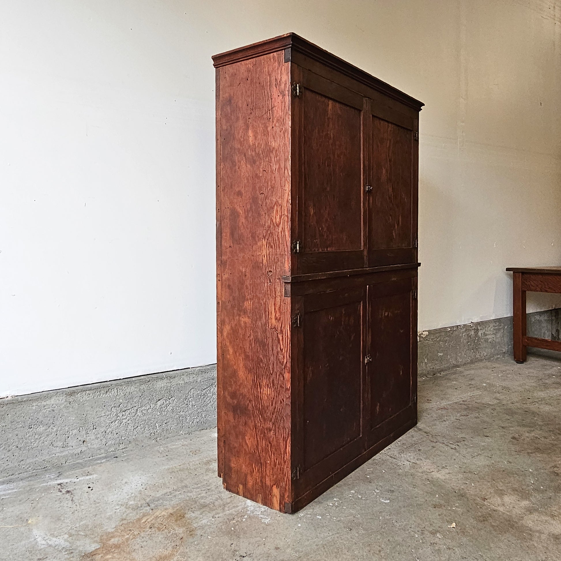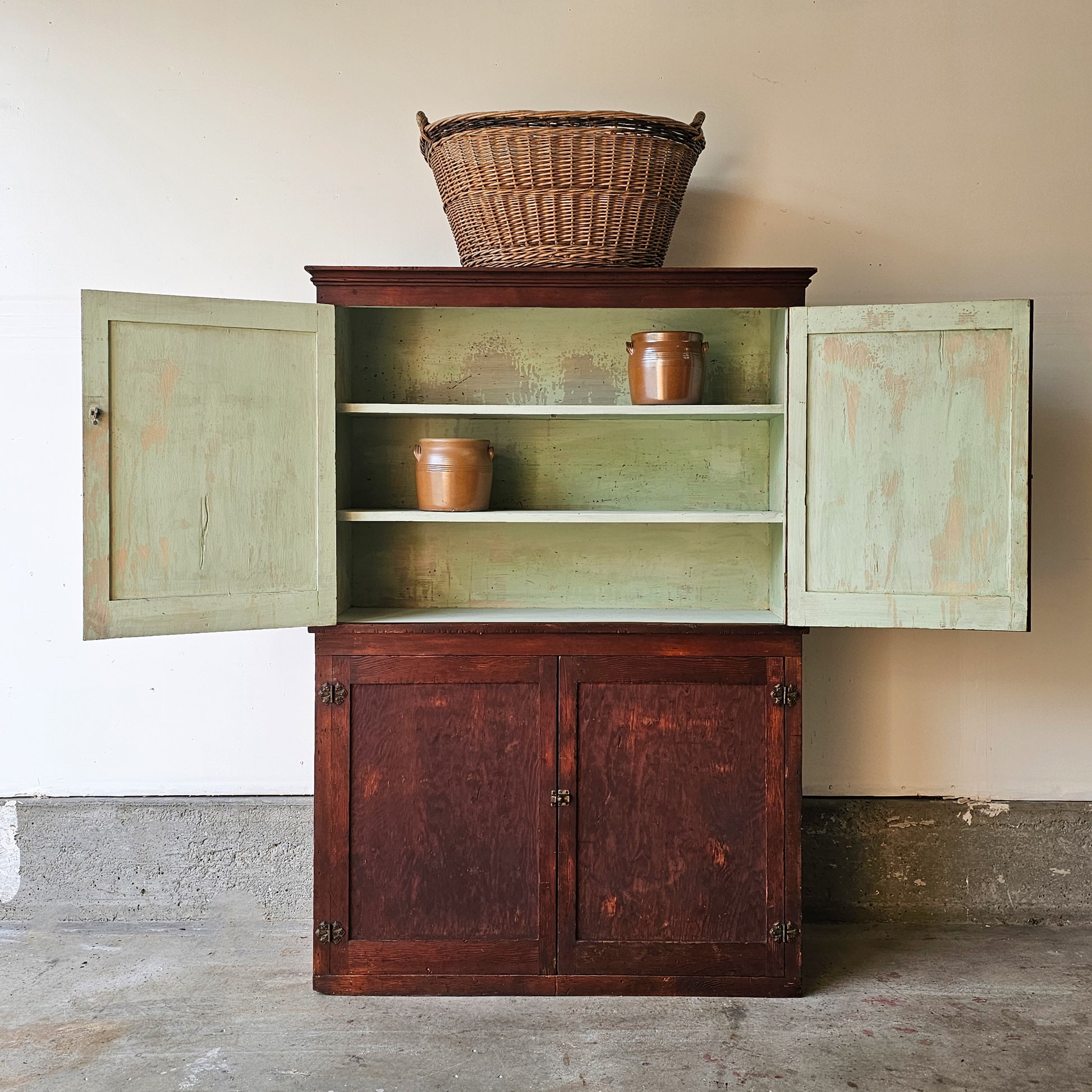 Antique fir cupboard with a rich, warm exterior finish and a beautifully worn, soft green painted interior. This one-piece cabinet features four paneled doors that open to spacious fixed shelves, offering plenty of storage for kitchenware, pantry items, or display pieces.