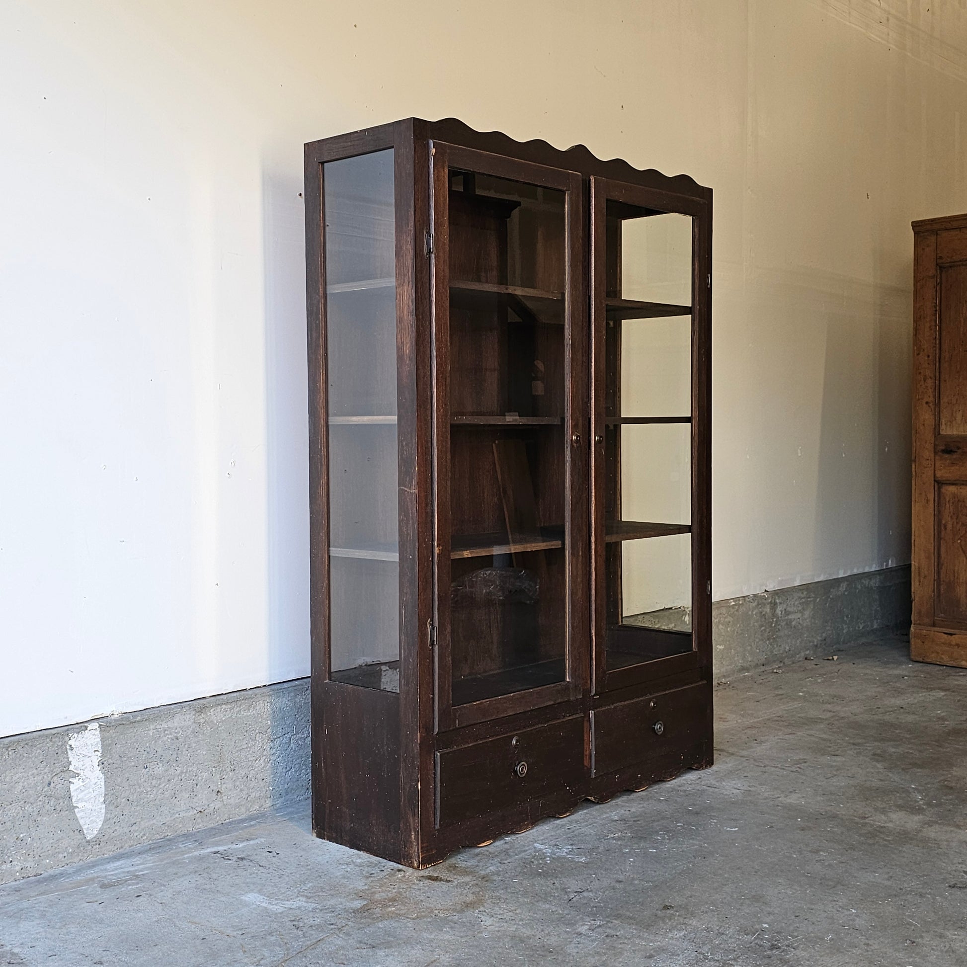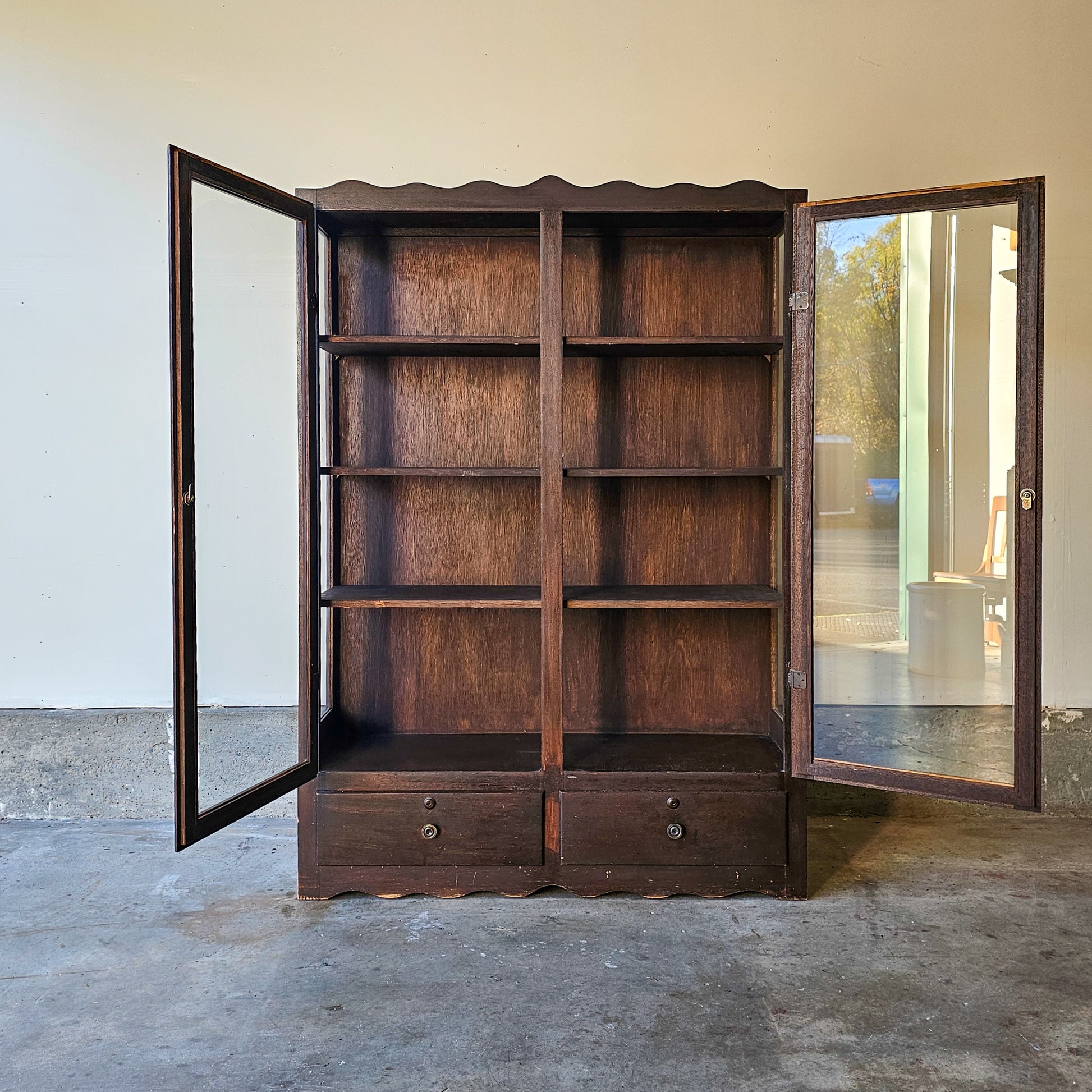 Antique glass-front cabinet features two locking doors and two lower drawers, both complete with working locks and key. The shelves inside are removable and adjustable, allowing for versatile storage and display options. A charming scalloped trim along the top and base adds a touch of old-world detail to its timeless design.