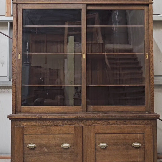 Antique Oak General Store Cabinet with Glass Sliding Doors