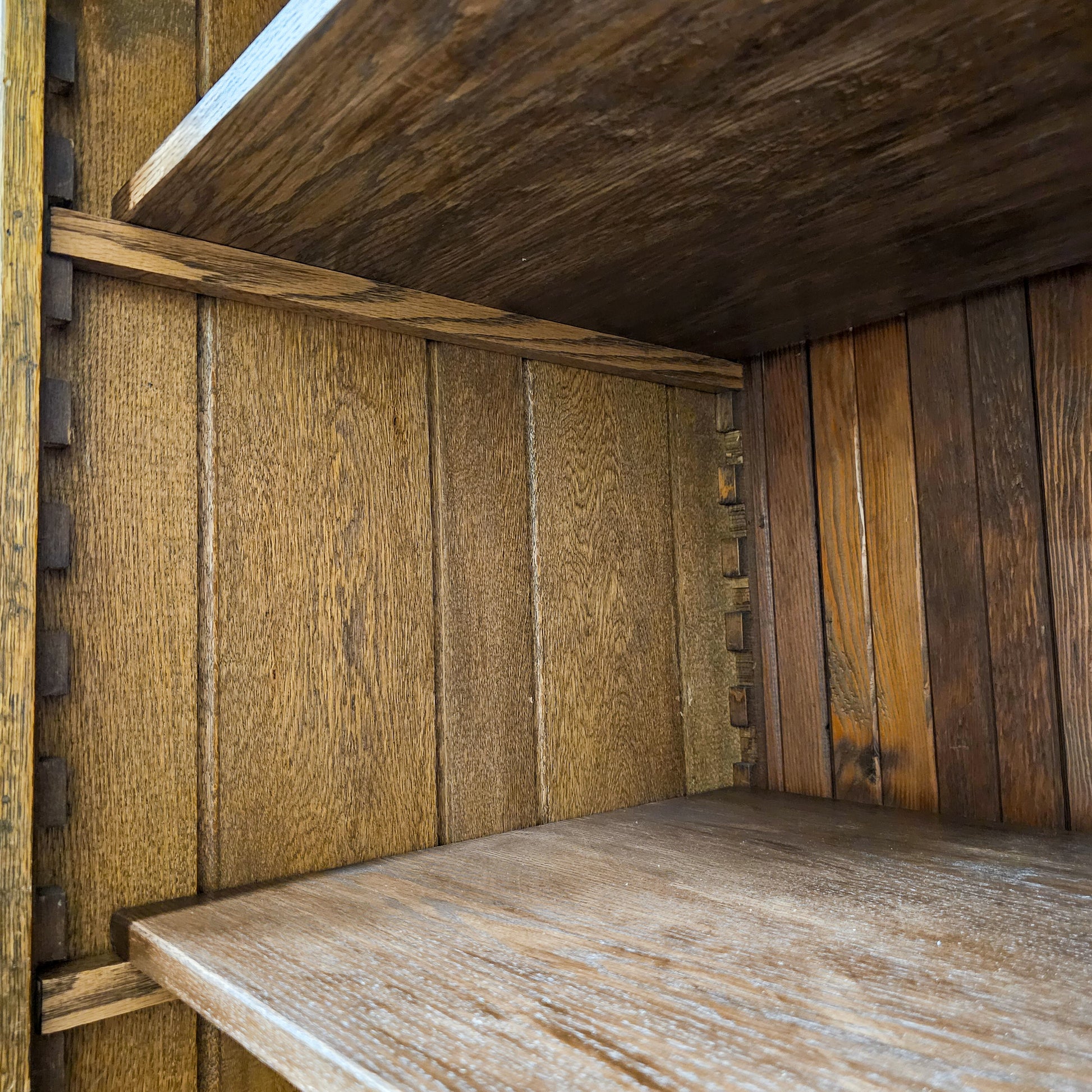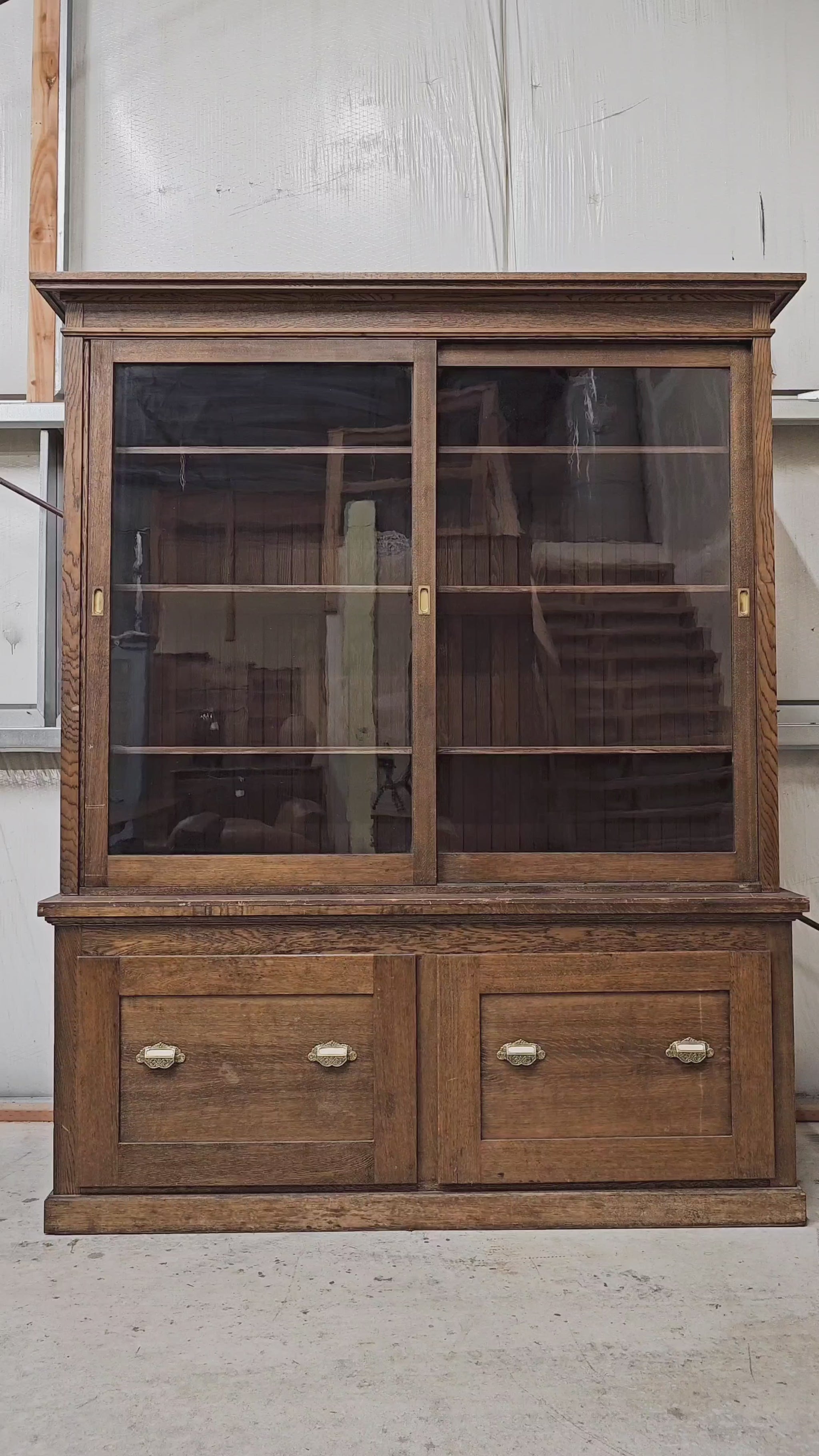 This antique oak cabinet offers both display and storage in a timeless design. The upper section features glass sliding doors with three interior shelves. The shelves are removable and adjustable in height. The base is fitted with two oversized drawers, each with original brass pulls, providing ample storage space.