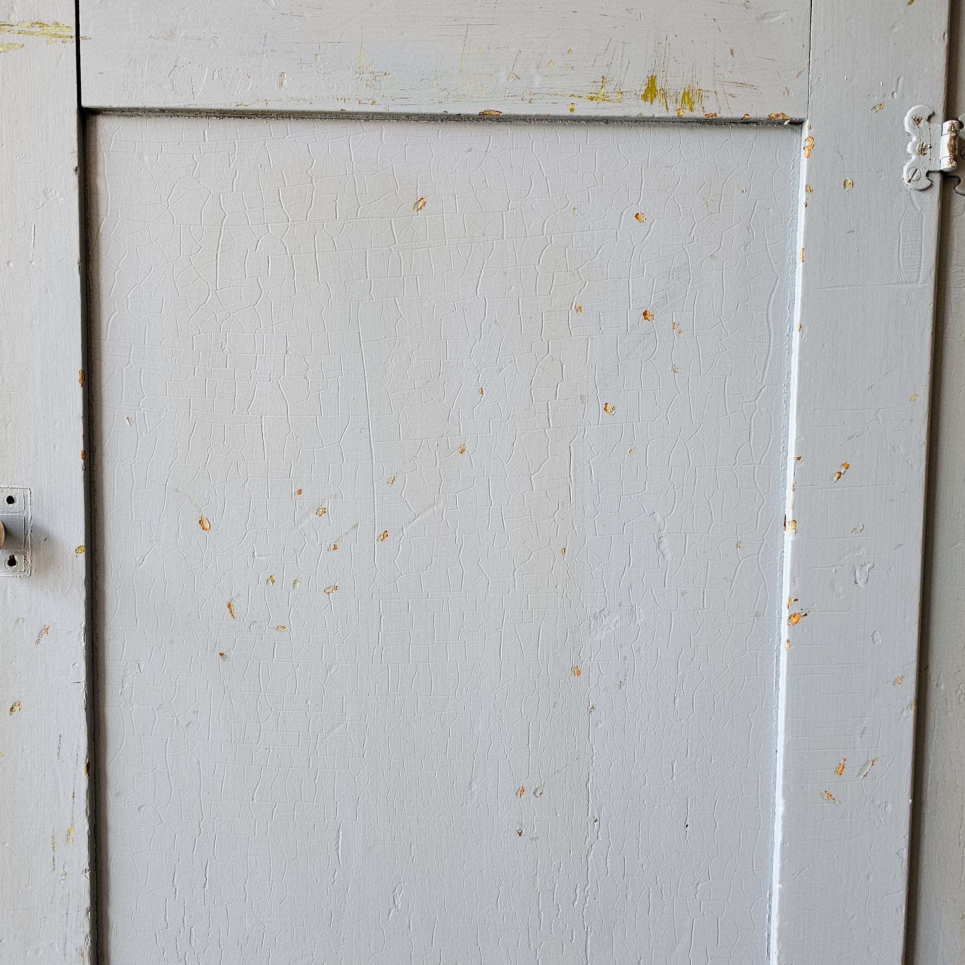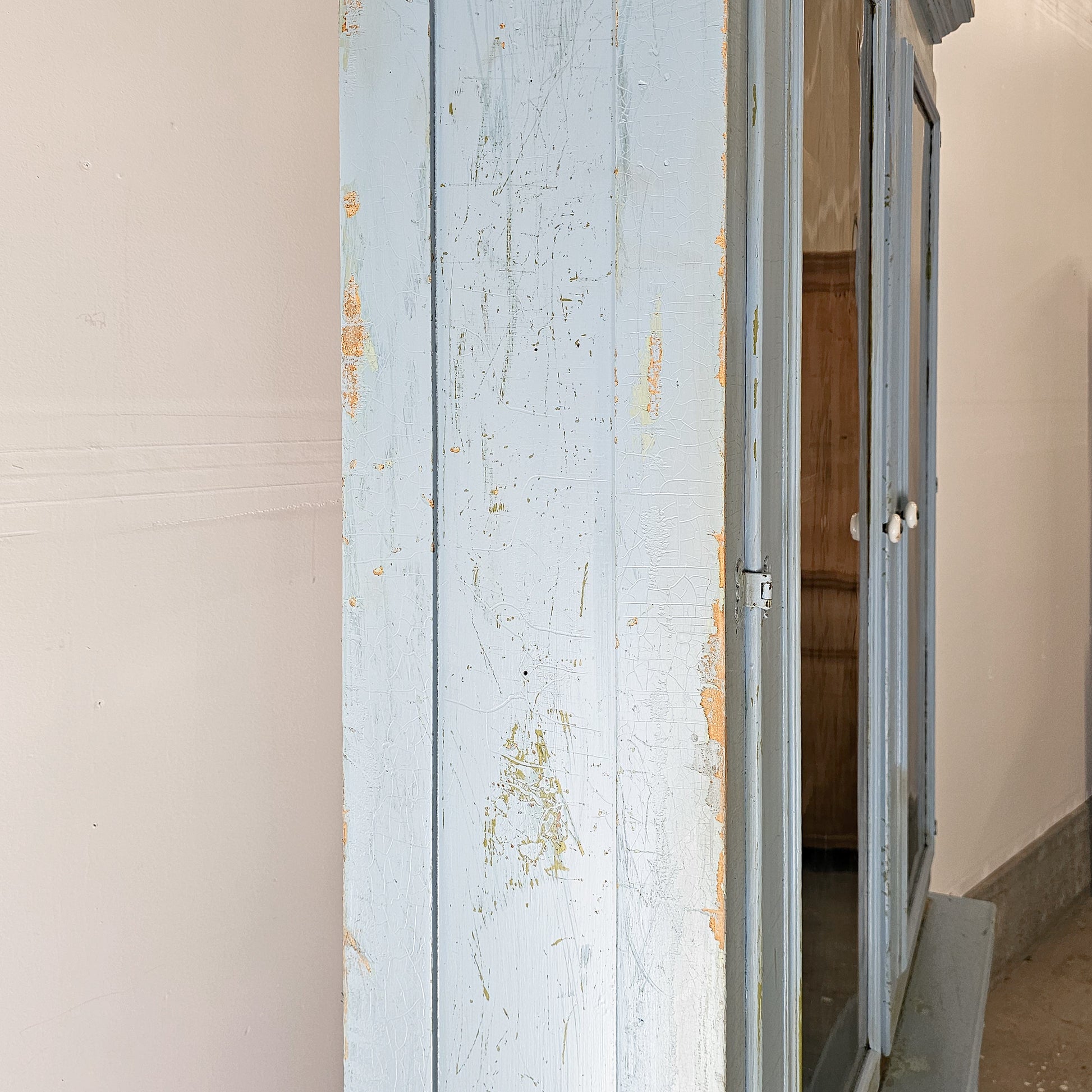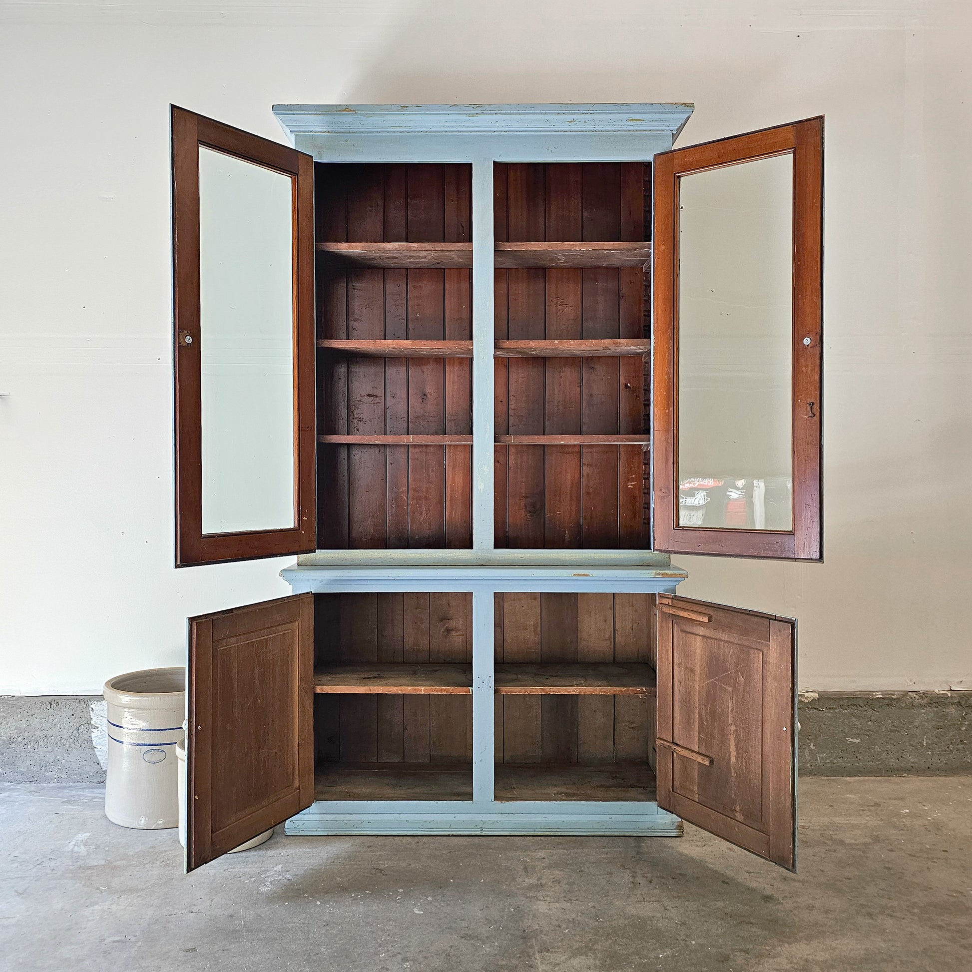 Early 1900s Fir Hutch in heavily distressed blue paint, showcasing a century of age and charm. Crafted from solid fir wood, this antique piece features a classic two-piece design with glass-front upper doors and paneled lower doors. The upper cabinet includes three adjustable shelves to suit your storage or display needs, while the base contains a fixed shelf. While we don’t believe the blue paint is original to the early 1900s construction of the cabinet, it has clearly been on the piece for many years and has aged beautifully, with a naturally distressed, timeworn finish that adds to its character and charm.