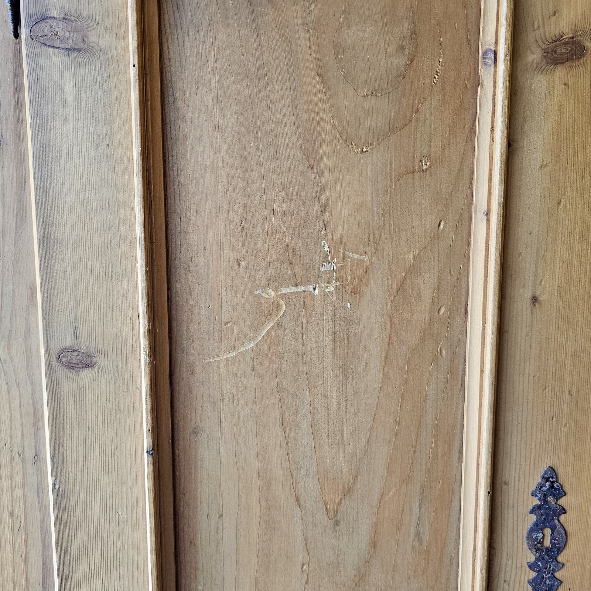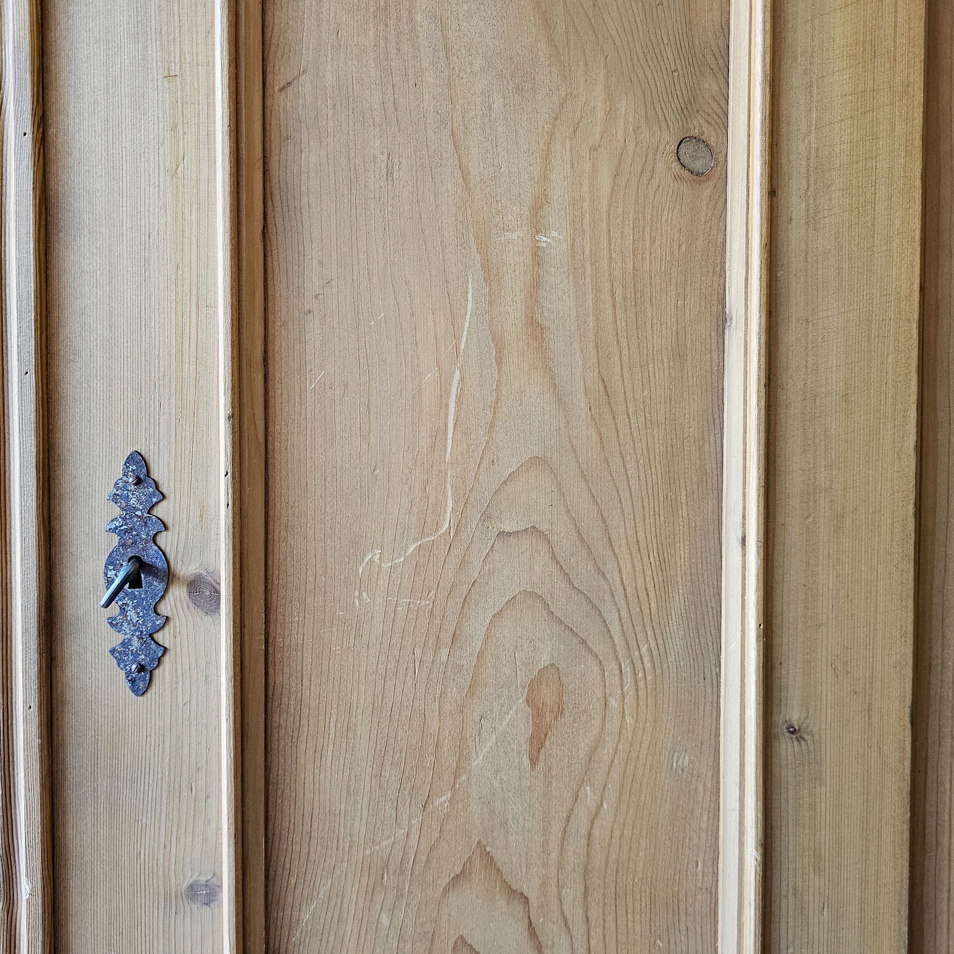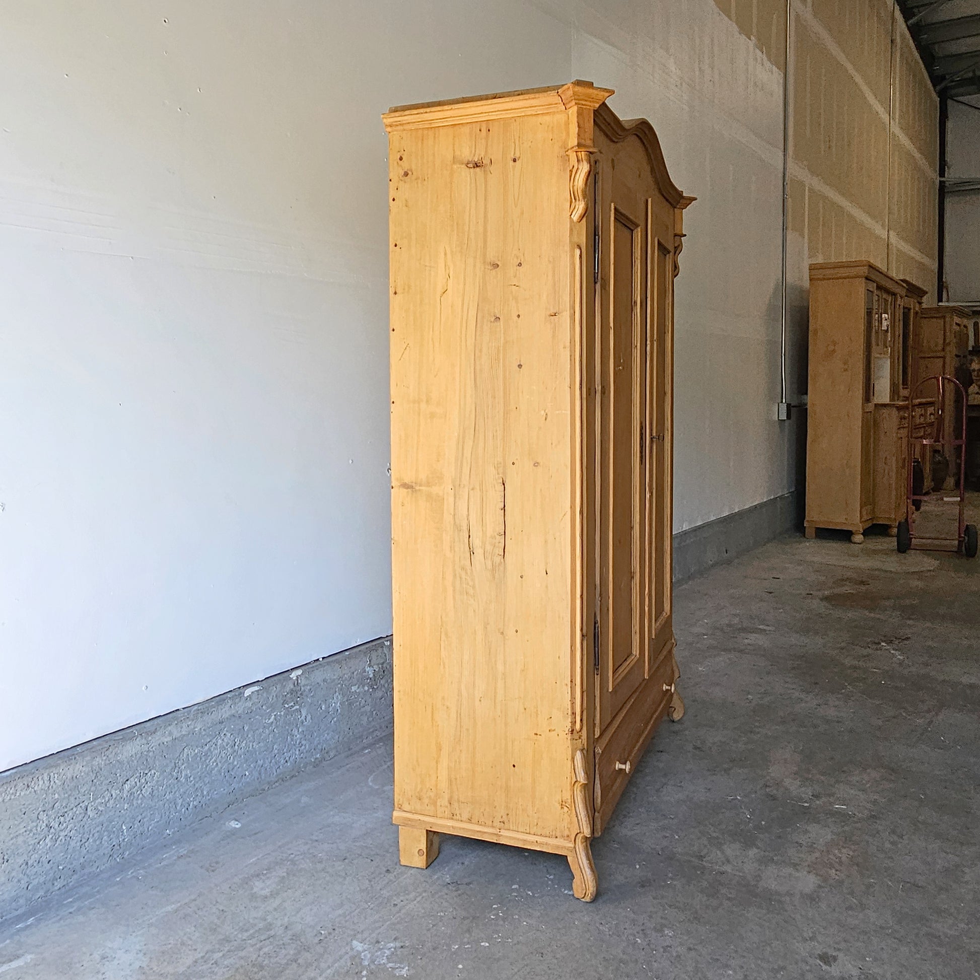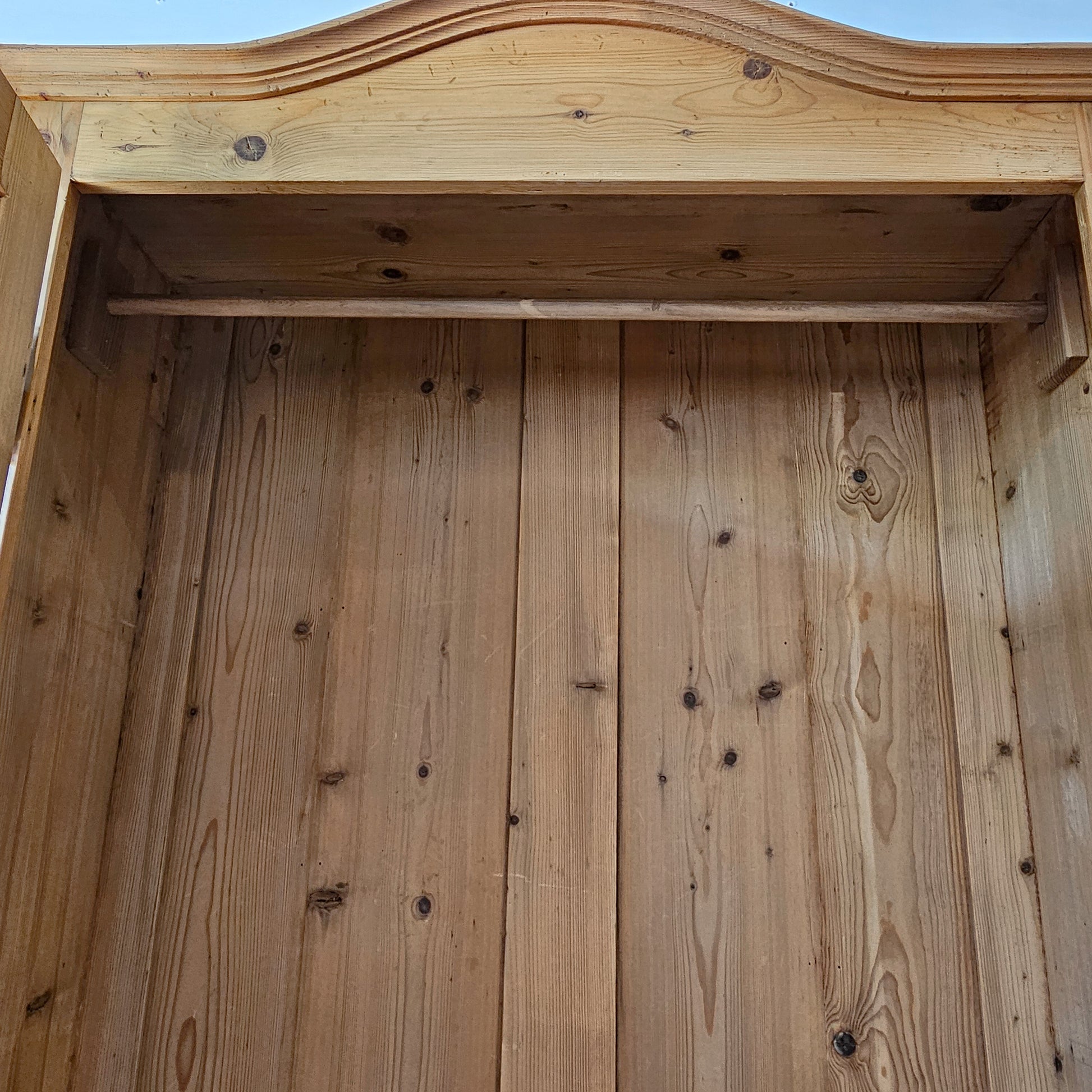 This elegant antique pine armoire features a gracefully curved crown, paneled double doors, and charming serpentine legs that add a refined touch. Made from solid pine with a warm, natural patina, the piece offers both beauty and function. Inside, you'll find a sturdy clothing rod for hanging garments, along with generous storage space for linens or wardrobe essentials. A wide lower drawer provides additional concealed storage. Working lock and key. Original metal hardware completes its timeless look.