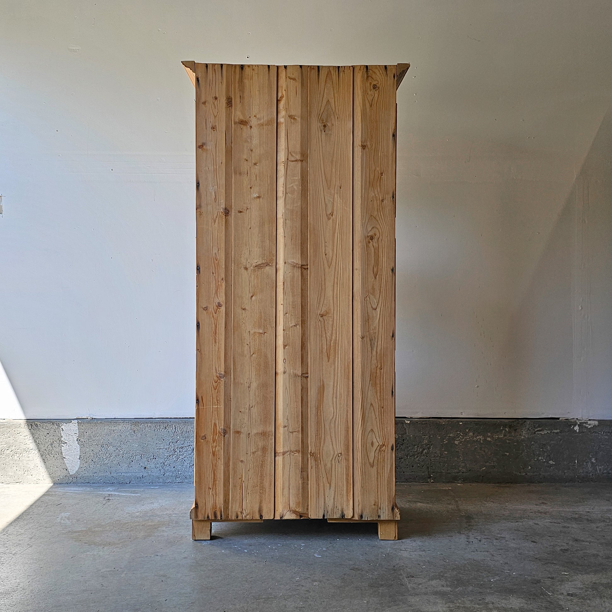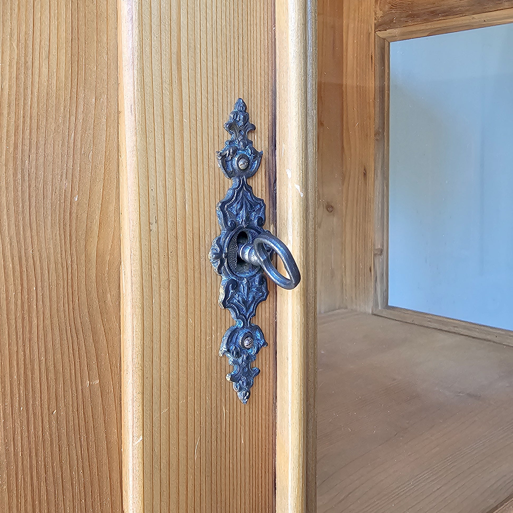 This antique pine cabinet offers simple, timeless elegance with its clean lines, rich patina, and classic panel door. Crafted from solid pine, the piece features a working lock and original key. Inside, removable shelves allow for versatile storage options, making it as practical as it is beautiful. Resting on turned bun feet and adorned with original hardware, this cabinet would make a perfect pantry, linen press, or entryway statement piece.