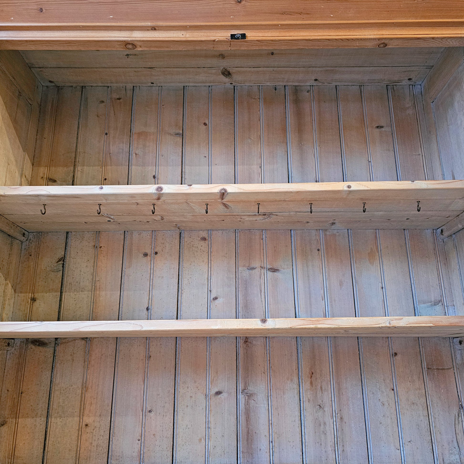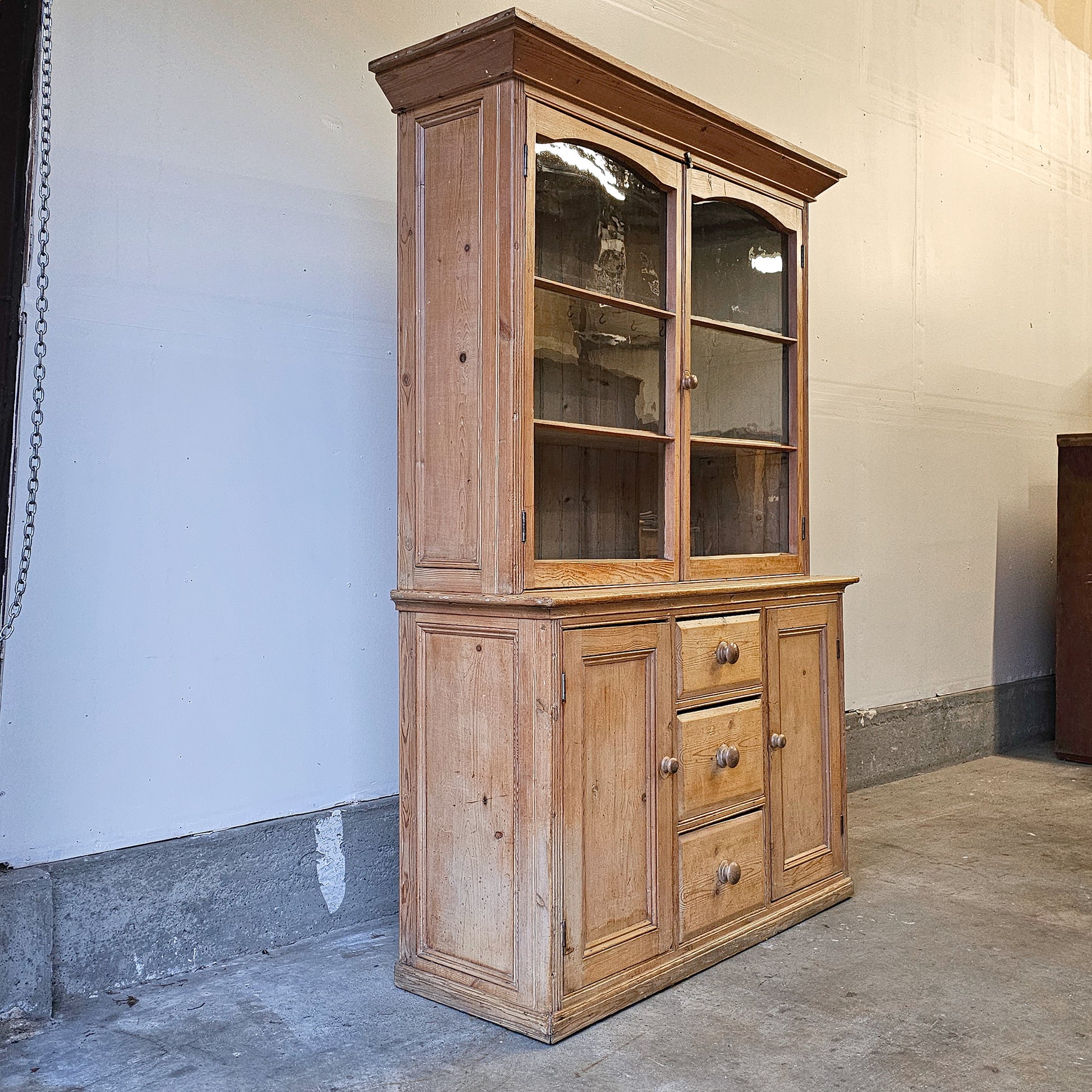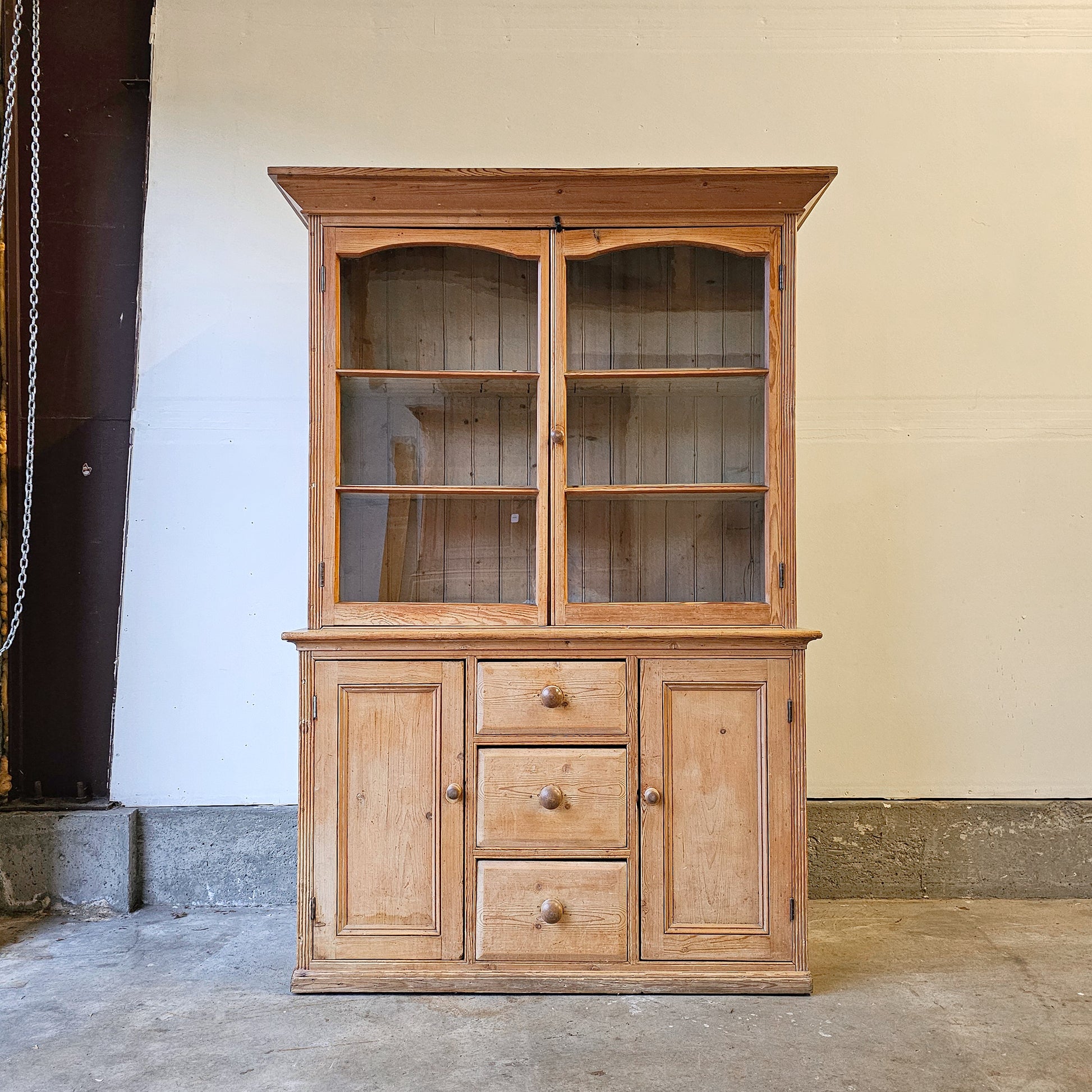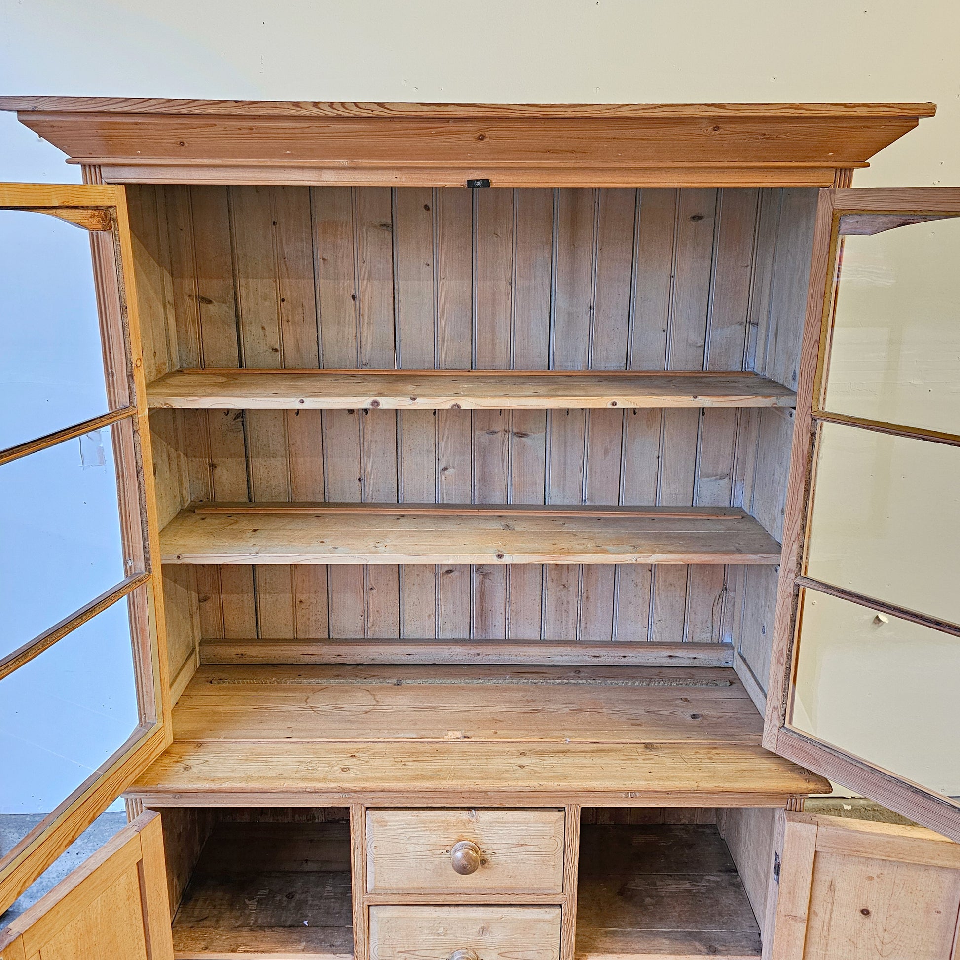 The upper cabinet features two glass doors with original wood mullions and two stationary shelves—perfect for displaying ironstone, kitchenware, books, or collected pieces. The lower storage includes two side cupboards divided by three central drawers, each with turned pine knobs.