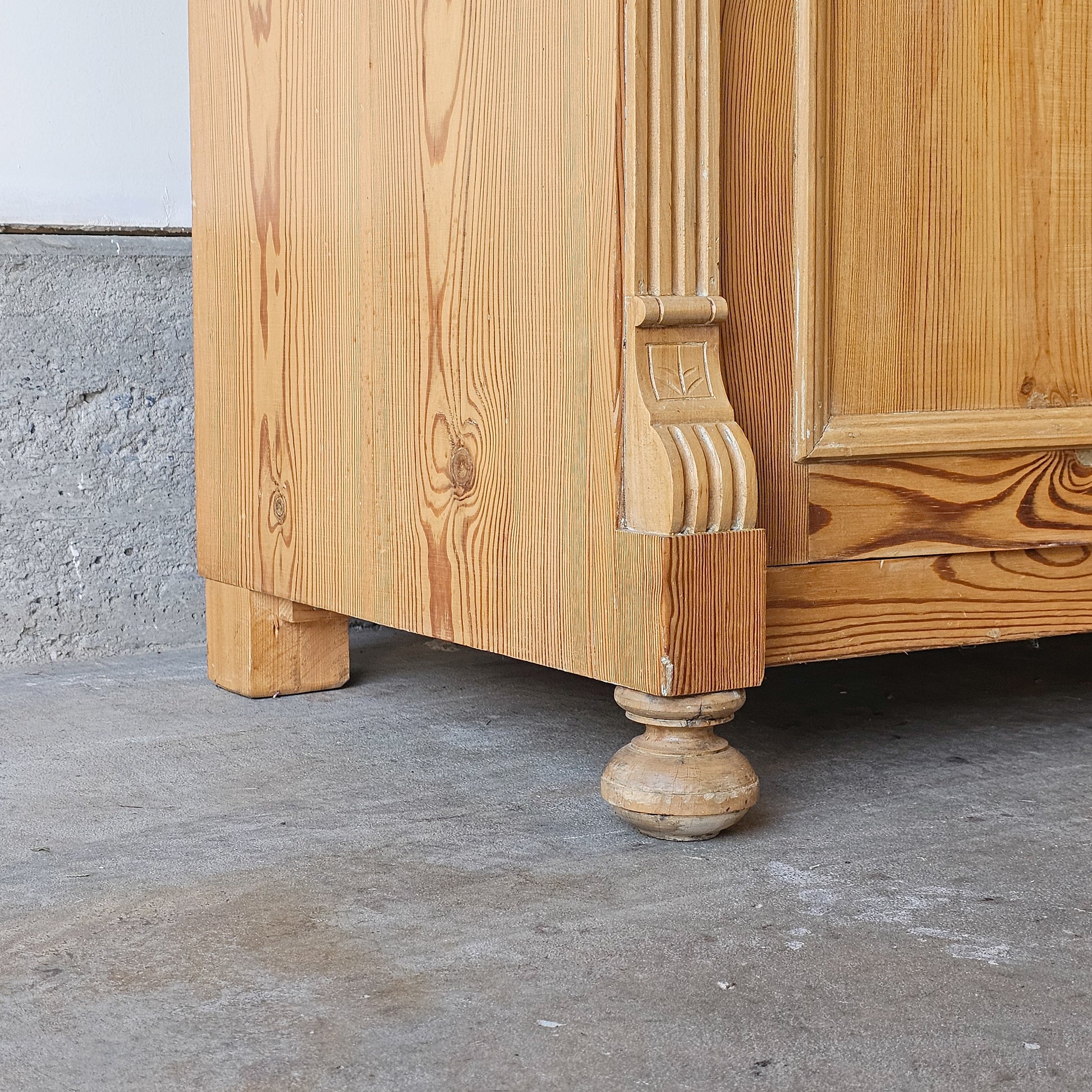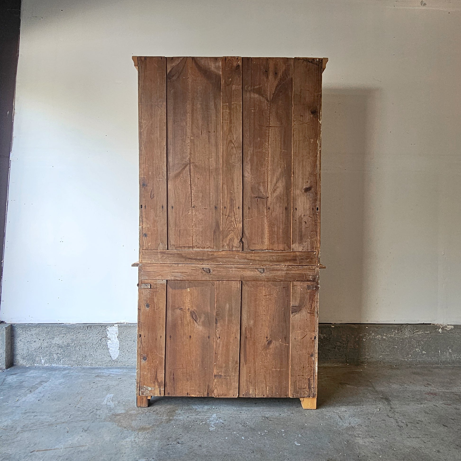 This beautiful antique pine hutch offers both charm and functionality. Crafted from solid pine, it features a classic two-piece construction for easy transport and setup. The upper cabinet showcases glass-front doors that open to reveal shelves—ideal for displaying dishware or collectibles. Below, two spacious drawers and paneled doors provide additional storage, with a working key included for the locks.