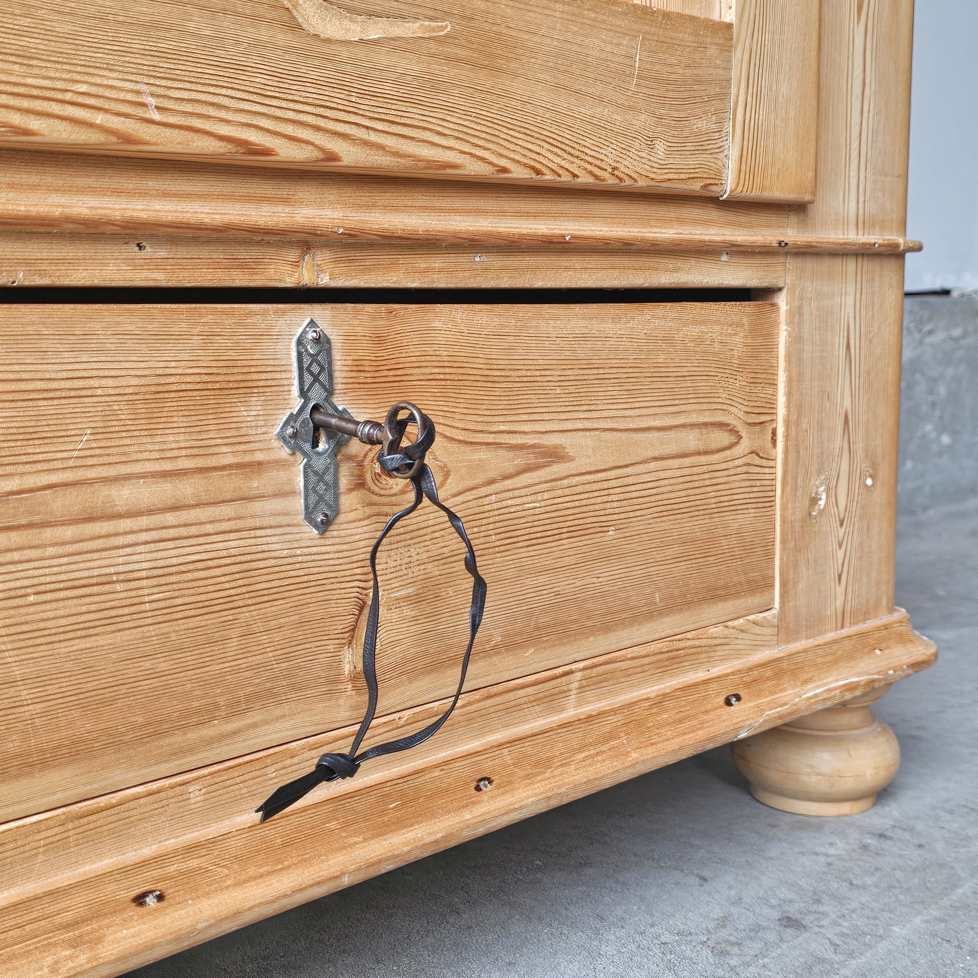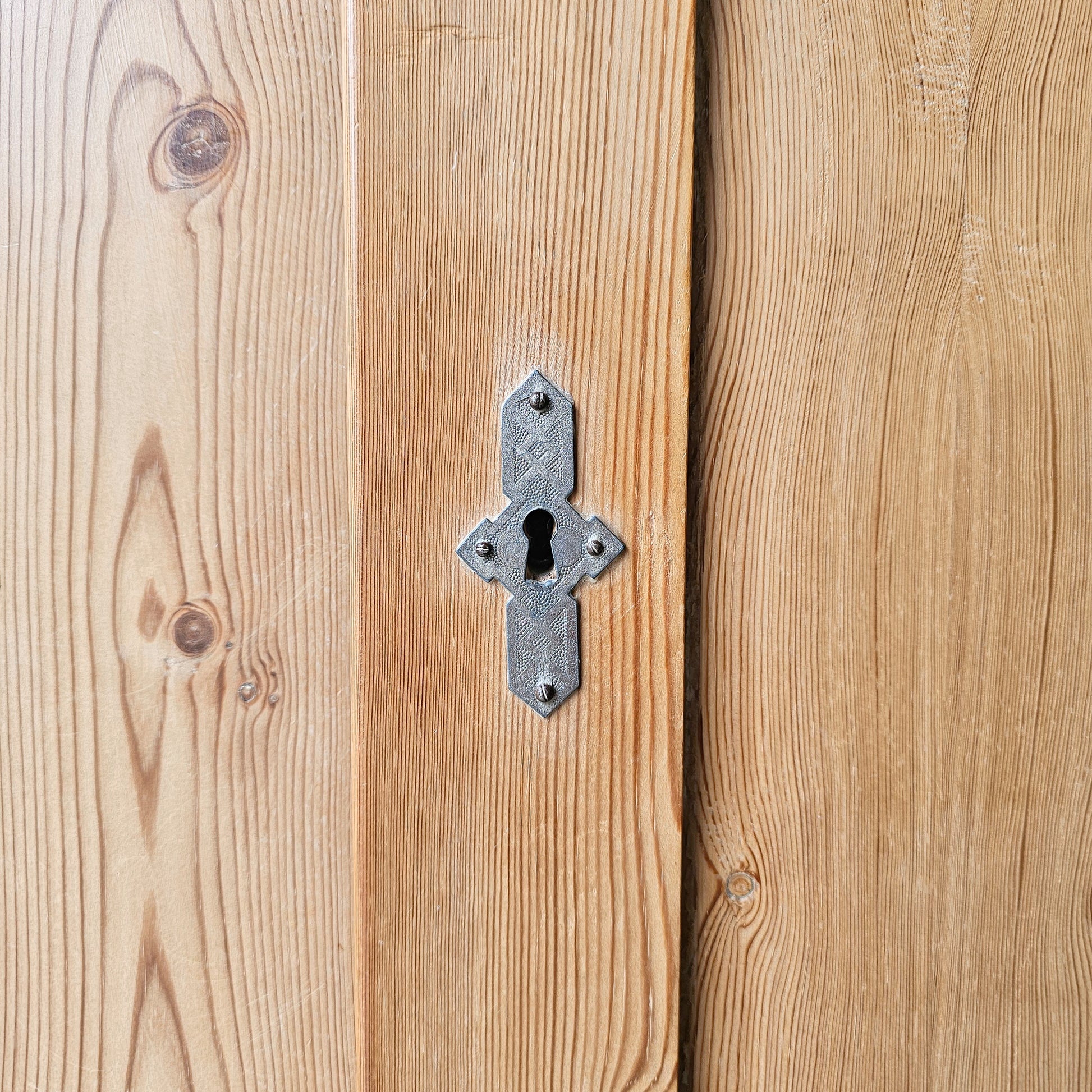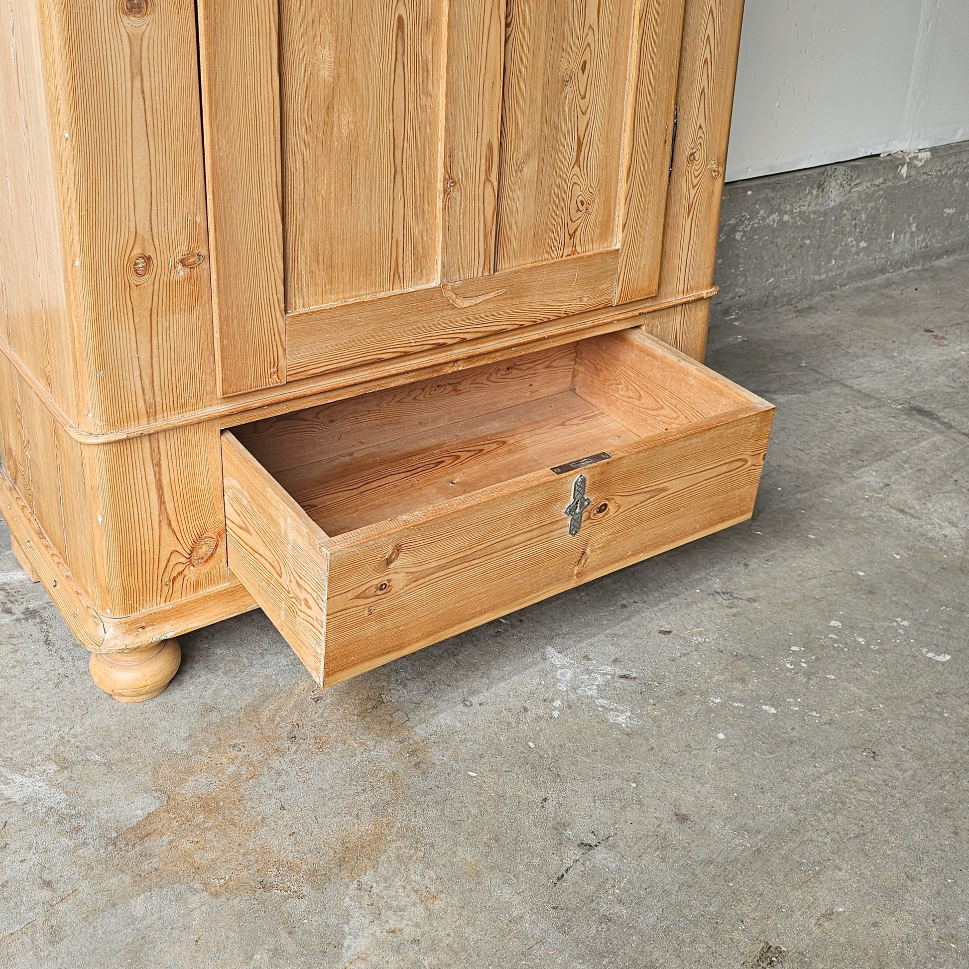 This beautiful early 20th-century armoire is crafted from solid pine wood and exudes timeless character with its natural grain and warm patina. It was imported from England to Portland in 1980. The armoire features three interior shelves that can be adjusted and a lower drawer, offering excellent storage with classic style. A key is included for the bottom drawer; however, there is no key for the main door. Please note, the door has a slight gap when closed — we recommend adding a small magnetic catch to keep it securely shut and prevent it from swinging open.