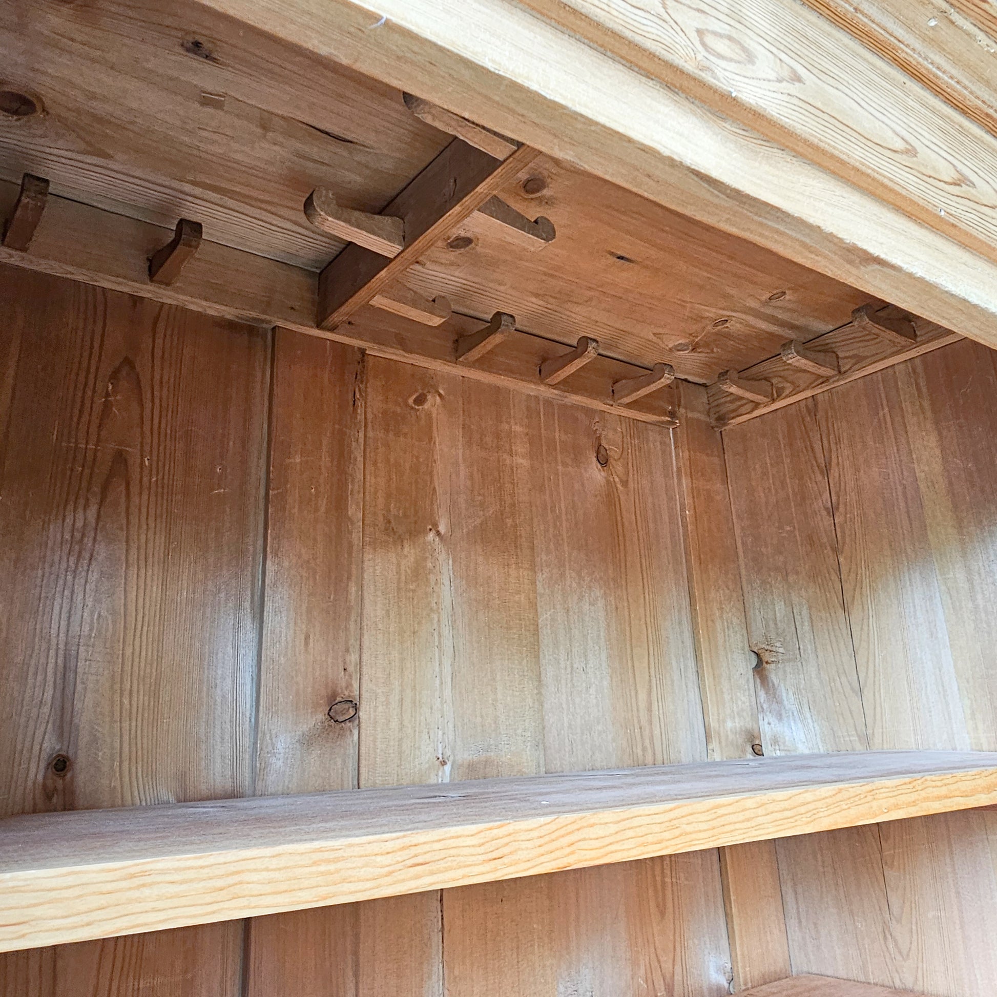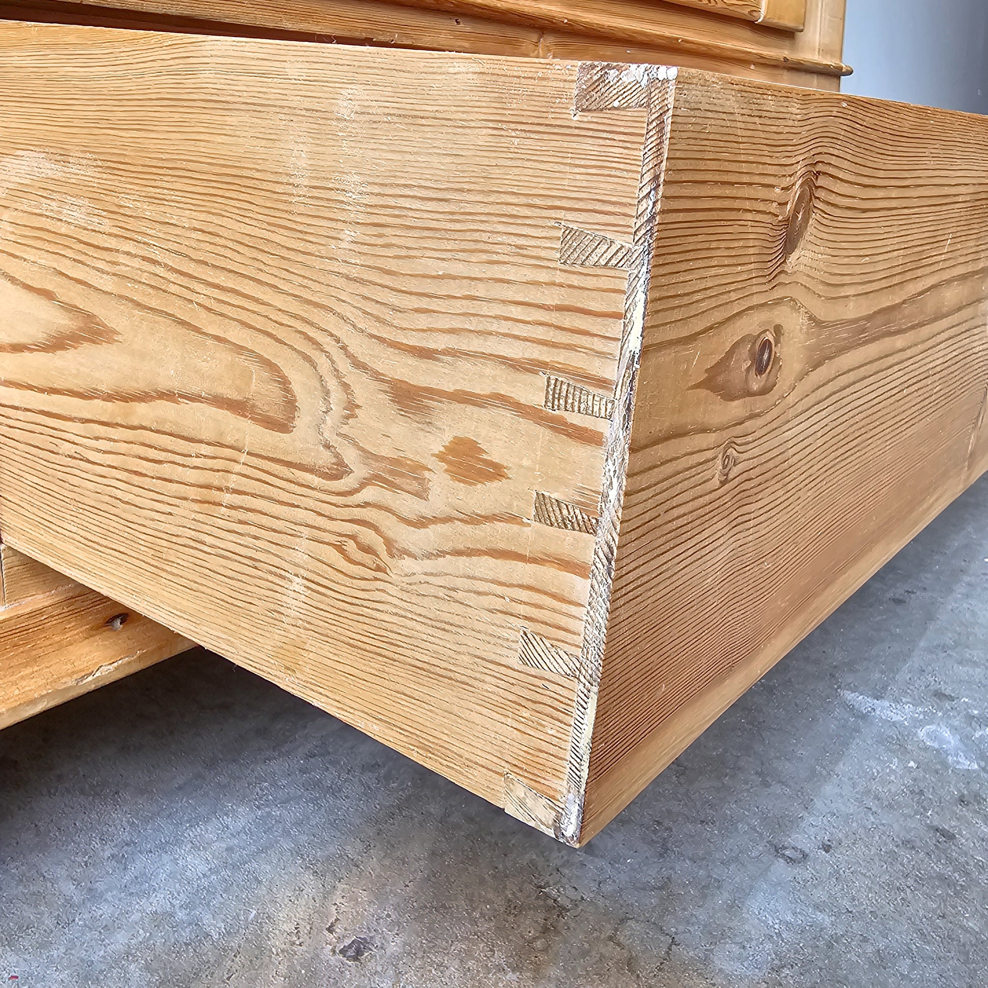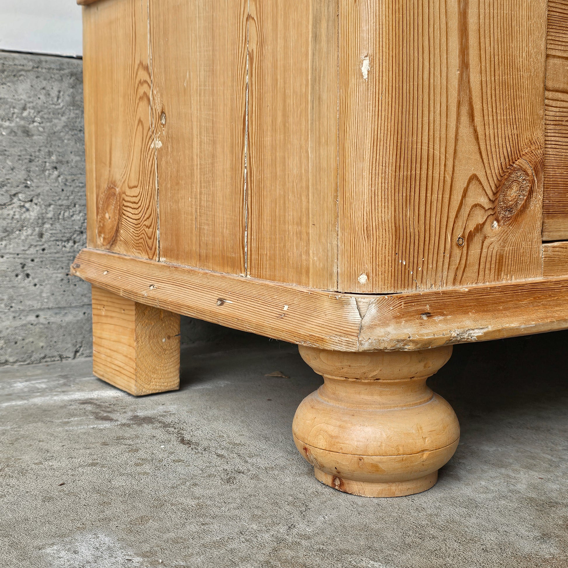 This beautiful early 20th-century armoire is crafted from solid pine wood and exudes timeless character with its natural grain and warm patina. It was imported from England to Portland in 1980. The armoire features three interior shelves that can be adjusted and a lower drawer, offering excellent storage with classic style. A key is included for the bottom drawer; however, there is no key for the main door. Please note, the door has a slight gap when closed — we recommend adding a small magnetic catch to keep it securely shut and prevent it from swinging open.