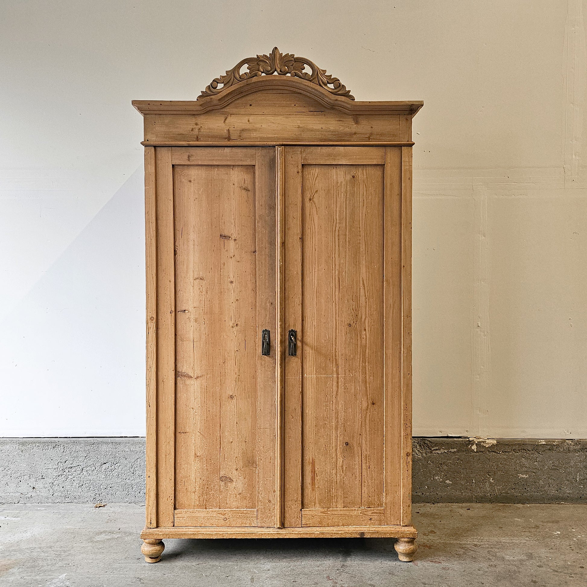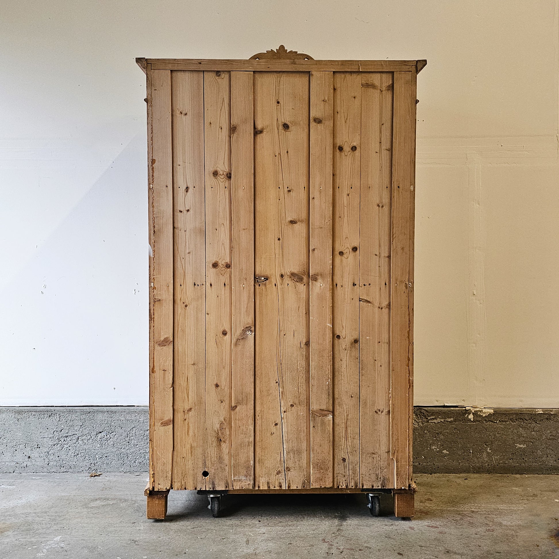Beautiful antique pine wardrobe featuring warm natural tones and classic craftsmanship. The piece includes two stationary upper shelves and one lower shelf that’s removable and adjustable for versatile storage. Inside, a charming small cubby door adds character, this door can be removed easily with a few screws if preferred (note: no key for this interior door).