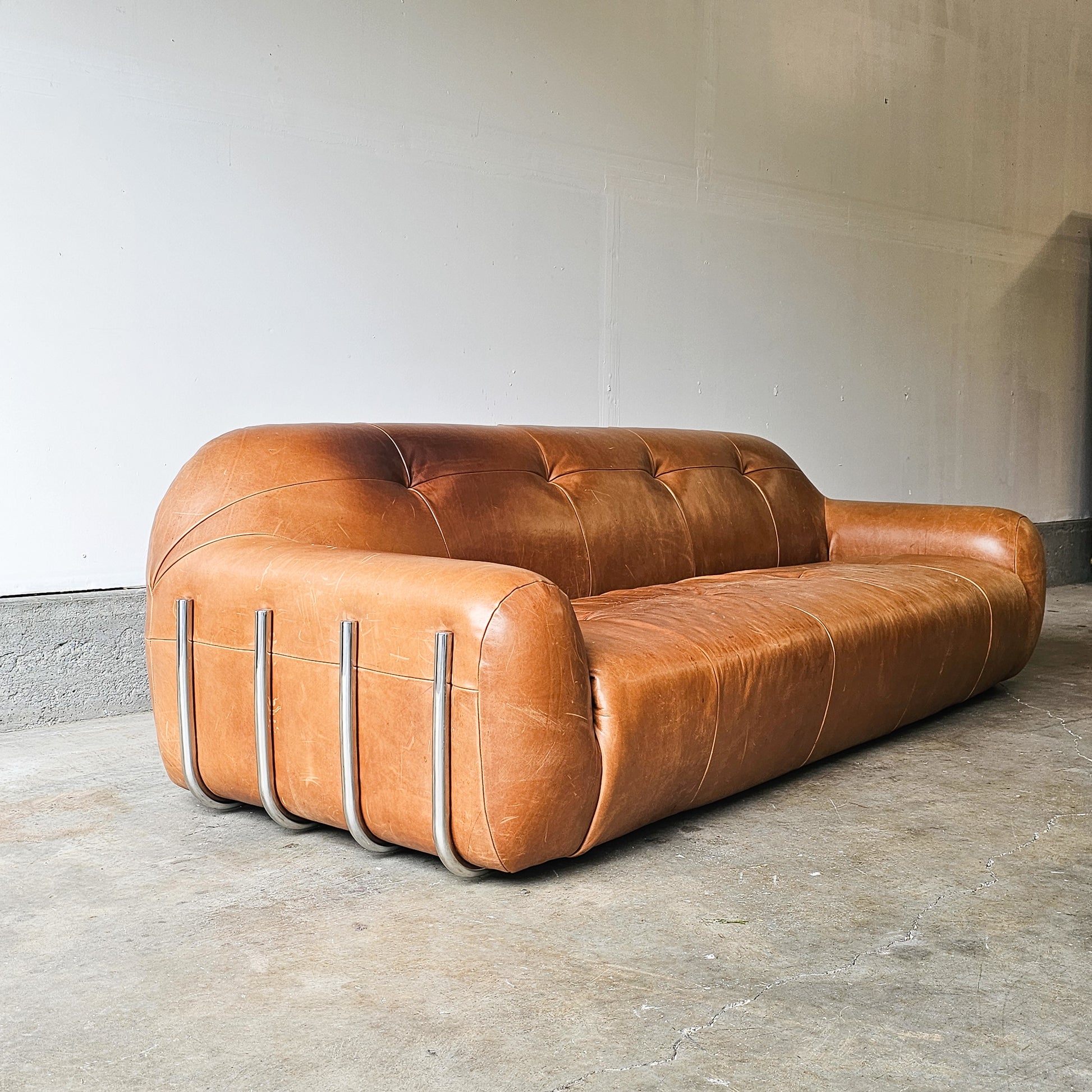 CB2 Chrome Brace Saddle leather tufted sofa-Discontinued Model