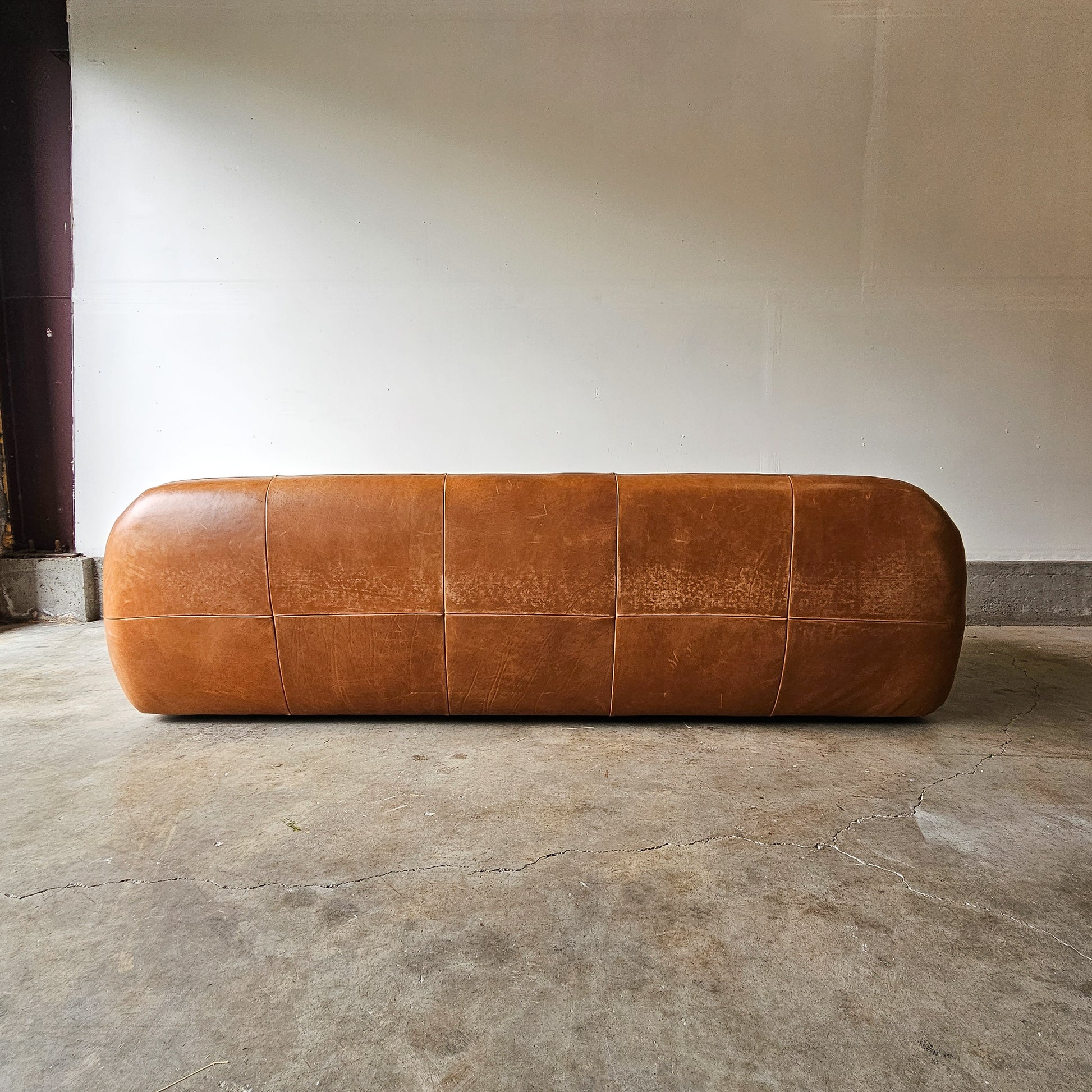 1970s Italian-inspired sofa designed by Jannis Ellenberger makes lounging look vintage. Curvaceous design is wrapped in rich, buttery leather with natural distressing that only adds to the beauty of this piece. Four metal braces add structural detail to each end. Luxe sofa is low, deep and so easy to sink into. CB2 exclusive. (Now discontinued)