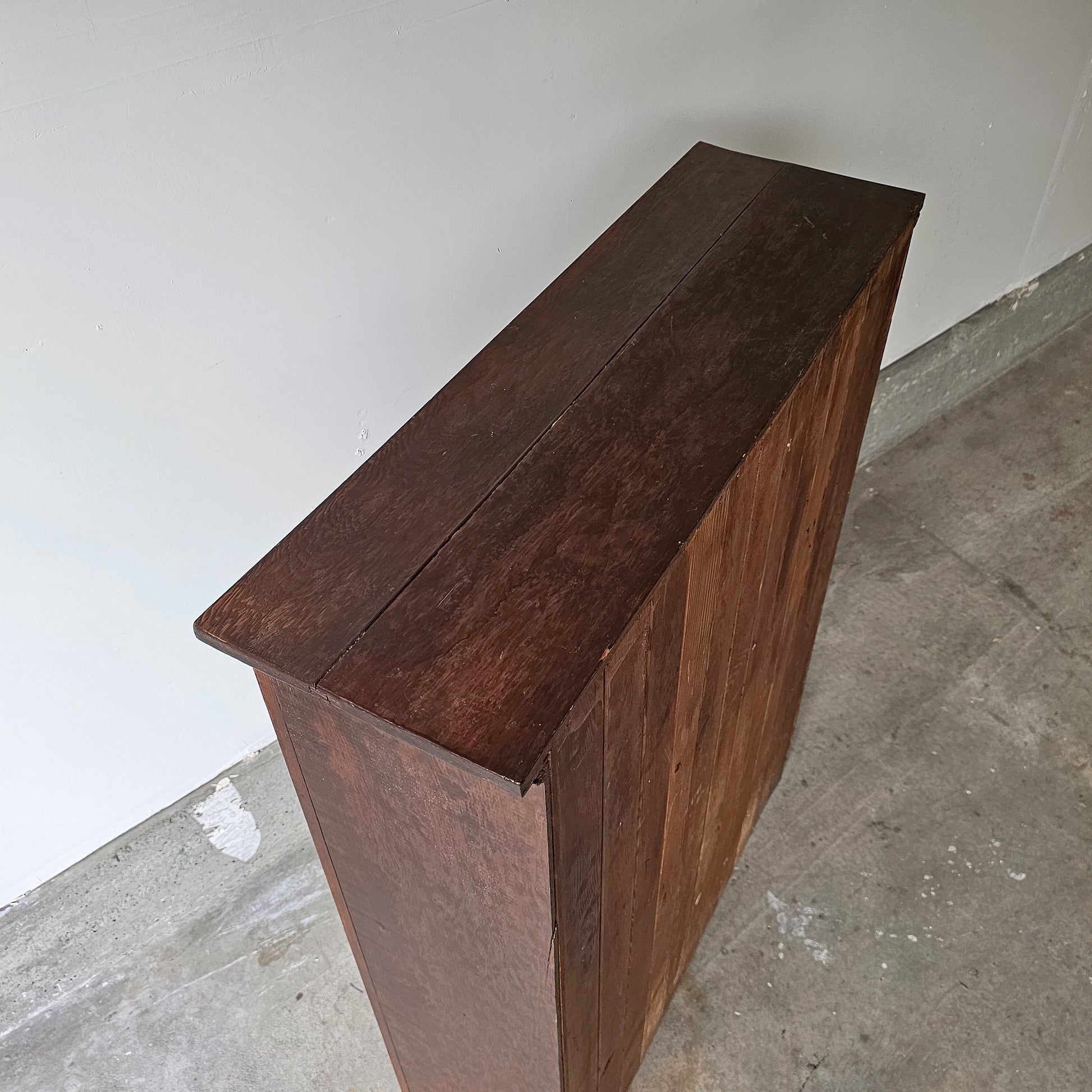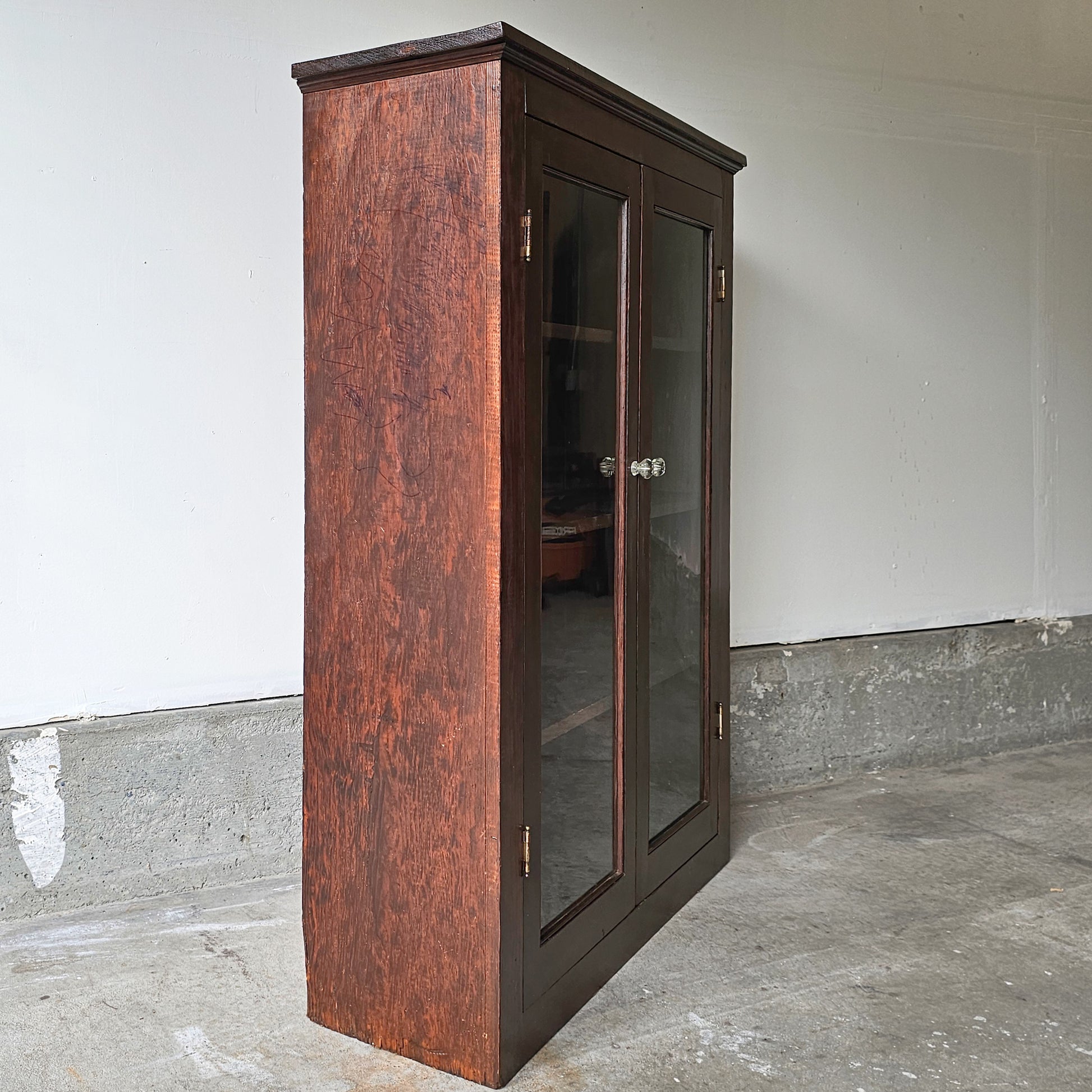 Crafted in the early 1900s, this cabinet is a timeless example of early American craftsmanship. Made from solid wood, possibly pine or fir, with a rich, warm patina, the piece features double glass-front doors that showcase the original wavy glass and charming vintage glass knob handles. The vertical plank back and interior shelves maintain the rustic character of the piece, while the clean lines and sturdy construction.