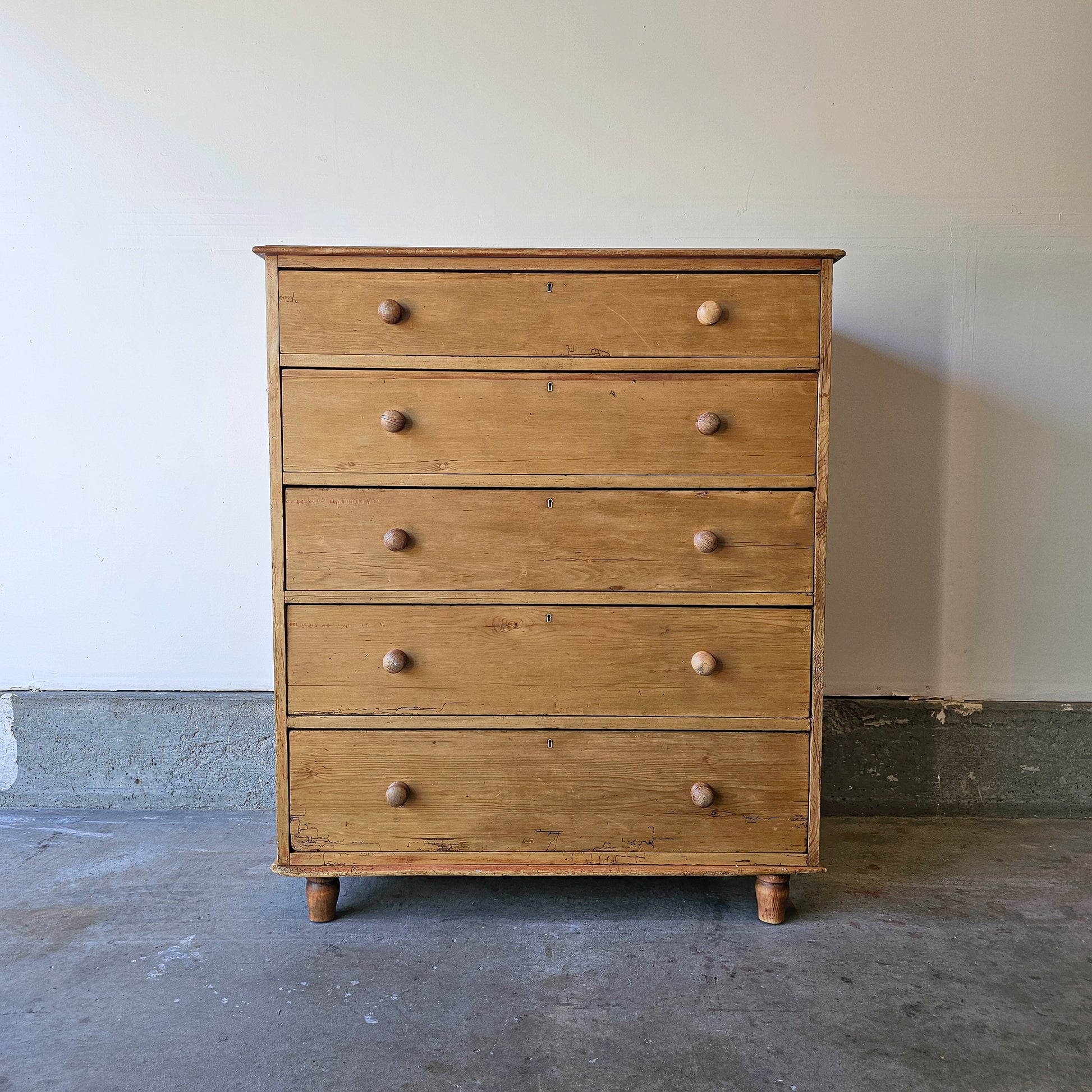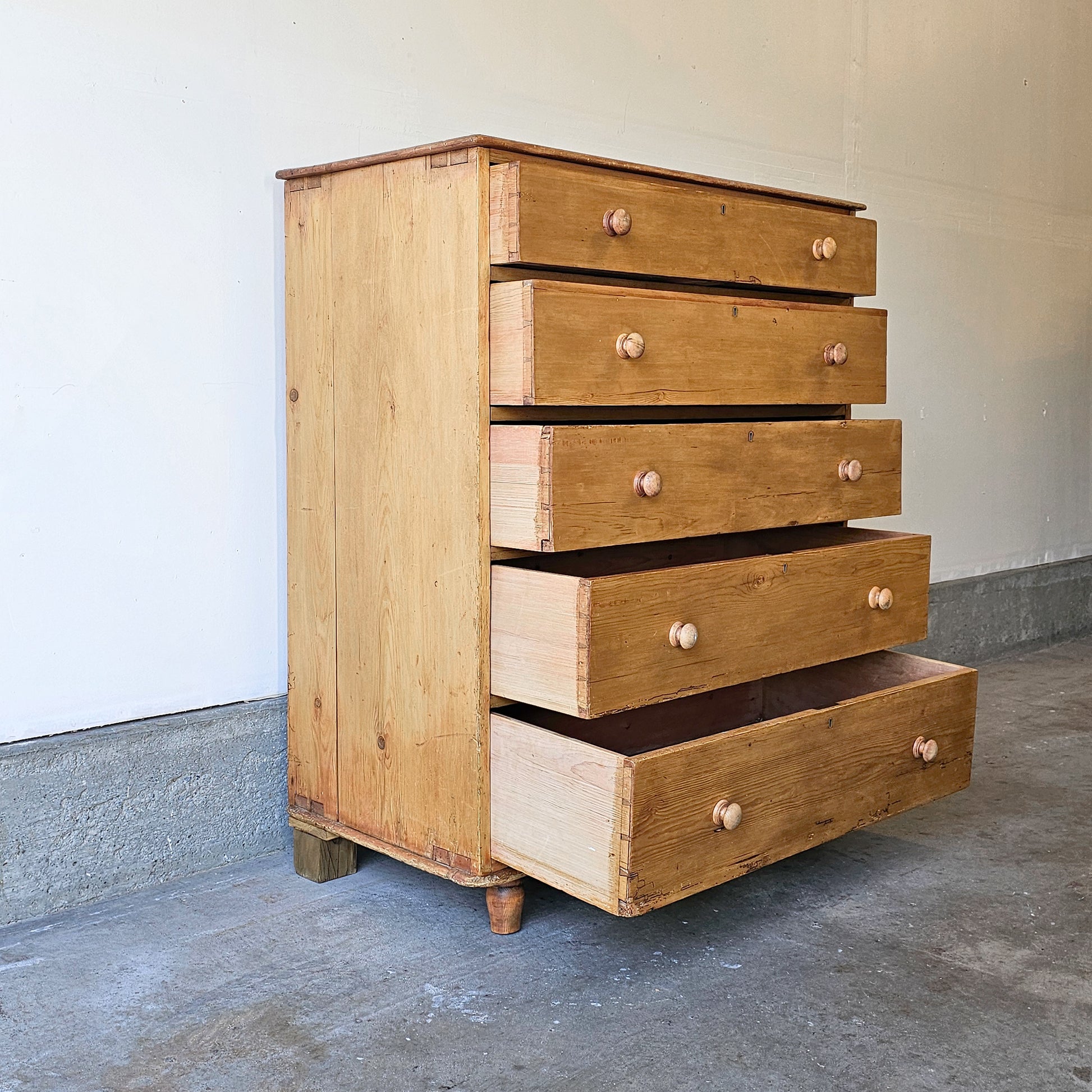 A beautiful example of 19th-century craftsmanship, this antique pine chest of drawers features a warm, timeworn patina that highlights the natural grain and age of the wood. With five spacious drawers and classic wooden knobs, it offers both charm and functionality. The hand-cut dovetails and turned feet suggest an early-to-mid 1800s origin. The back feet are not original to the dresser and are later replacements. It's rare to find a dresser of this size and proportion, making this piece a unique and desirable find for antique lovers and collectors alike.