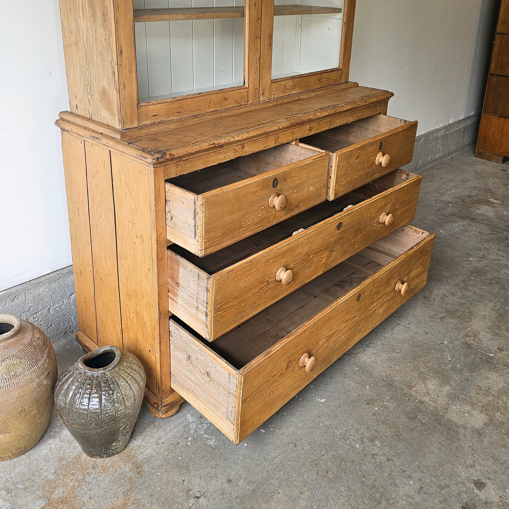 This stunning pine hutch offers both beauty and function. It features a warm, aged patina and is in excellent structural condition with no damage to the glass. The piece separates into two sections for easier transport. Drawers are crafted with dovetail joints, and all doors and drawers open and close properly. While the shelves were designed to be adjustable, the wooden supports have been glued in place over time. Please double-check dimensions before purchase—this is a substantial and impressive piece.