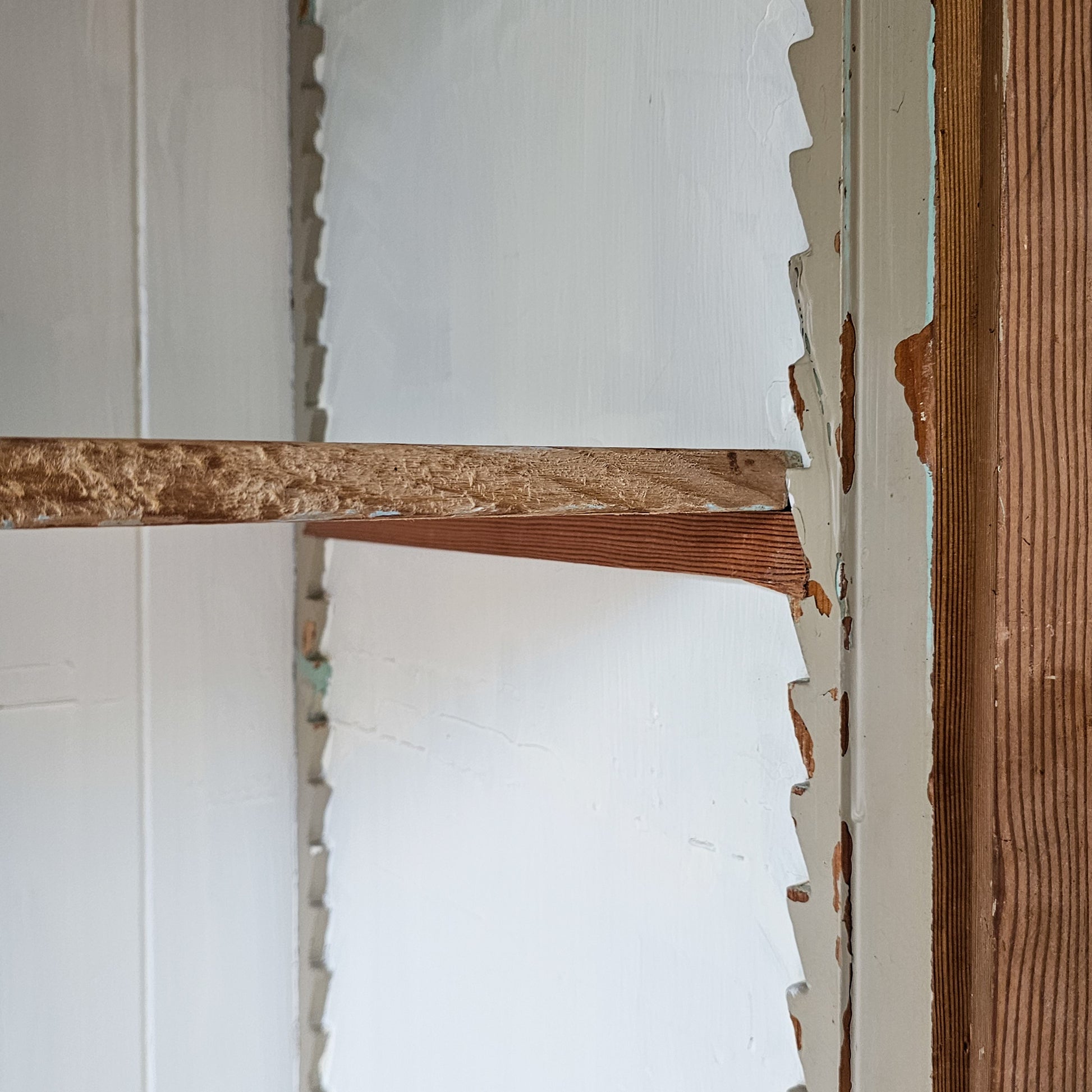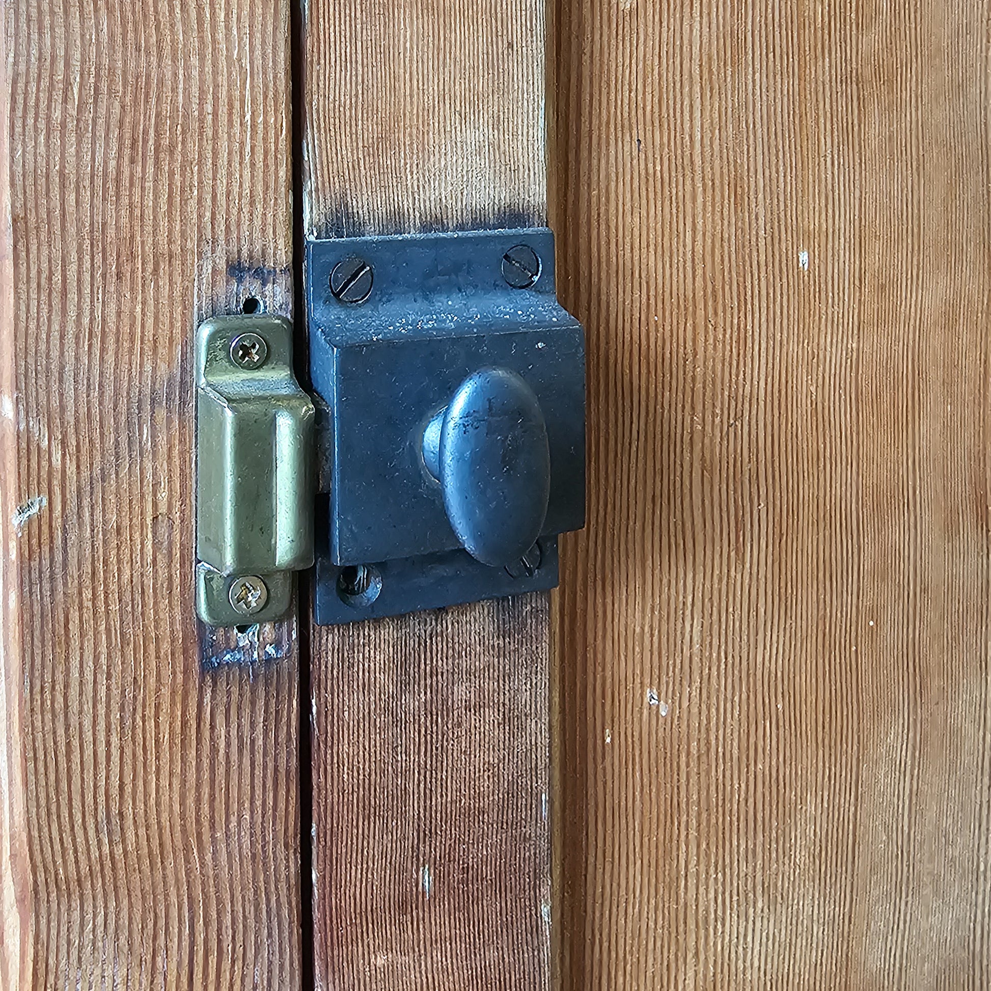 The interior paint is original to how we purchased the cabinet and shows expected scuffs, chips, and wear. There are older layers of paint, with grey and blue paint visible in a few spots. The exterior also has minor areas with residual paint. The bottom door latch is two different metal tones (shown in photo)