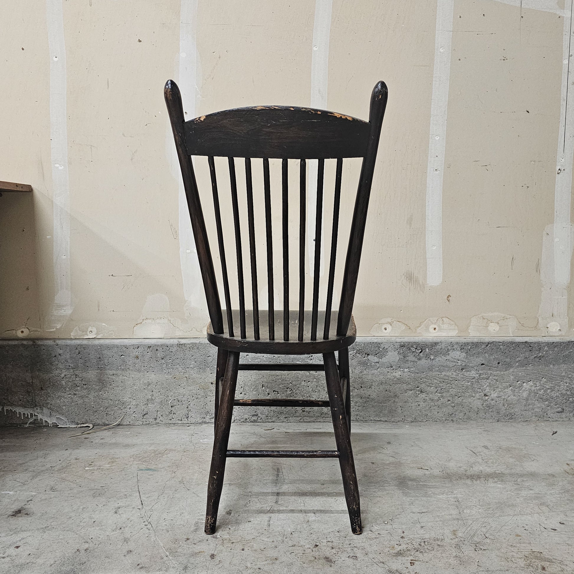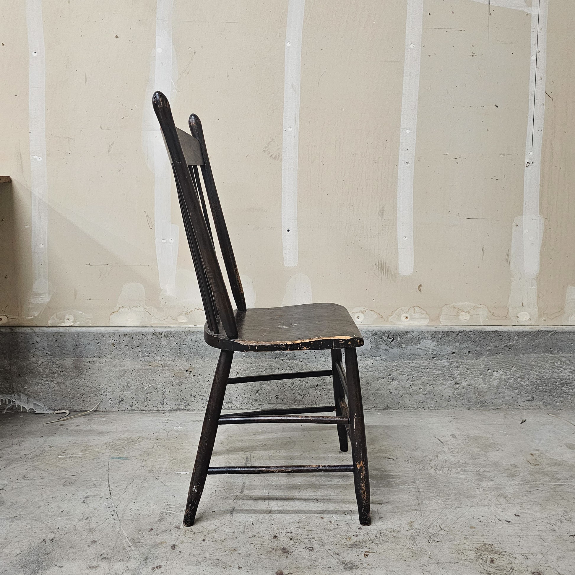 Set of 4 vintage farmhouse spindle-back chairs in a worn finish. These wooden chairs have a classic country style with tall backs and well-loved patina, showing natural age and character. Perfect for use around a dining table, as extra seating, or to add rustic charm to your home décor.