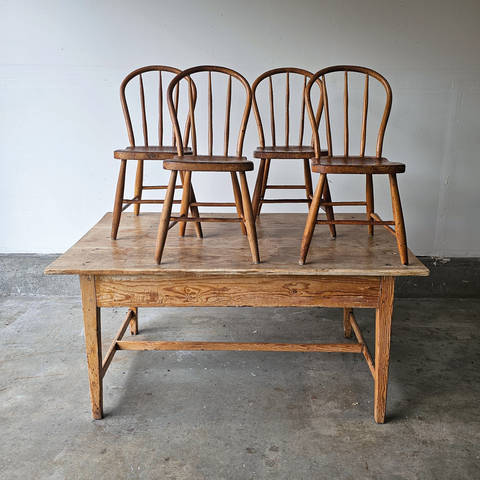 This sturdy, solid pine wood dining table features a single pullout drawer for added storage. With its original finish and beautiful patina, it can seat up to six people. A timeless piece that blends functionality and classic charm, perfect for a variety of spaces and uses.