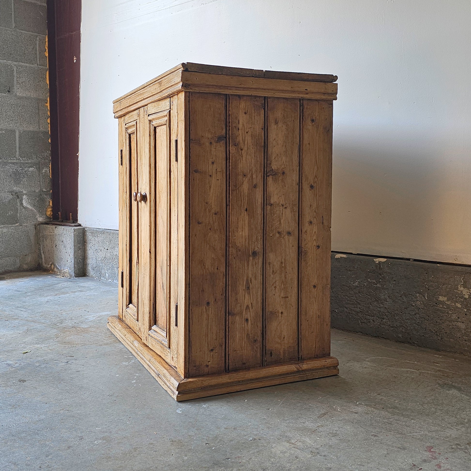 Antique pine cabinet with a warm, naturally aged patina. Likely dating to the late 19th or early 20th century, this petite storage piece features double paneled doors with original wooden knobs and simple molding along the top and base. The interior shelf if removable, not adjustablein height. A versatile size, perfect for use as a side cabinet, entryway piece, or accent storage in any room.