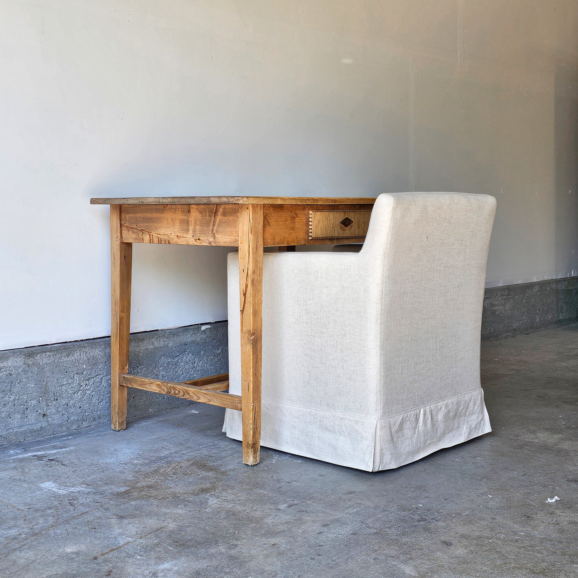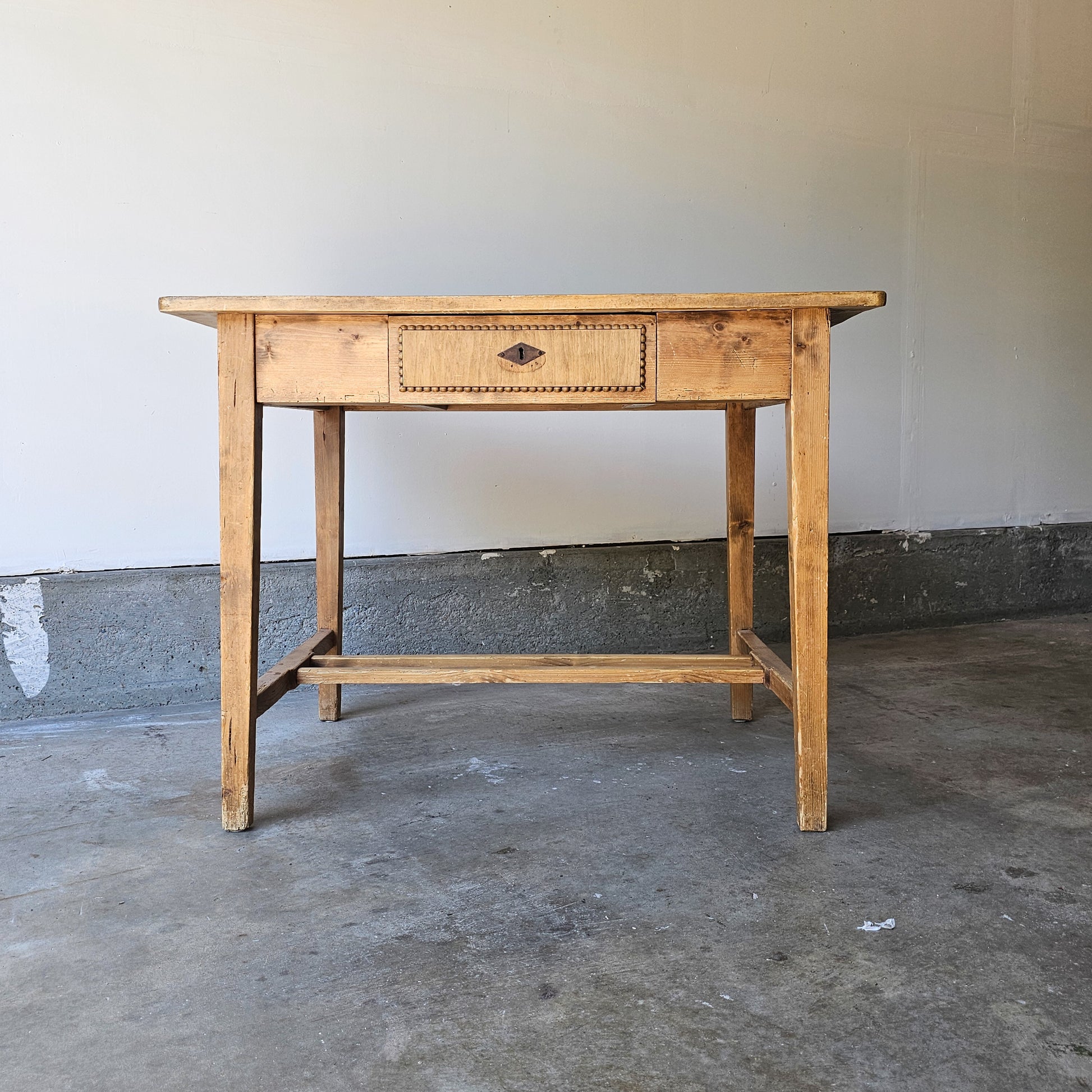 A charming early 20th-century pine writing table featuring warm, honey-toned wood and beautifully aged character throughout. This piece offers a simple yet elegant design with tapered legs, a stretcher base for added stability, and a single center drawer adorned with beaded trim and an old keyhole (key not included). Its compact size makes it a versatile piece, perfect as a writing desk, entry table, or accent table. Signs of age and use, including wear on the legs and surface, contribute to its authentic antique appeal.