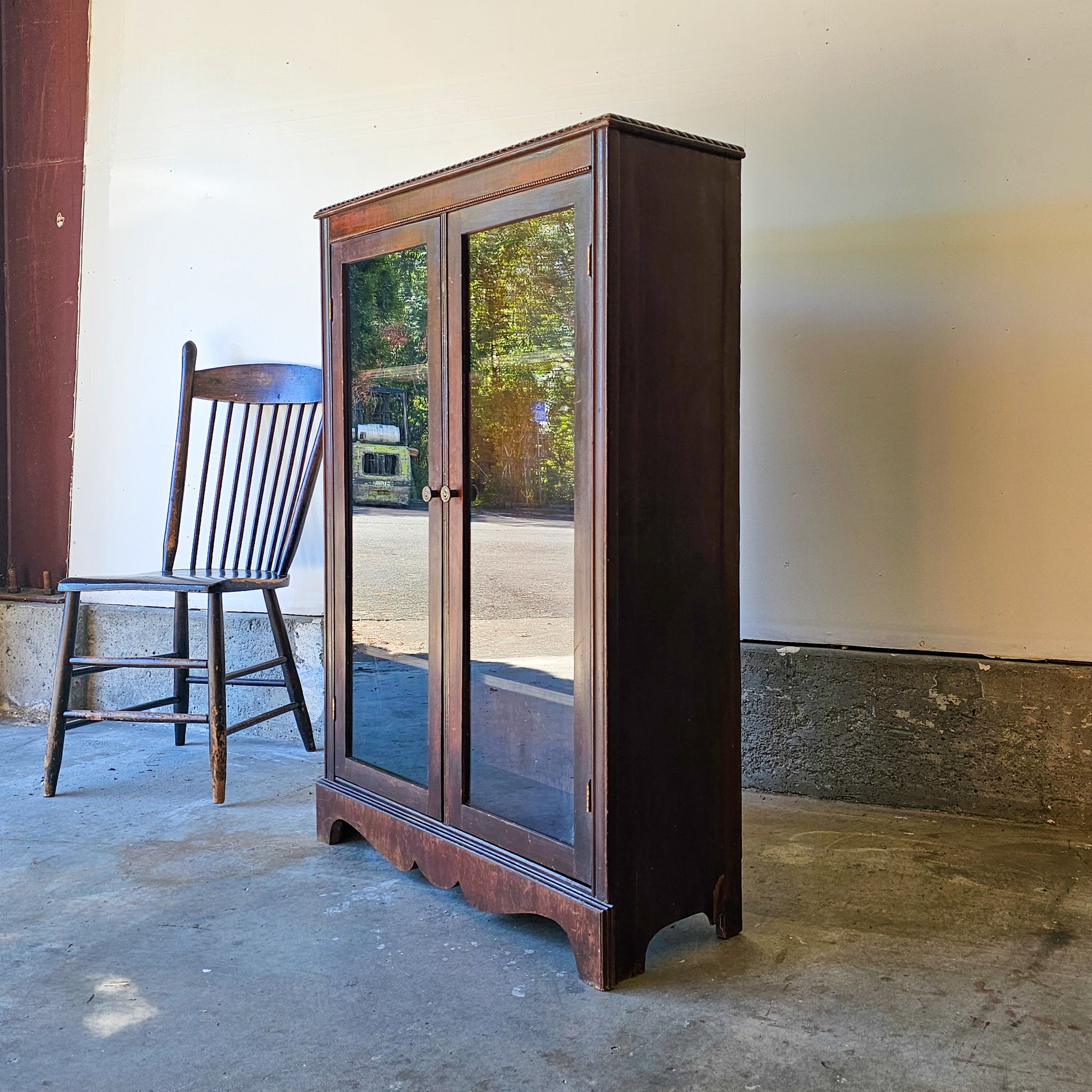Vintage Mahogany Glass-Front Cabinet. Features double glass doors, fixed shelves, and original brass knobs. A versatile piece, perfect for storing or displaying books, china, or collectibles. The cabinet rests on a shaped apron base, giving it a refined yet timeless silhouette. The right side of the cabinet has a small piece of wood missing (shown in photos).