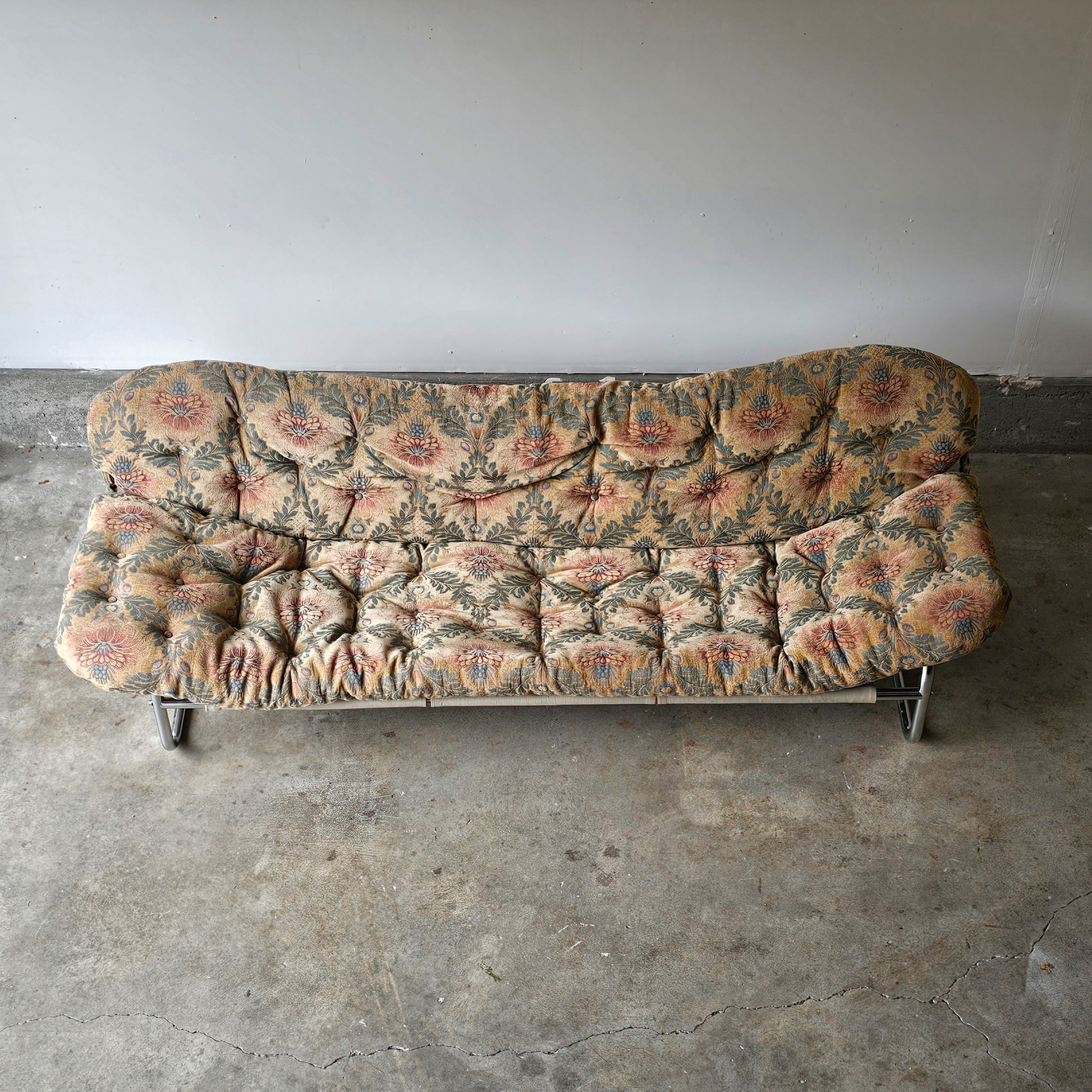 Rare and iconic 1970s sofa designed by Johan Bertil Häggström for IKEA. This piece perfectly captures the laid-back, organic style of Scandinavian modern design, featuring a tubular chrome frame with a relaxed sling base and plush tufted cushions in a retro floral upholstery.