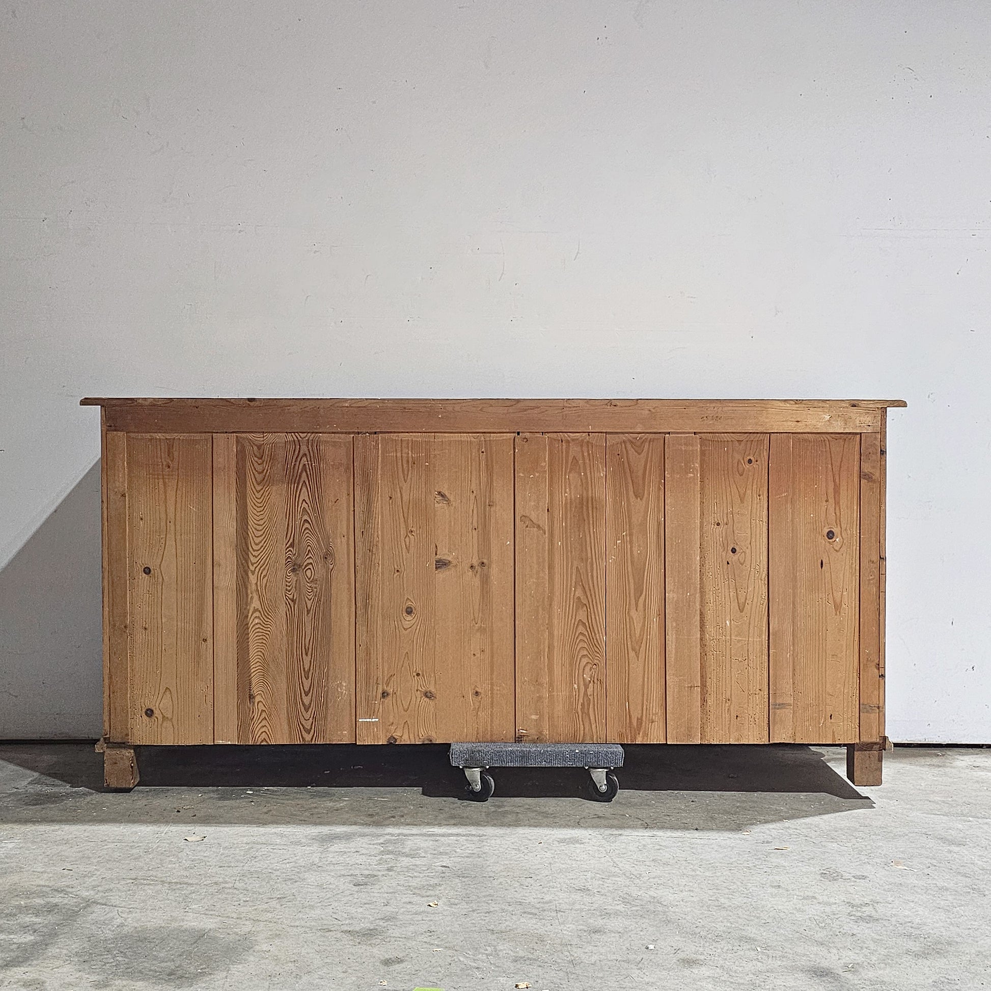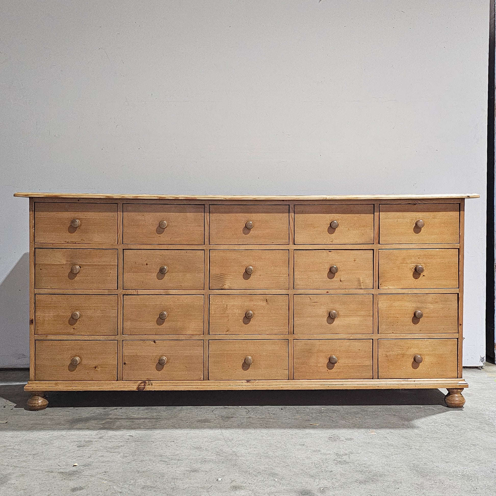 A striking vintage pine apothecary-style chest, defined by its long, low proportions and an abundance of small drawers. Crafted in solid pine, this substantial piece features a grid of hand-built drawers, each fitted with simple wooden knobs, creating a beautifully rhythmic façade rooted in utilitarian design. Circa 1930