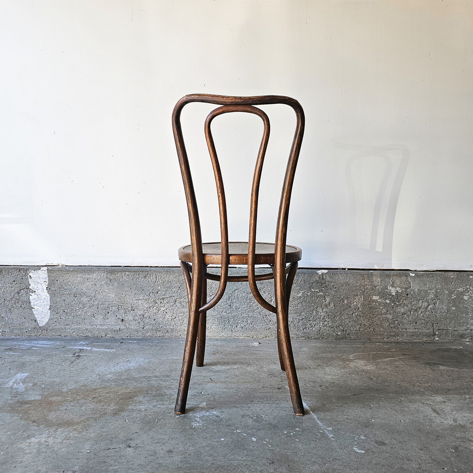 All six chairs are structurally sound with sturdy joints, showing wear consistent with age and use that adds to their authentic vintage character. Perfect for a farmhouse dining table, café-inspired kitchen, or as accent seating.