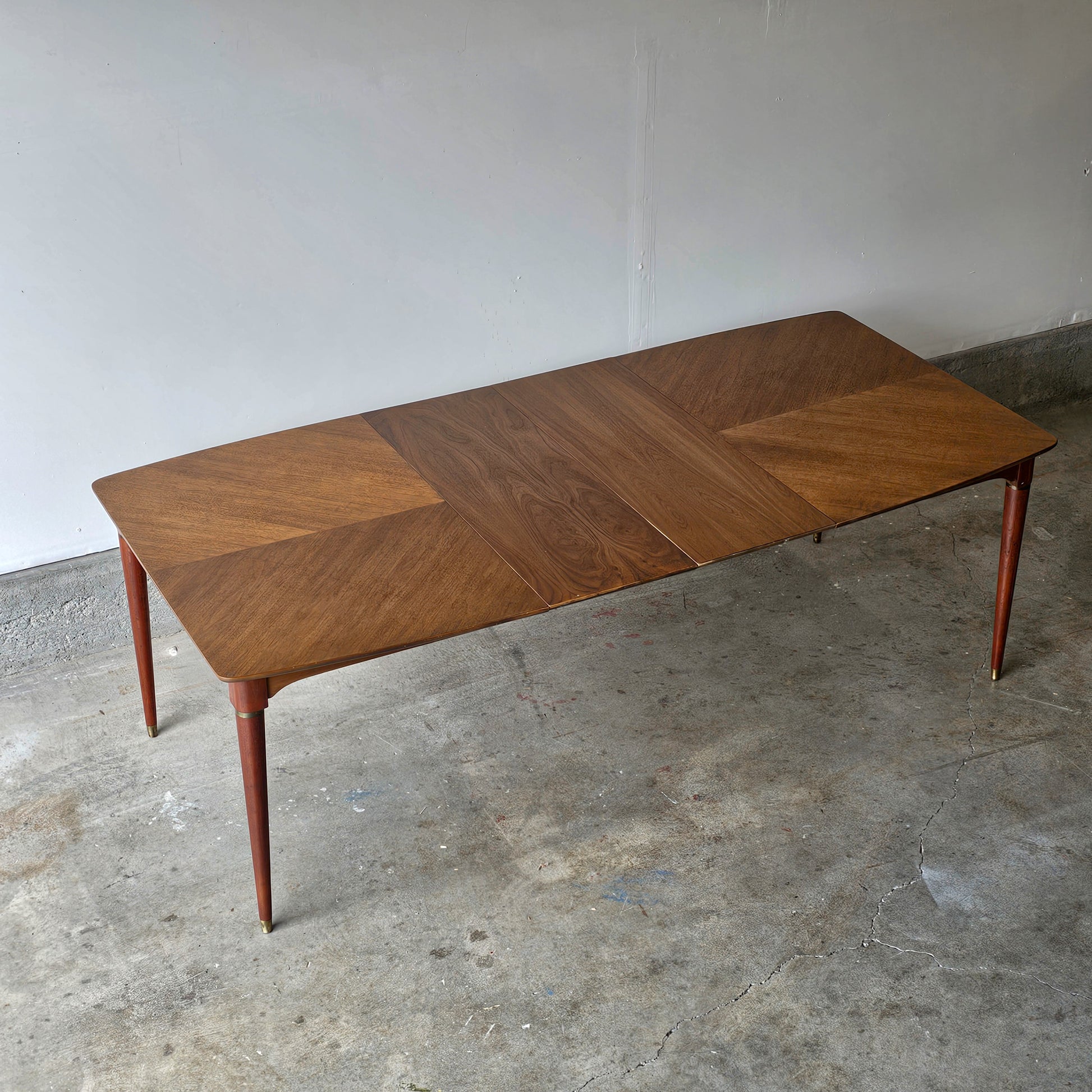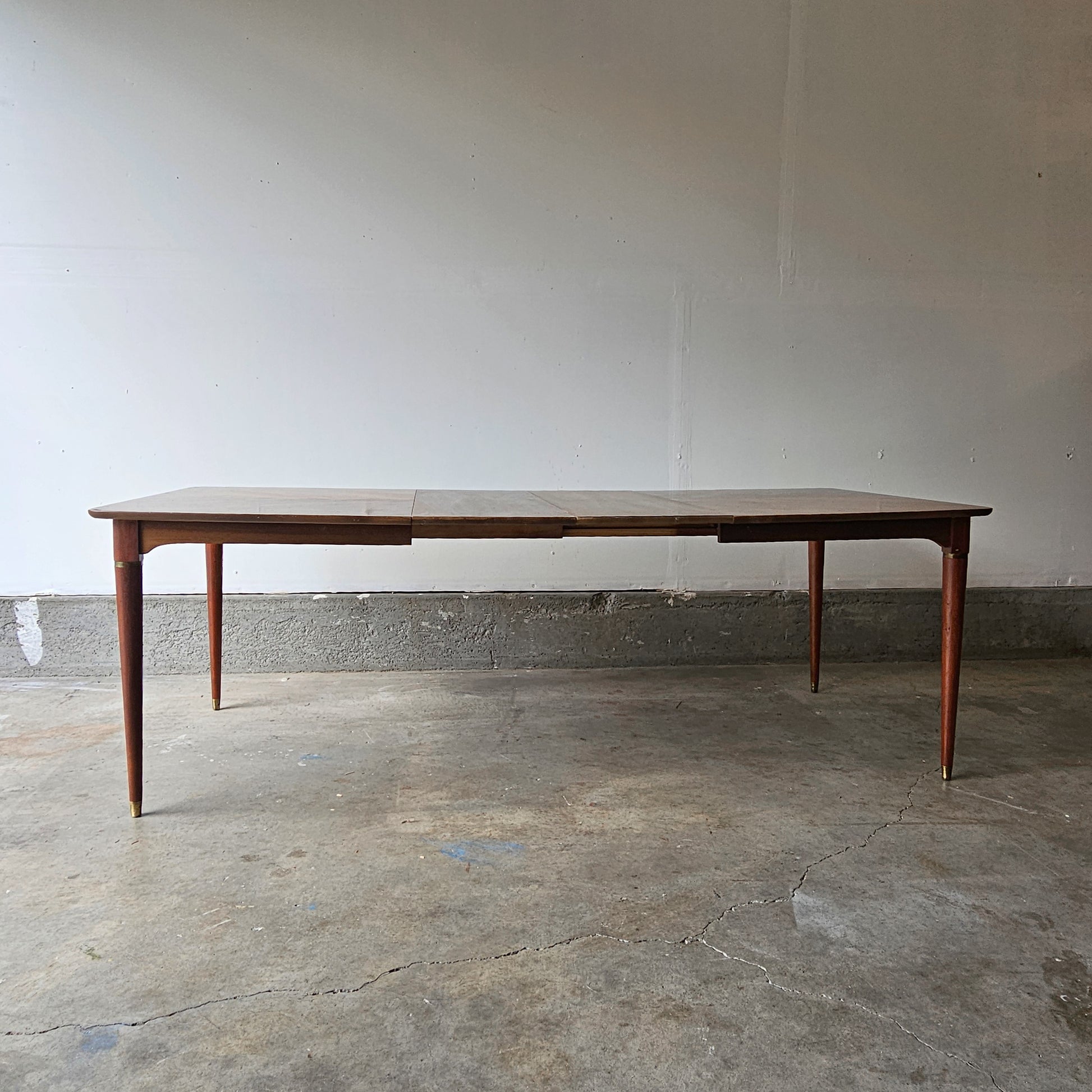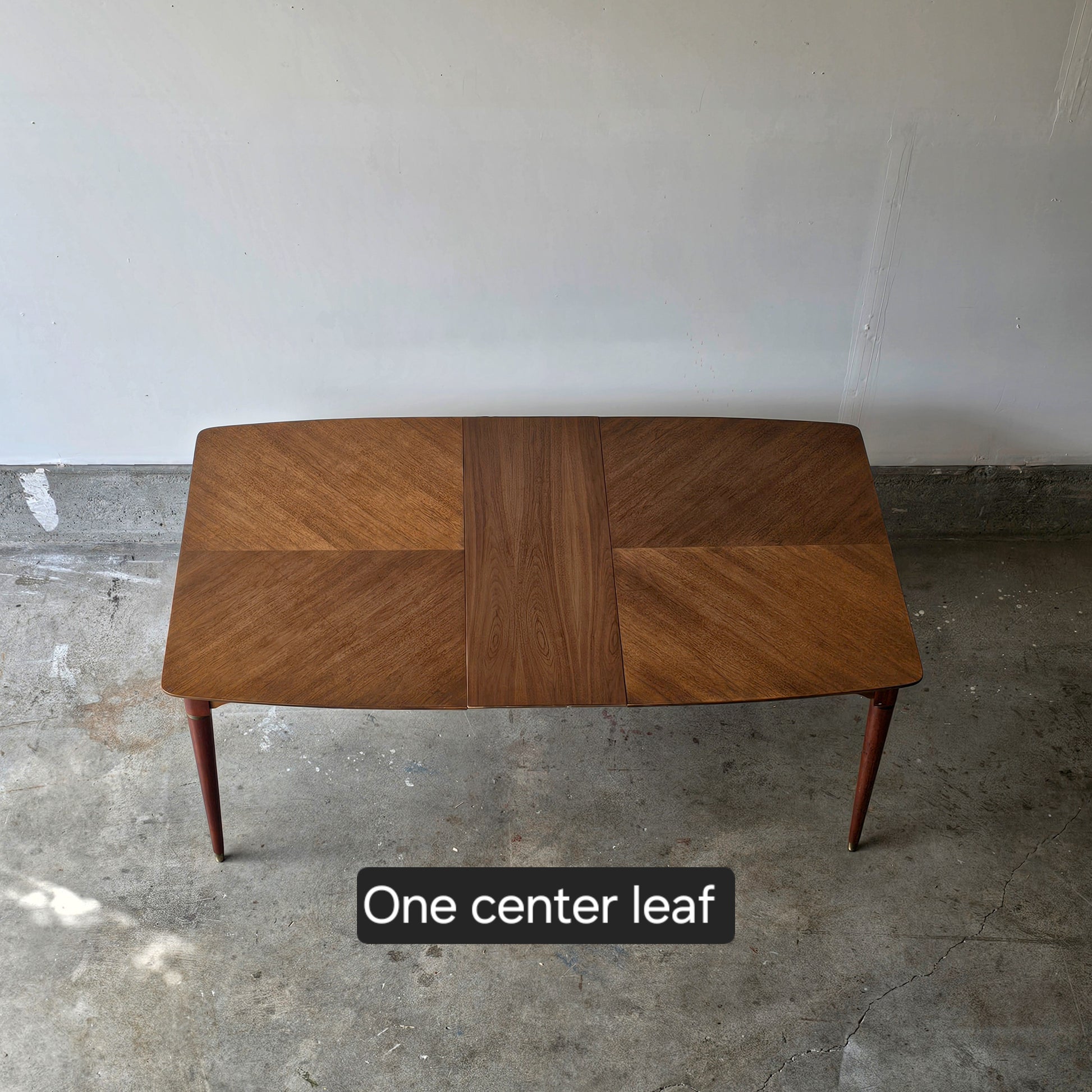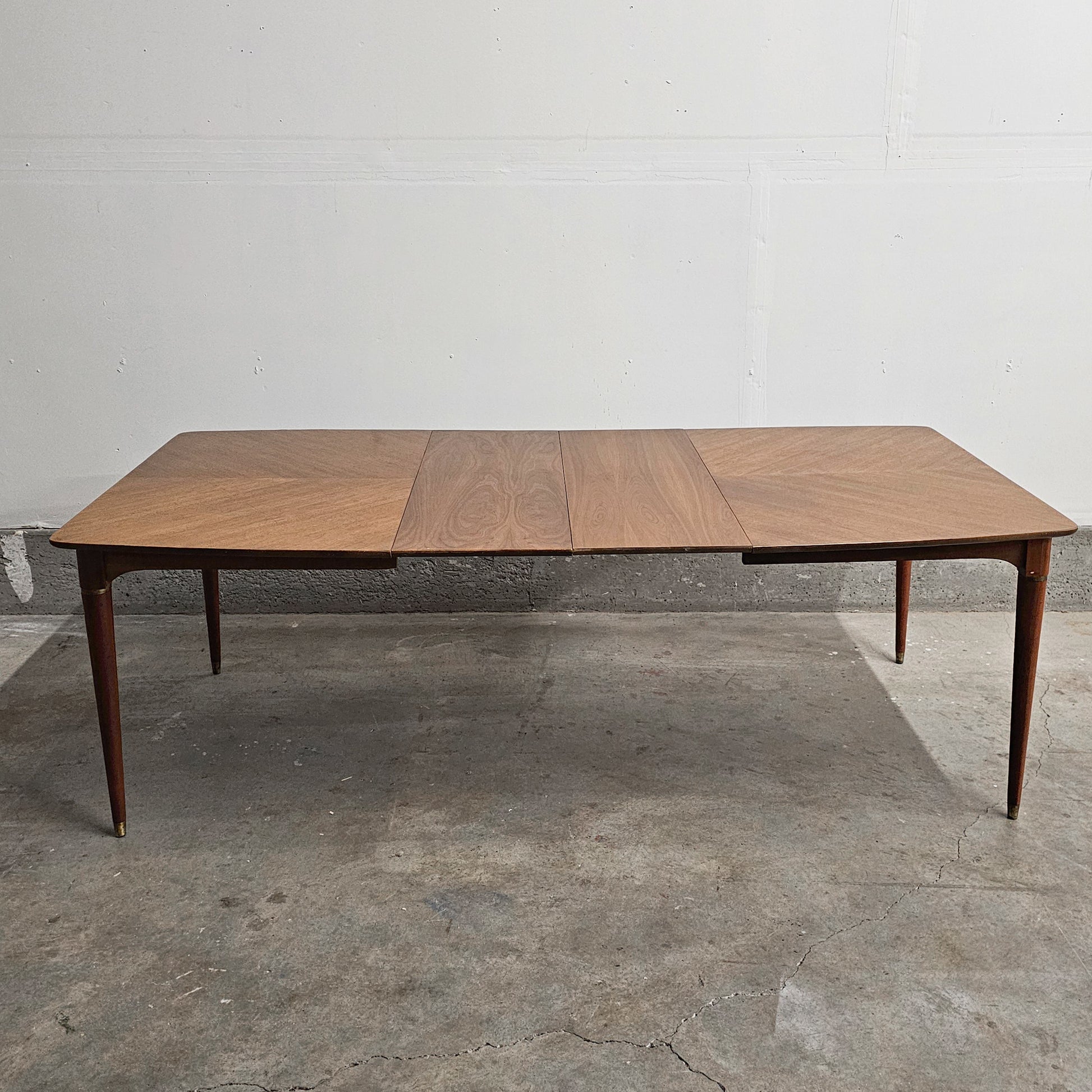Mid-Century Modern dining table manufactured by B.P. John, a furniture company known for its solid wood pieces, particularly active in the 1960s and 1970s and based in Portland, OR. The table has walnut wood legs with a walnut veneer top.