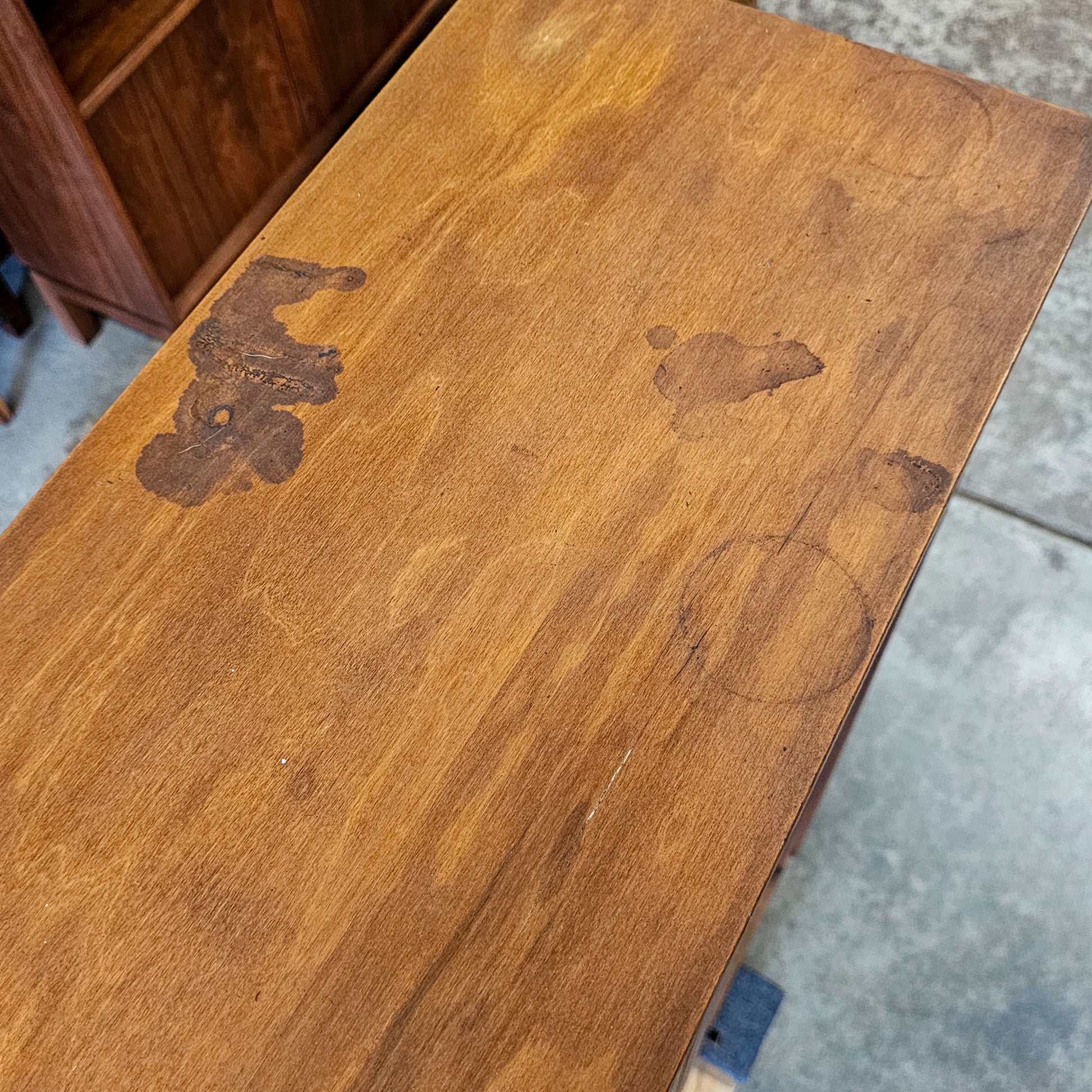 A beautifully crafted mid-century modern walnut china cabinet with classic lines and rich wood grain. The upper section features three glass-front panels: the two side doors open to reveal shelving, while the center glass panel is fixed for display only. Inside, the center shelf is stationary for stability, while the upper and lower shelves are adjustable, allowing you to customize the display to your needs. This cabinet is two pieces. The top half of the cabinet has some staining on the top portion (shown in the photos).