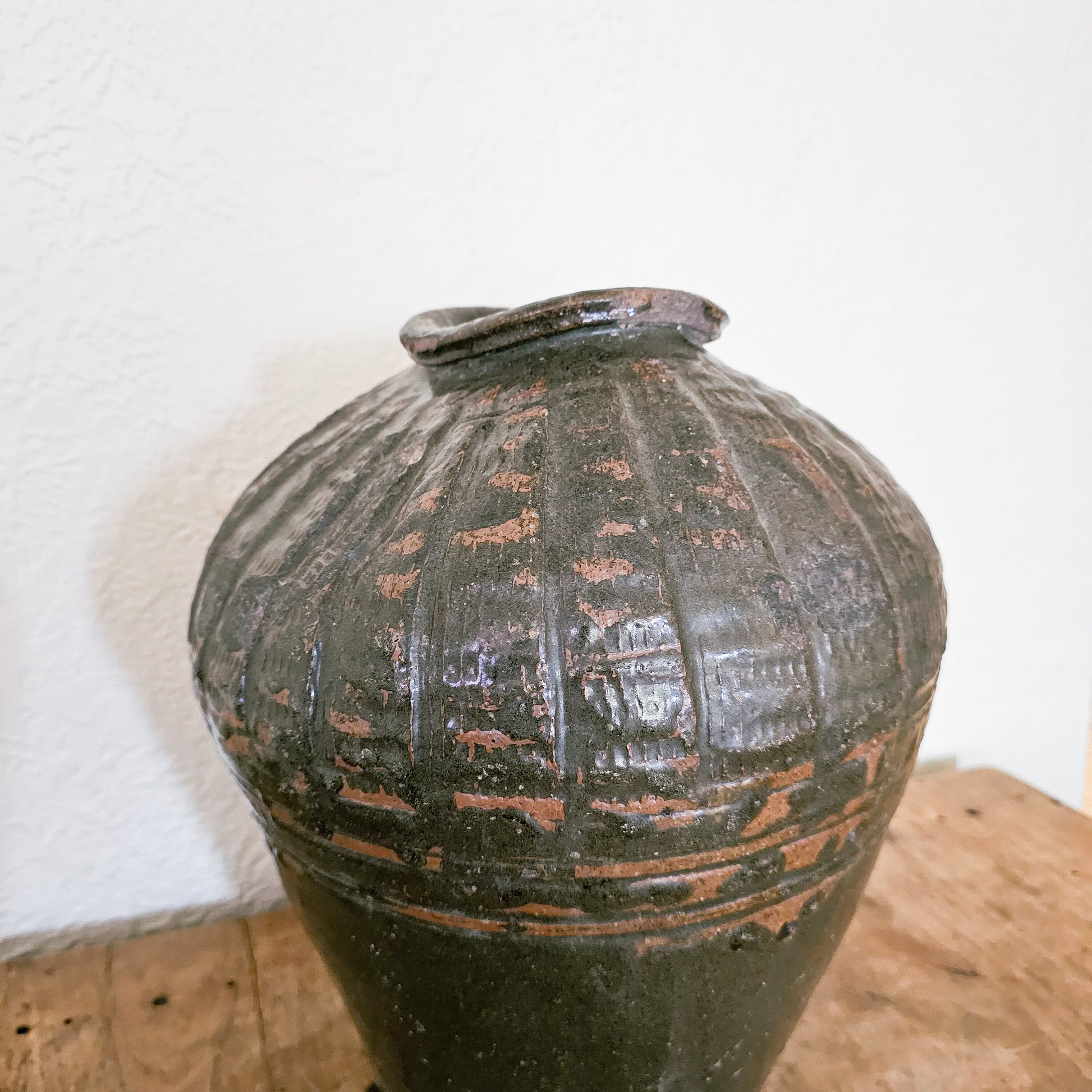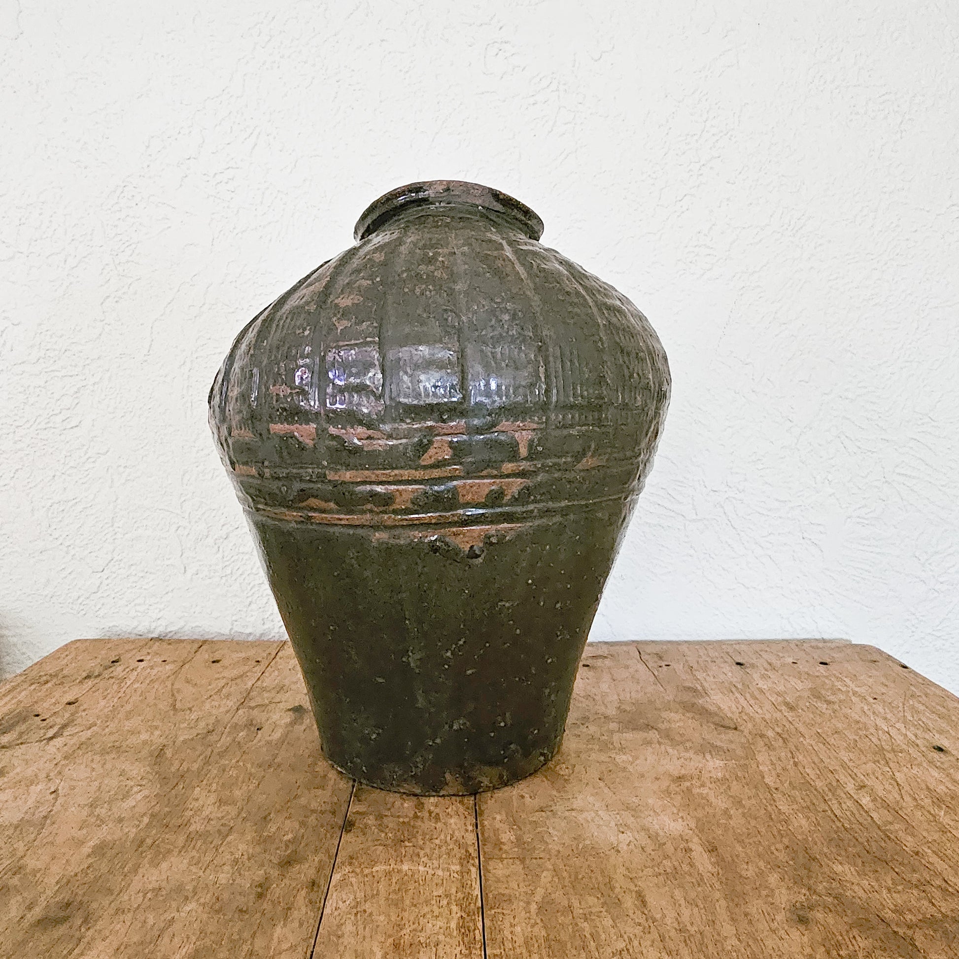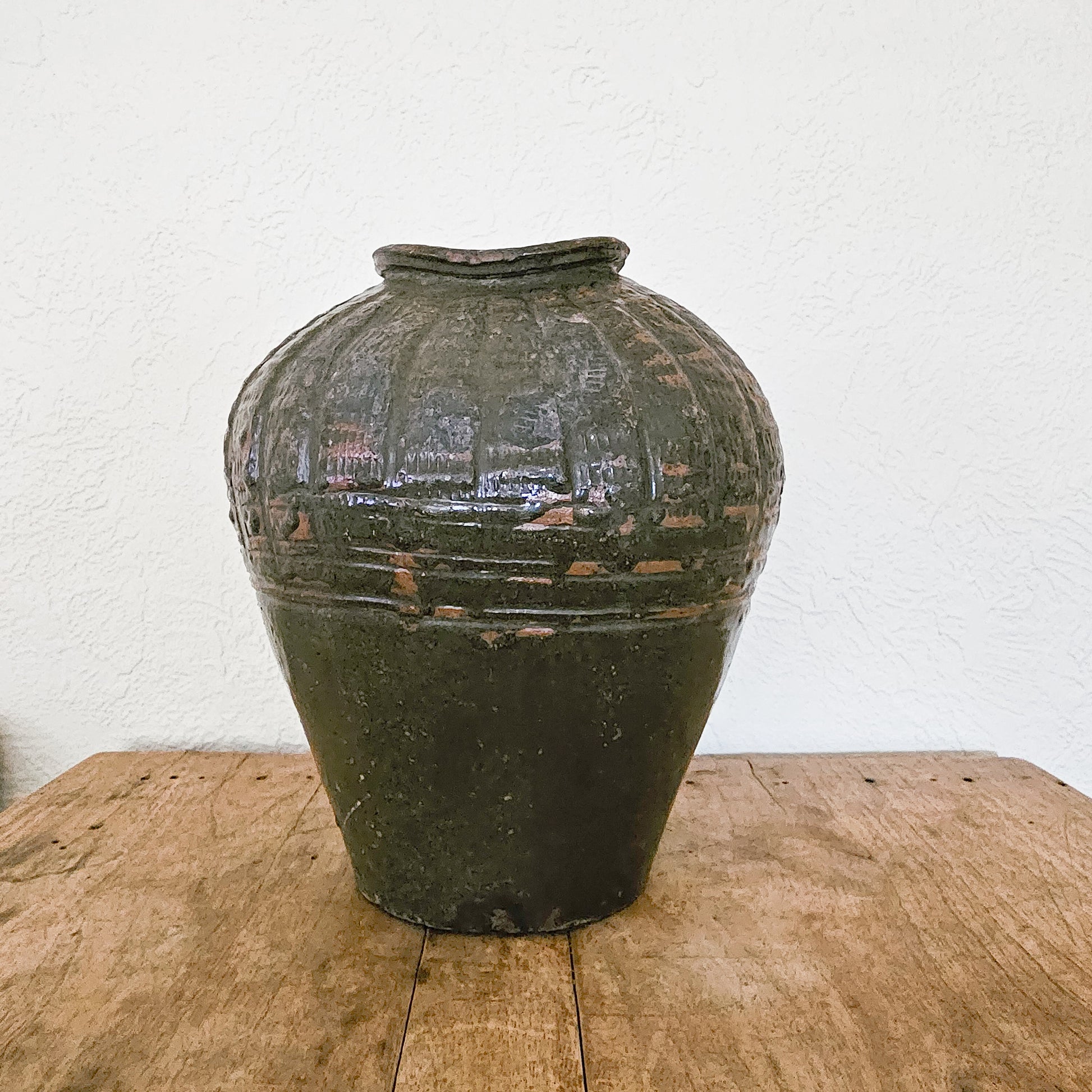 These vintage rice wine jars were used as part of the rice wine aging process. Each one is uniquely shaped and marked. While it makes a statement on its own, it’s also stunning filled with bold blooms or flowering branches.
