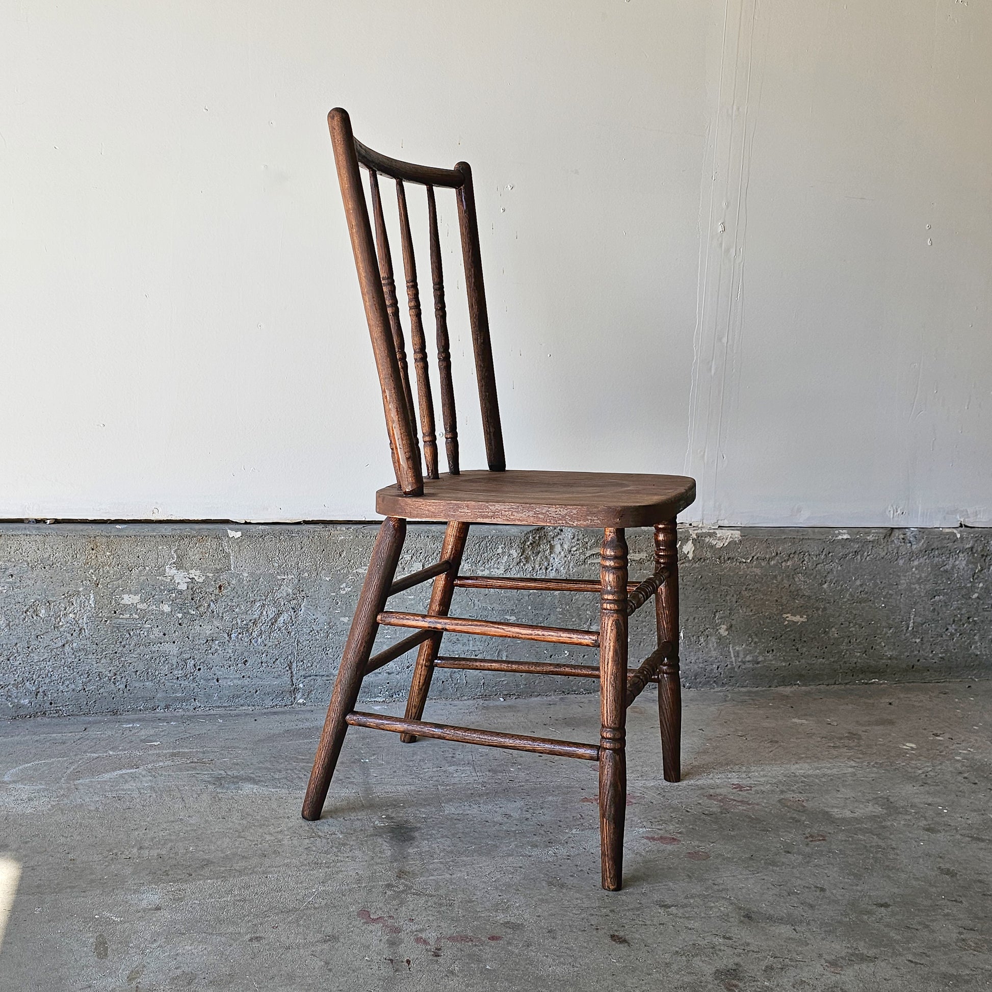Vintage wooden chairs featuring a classic spindle-back design and turned legs with stretcher supports. Solid and sturdy with age-appropriate wear that adds character.
